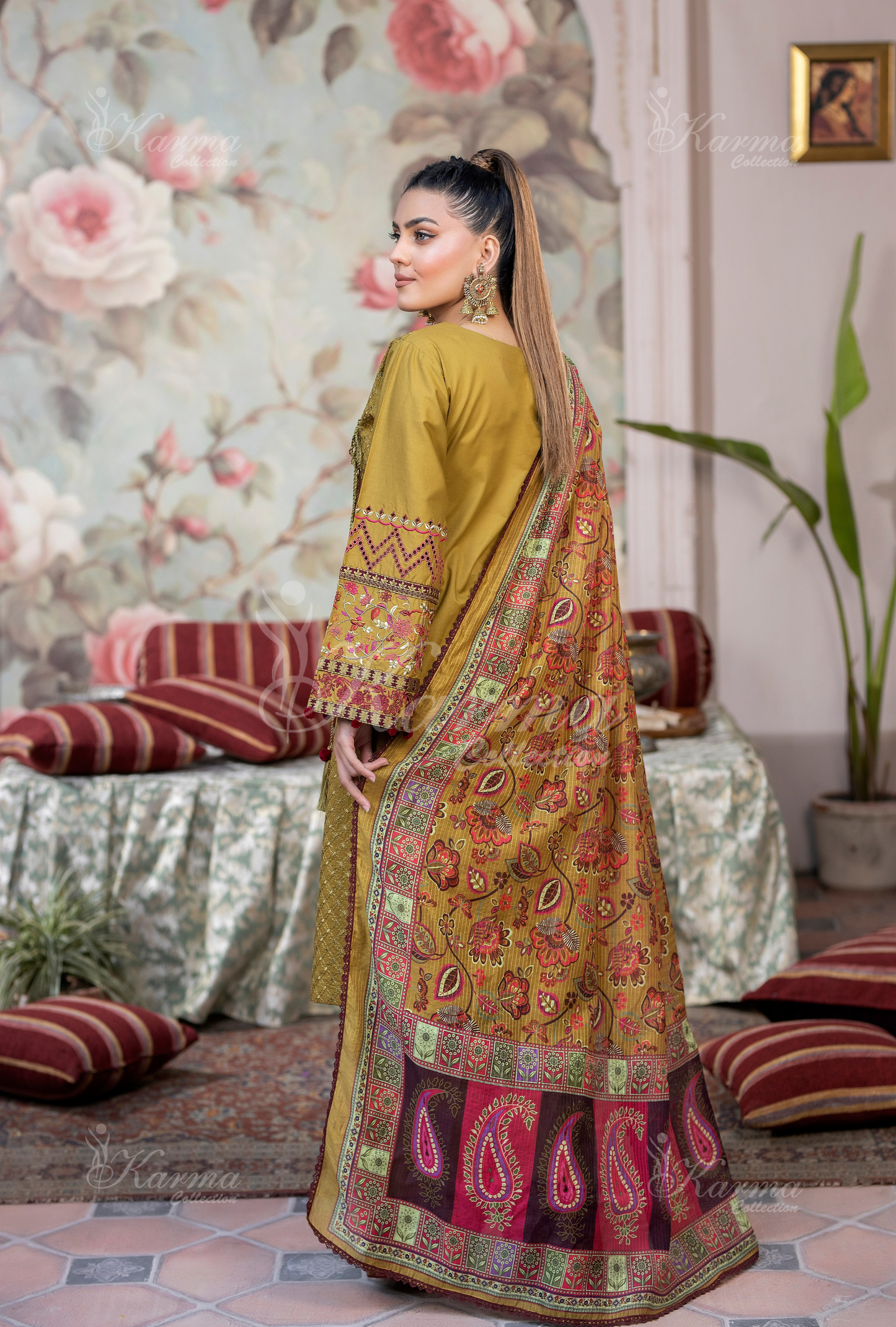 You'll love the effortless elegance of this cotton formal wear. Designed for both grace and comfort, this ensemble showcases a beautifully styled angrakha shirt featuring intricate embroidery that adds a touch of refined tradition. Paired with a printed dupatta edged with delicate lace, it offers a graceful and airy vibe. The farshi shalwar brings a flowing, regal finish to the outfit, making it perfect for festive occasions, cultural events, and formal gatherings, where timeless style meets effortless sophistication.