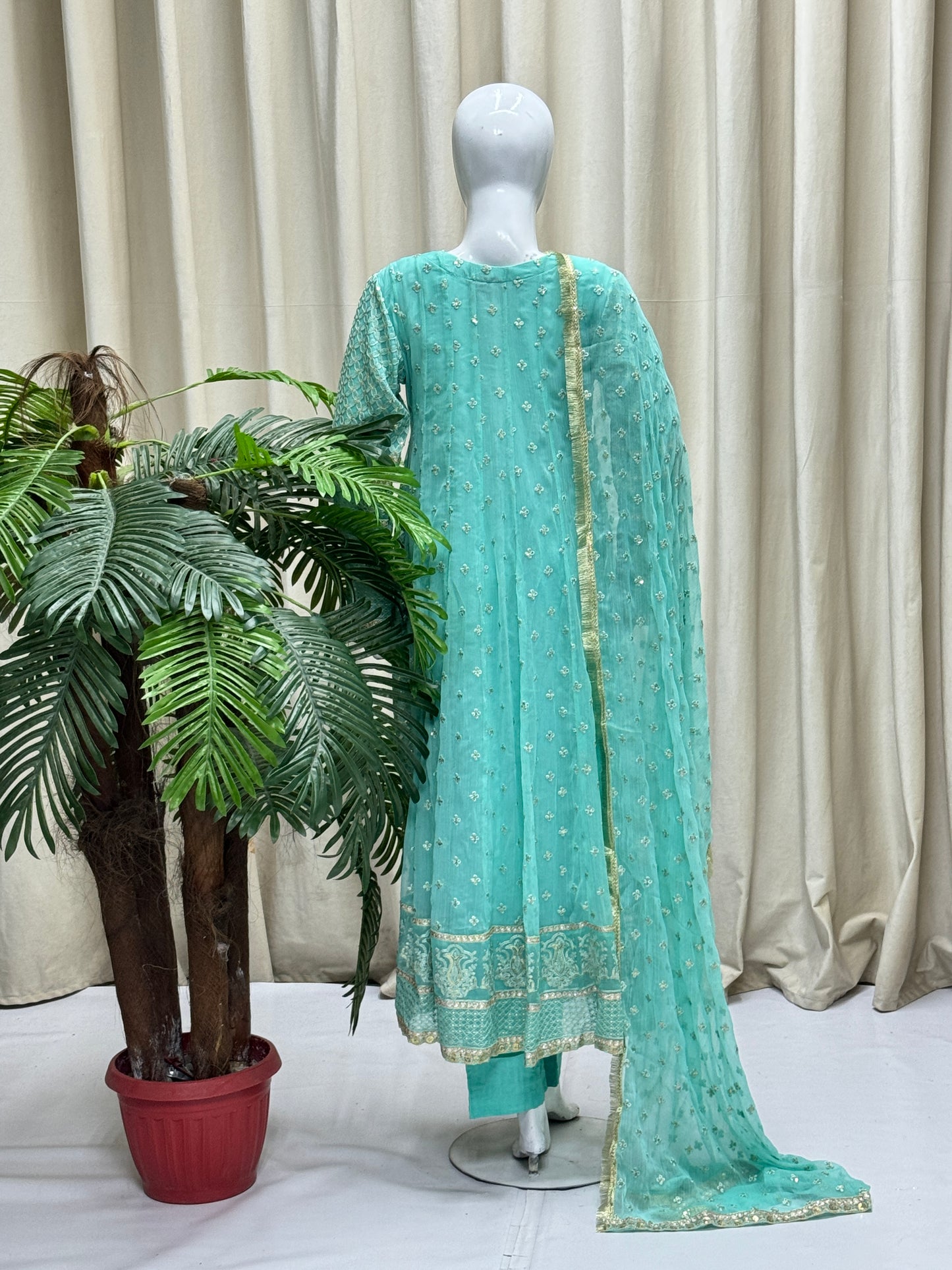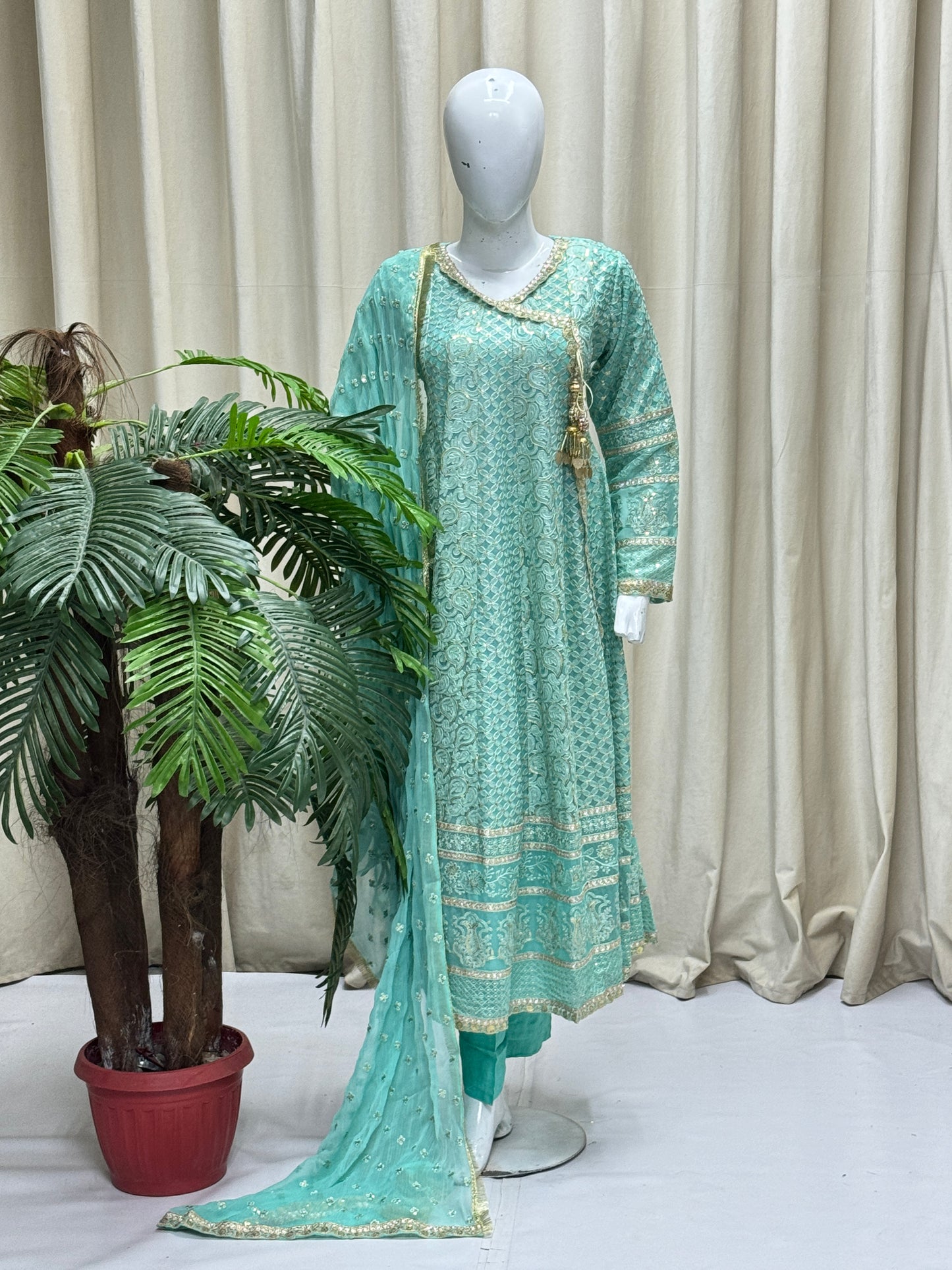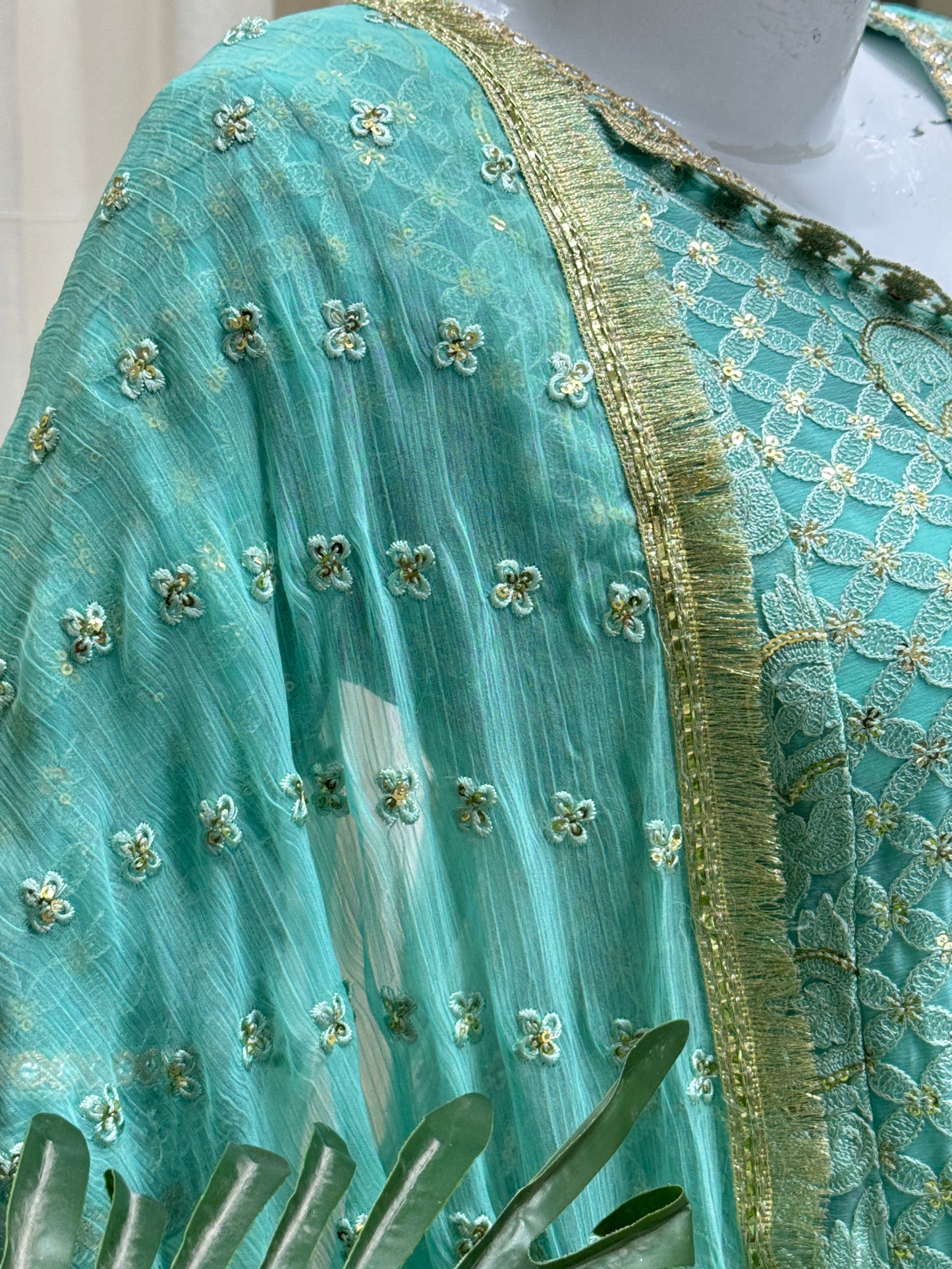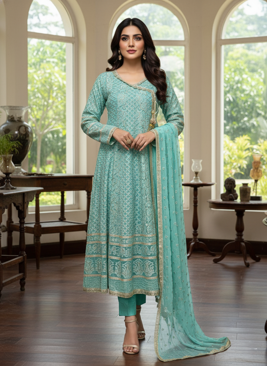The Karma 424 By SH is a ready-to-wear ensemble that includes a cutline frock, trouser with grip, and a chiffon dupatta. The frock and dupatta feature delicate chiffon fabric, while the trouser includes a grip for a comfortable fit. The outfit is embellished with sequence, embroidery, and tila thread work for added elegance.