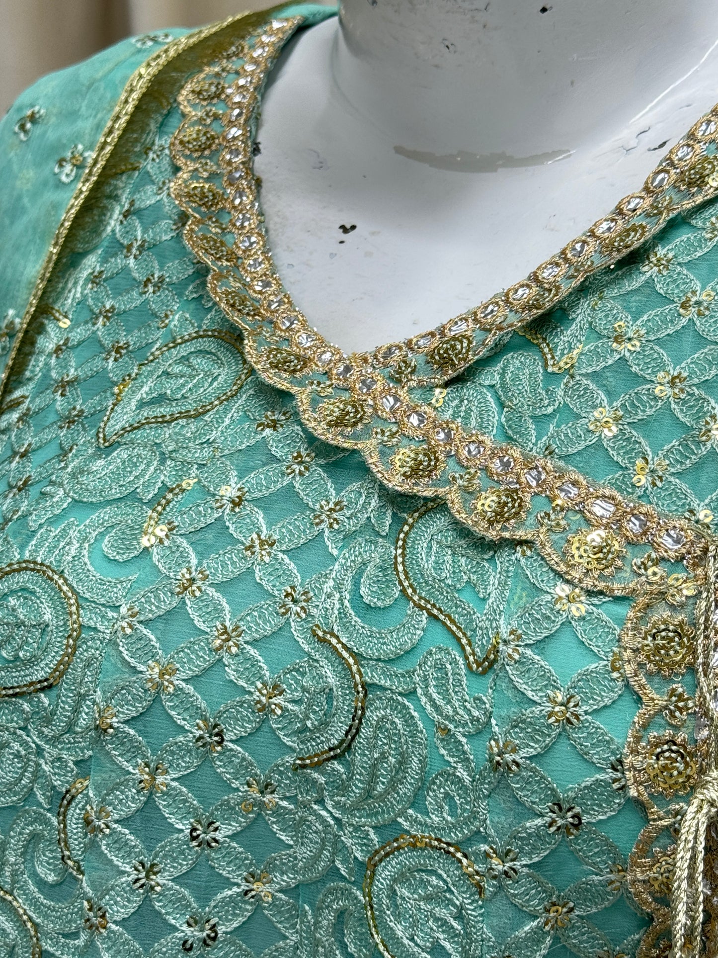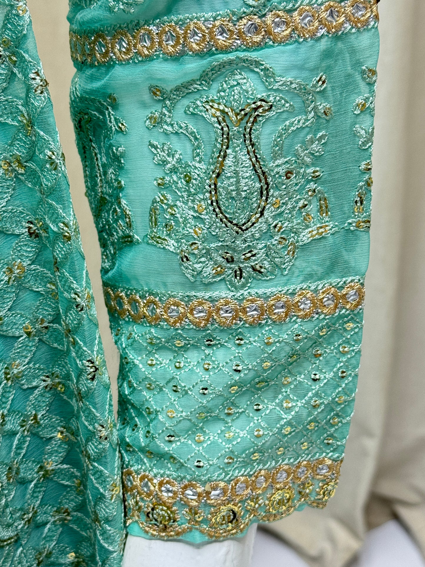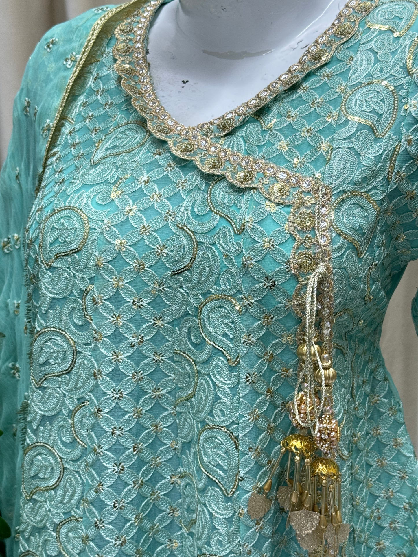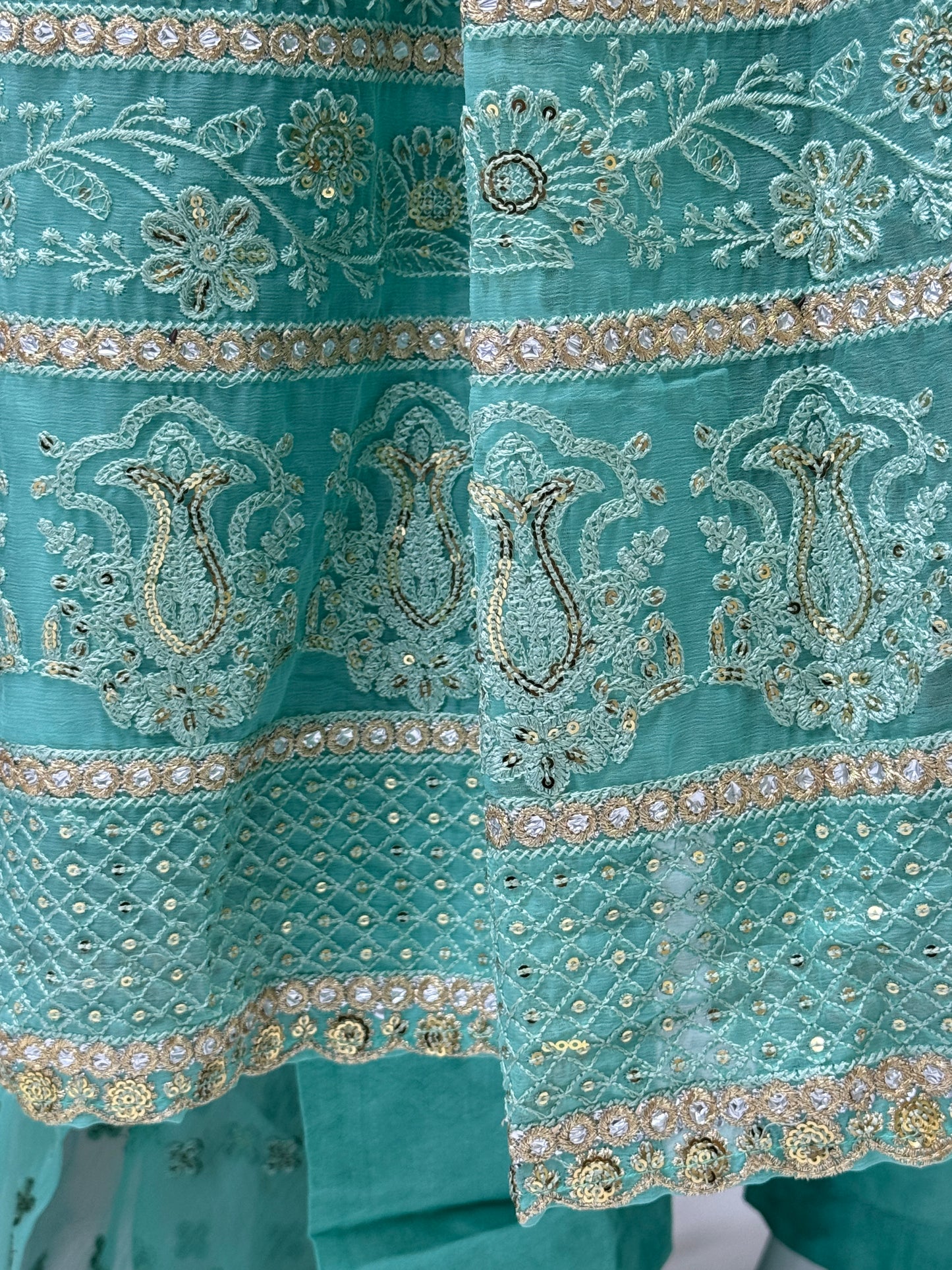 The Karma 424 By SH is a ready-to-wear ensemble that includes a cutline frock, trouser with grip, and a chiffon dupatta. The frock and dupatta feature delicate chiffon fabric, while the trouser includes a grip for a comfortable fit. The outfit is embellished with sequence, embroidery, and tila thread work for added elegance.