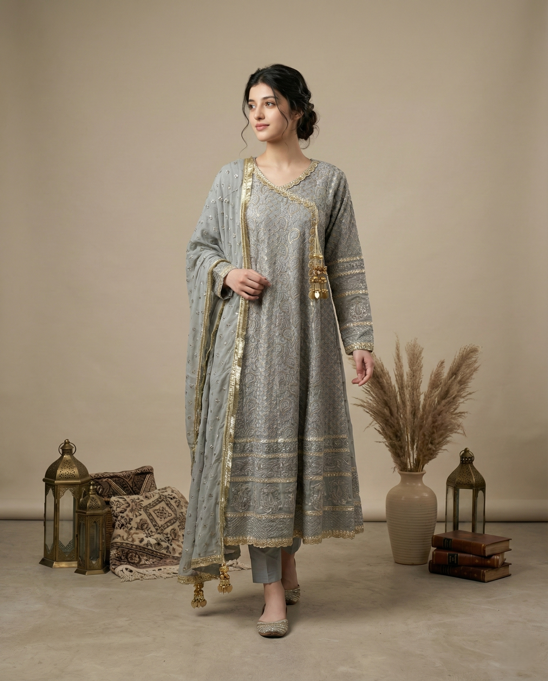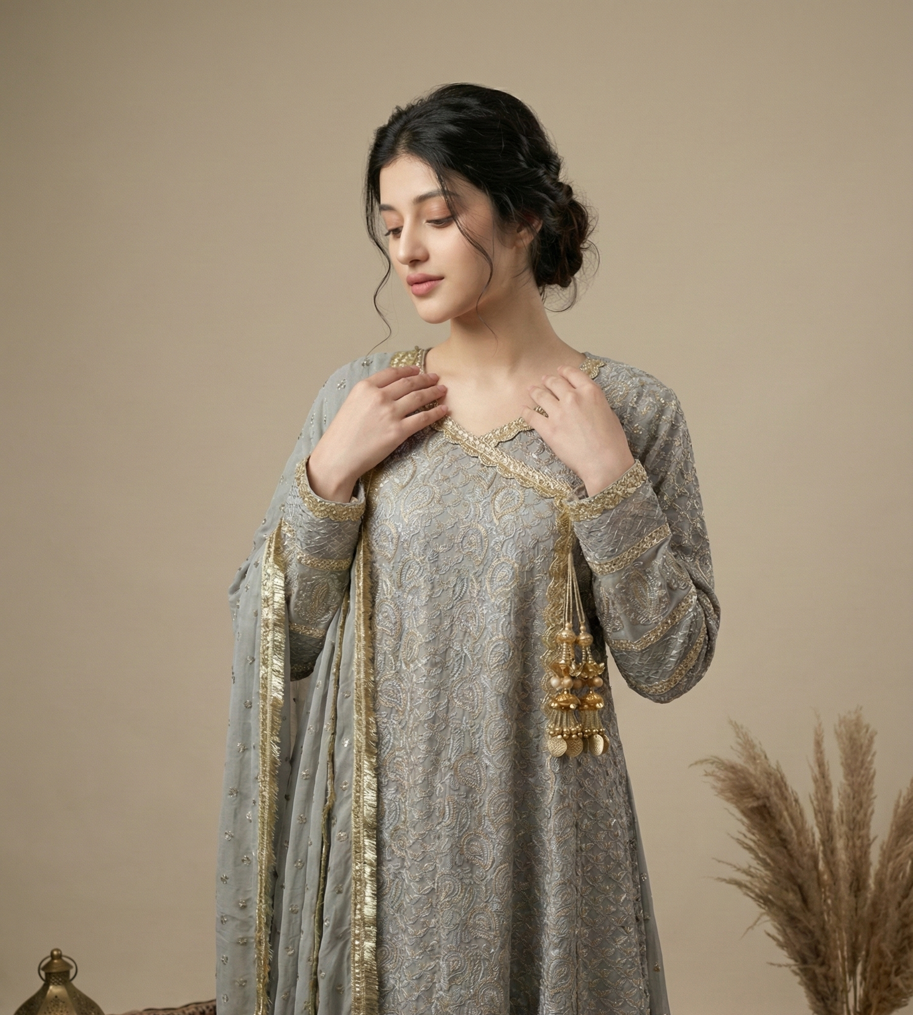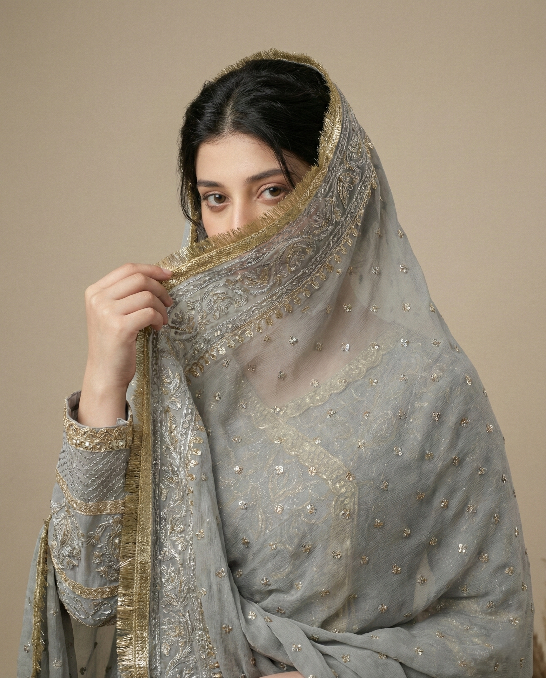 The Karma 424 By SH is a ready-to-wear ensemble that includes a cutline frock, trouser with grip, and a chiffon dupatta. The frock and dupatta feature delicate chiffon fabric, while the trouser includes a grip for a comfortable fit. The outfit is embellished with sequence, embroidery, and tila thread work for added elegance.