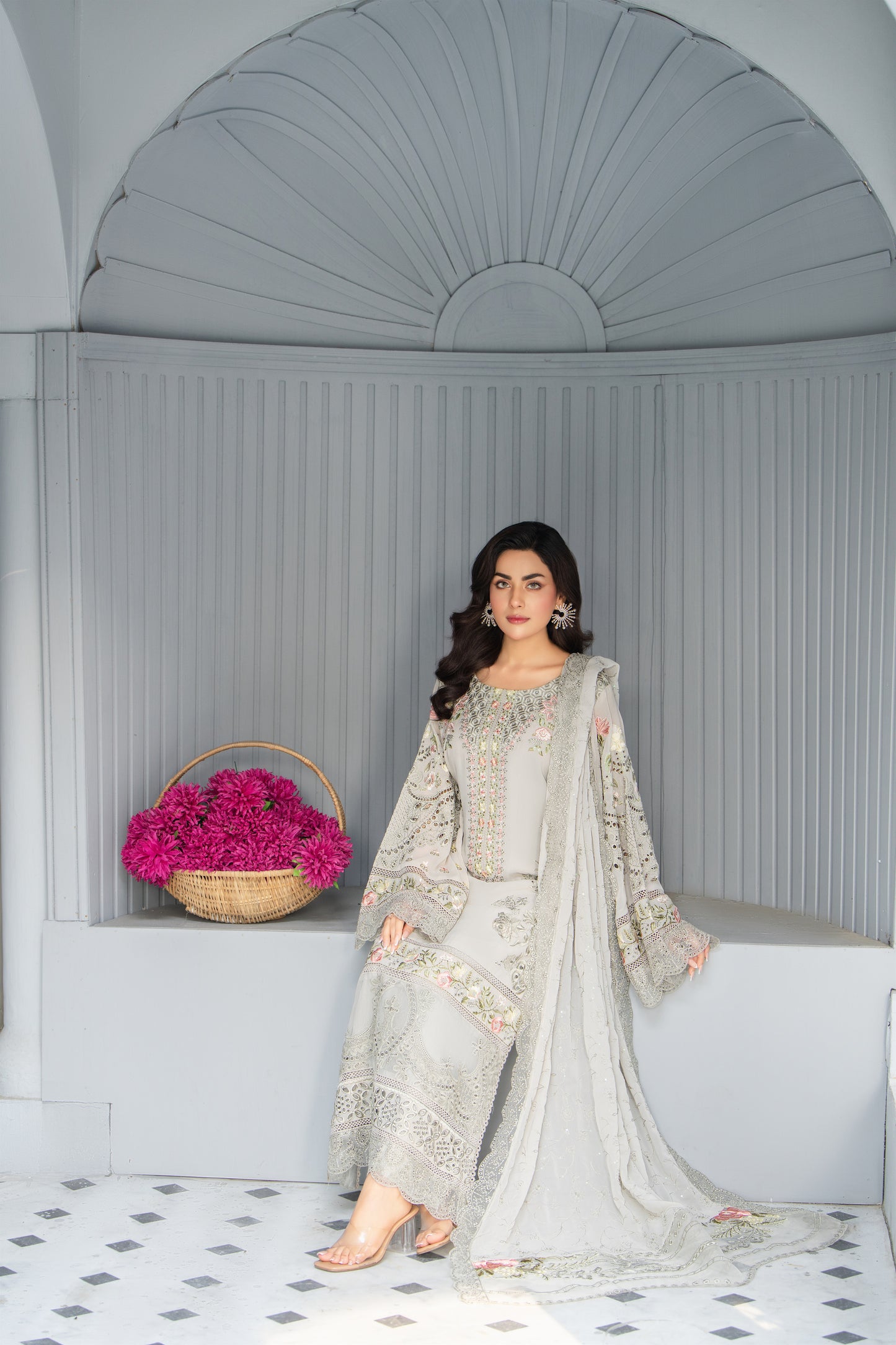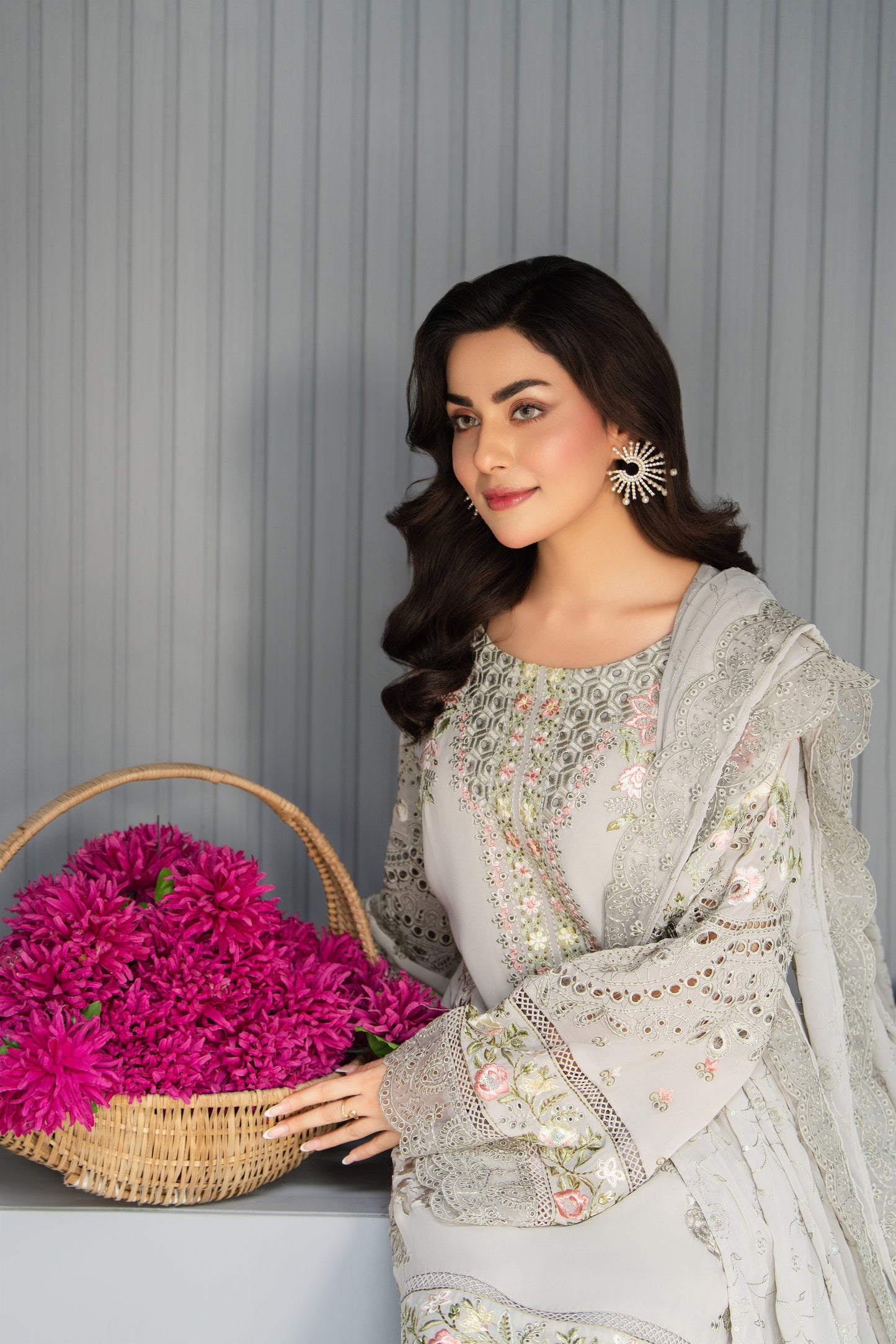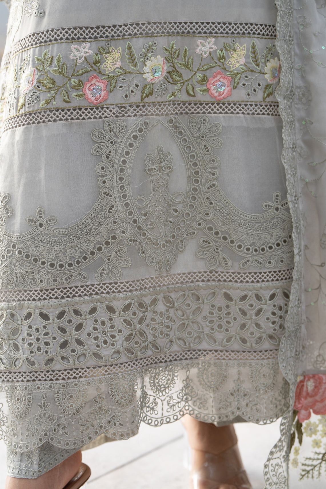 Indulge in luxury with the Karma 448. This 3PC READY TO WEAR ensemble includes a plain chiffon shirt, grip trousers with embroidery, and a fully embroidered and lace-worked chiffon dupatta. Exquisite chikankari and multi-thread work elevate this outfit to aspirational status.