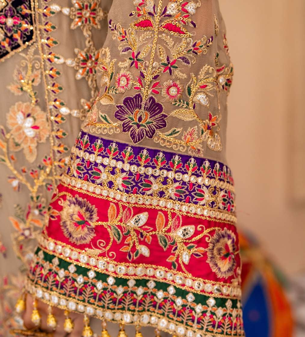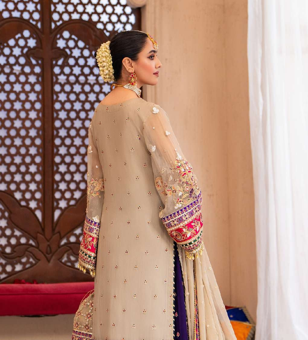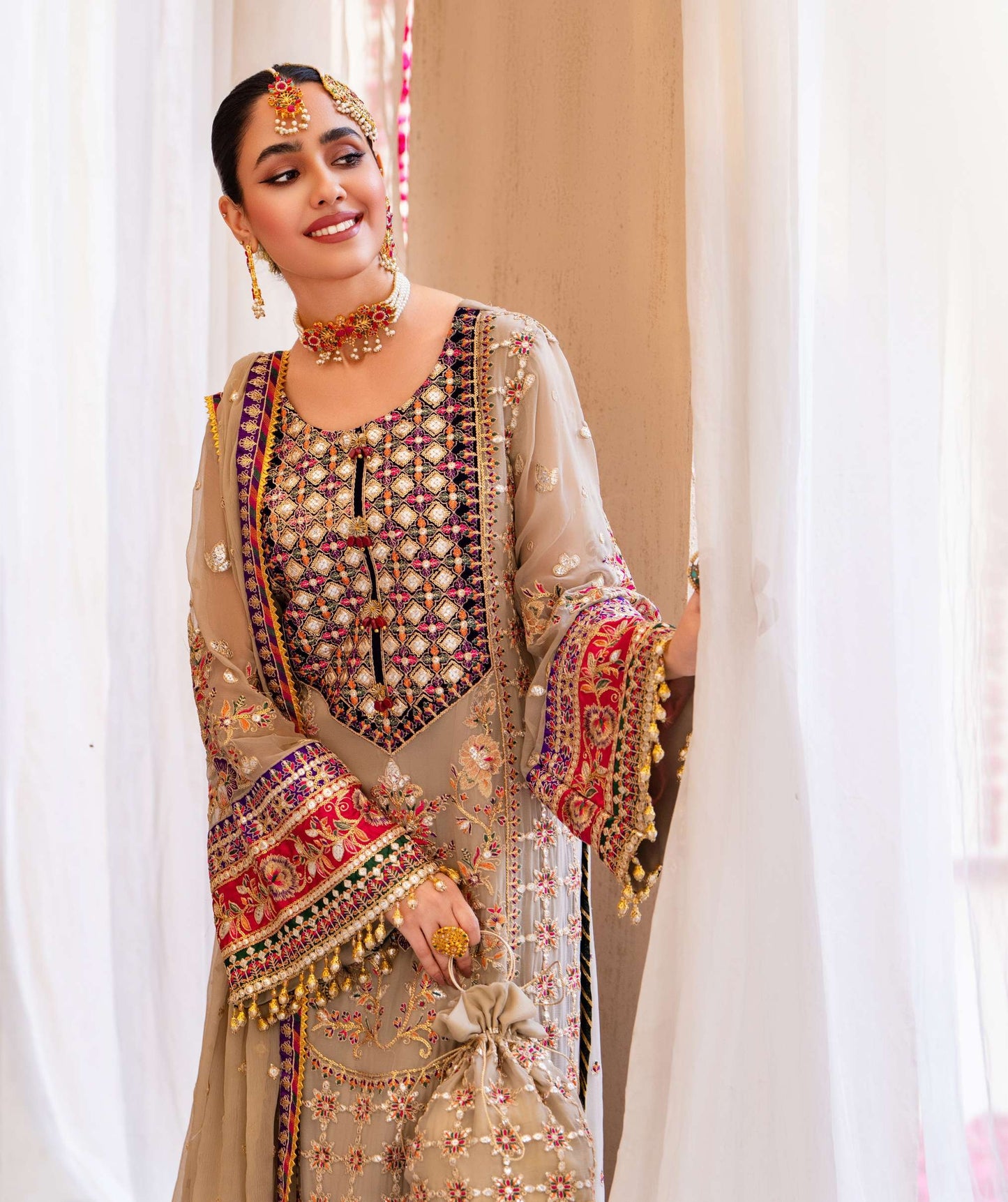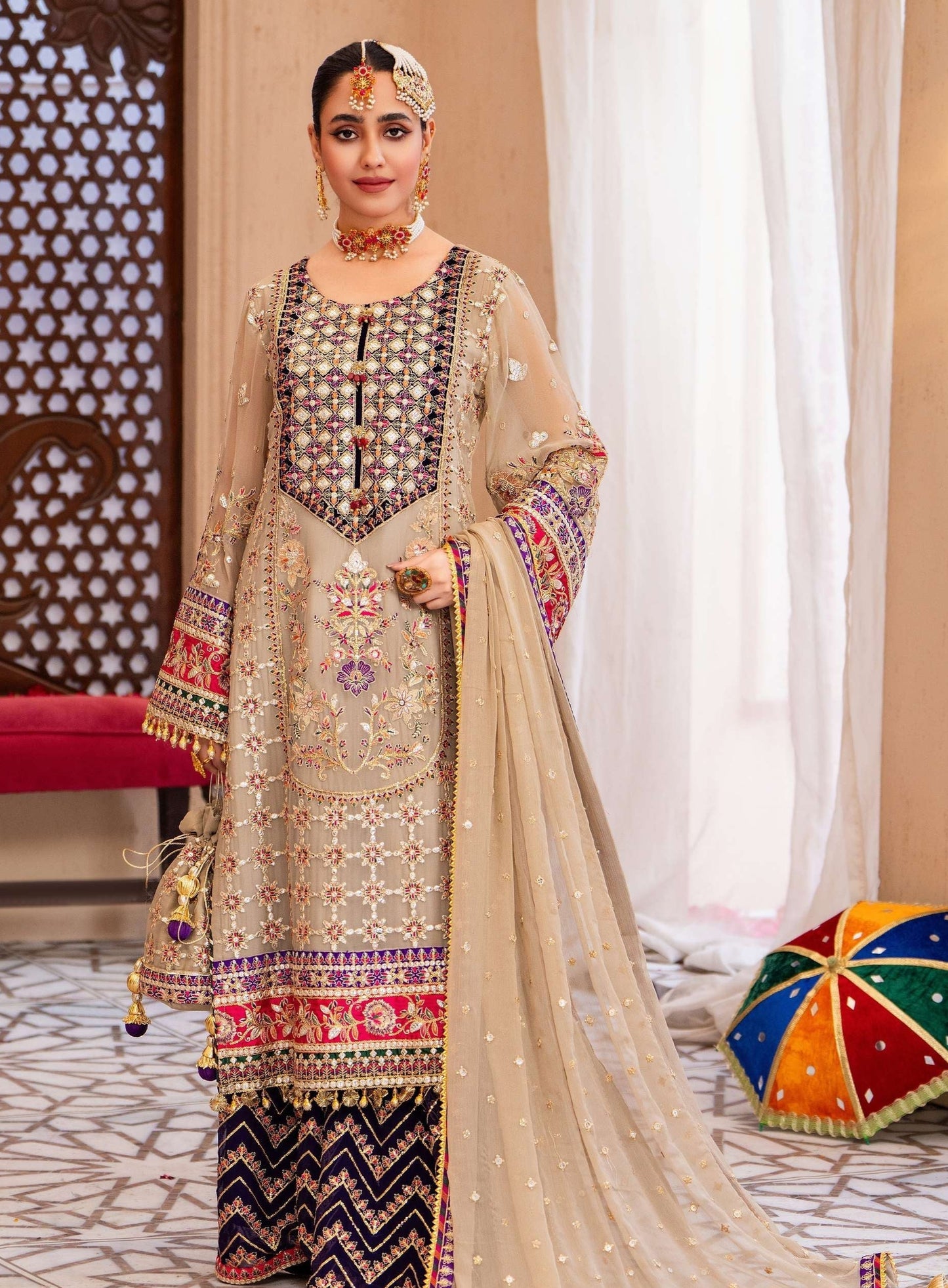 Discover the effortless elegance of the Karma 458 ensemble. This 3PC READY TO WEAR set includes a beautifully embellished shirt and dupatta, along with a plain chiffon sharara for a stunning silhouette. And for added convenience, it even comes with a pouch for your accessories. Elevate your wardrobe with this must-have piece.