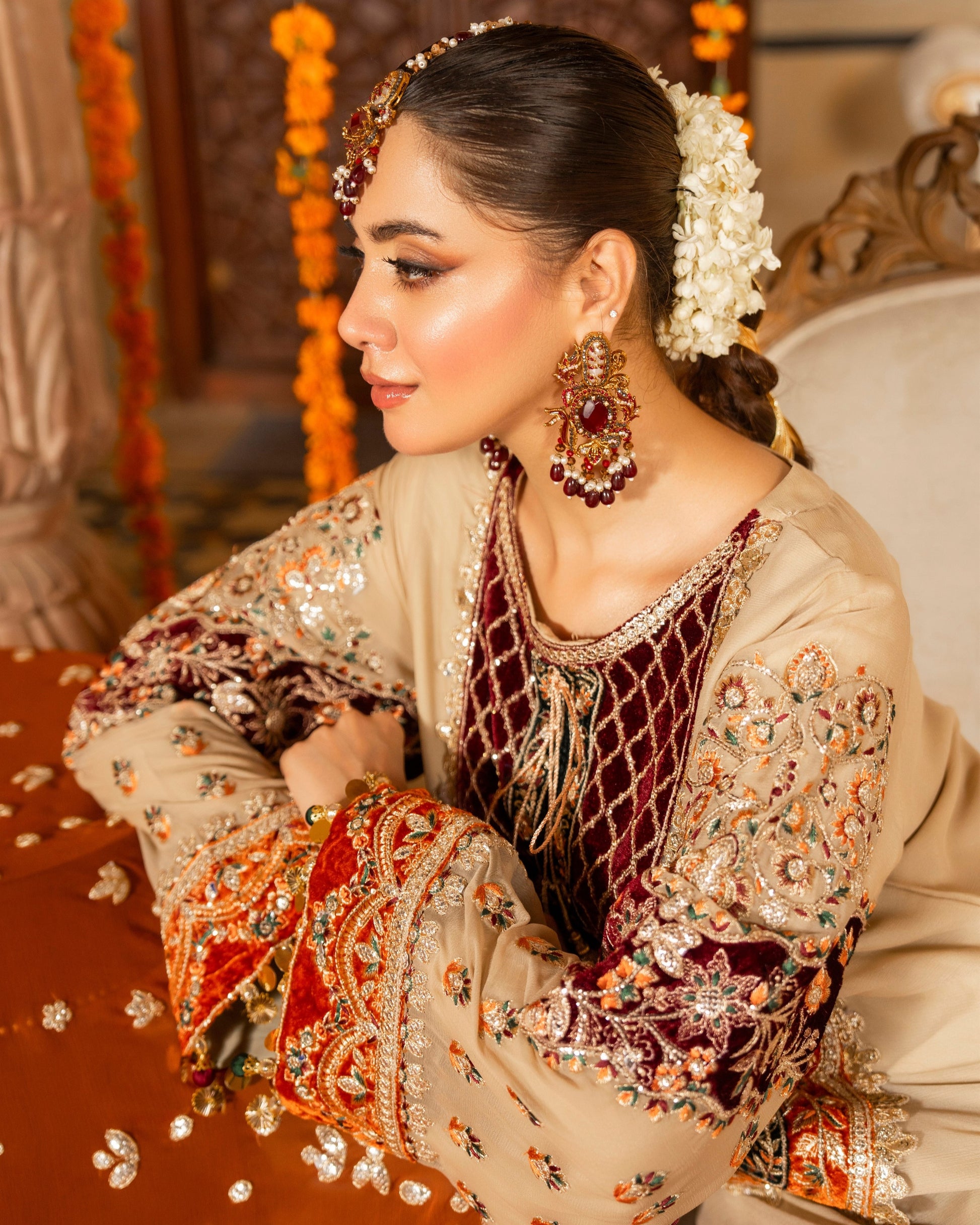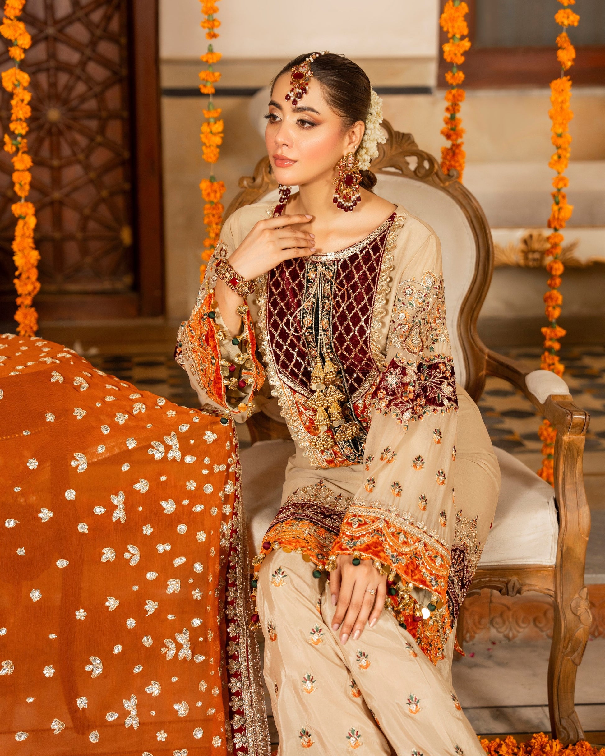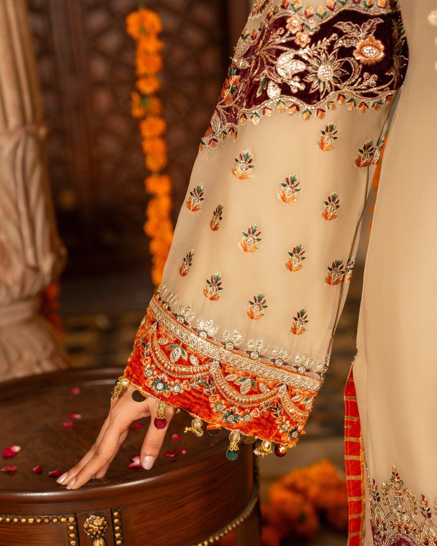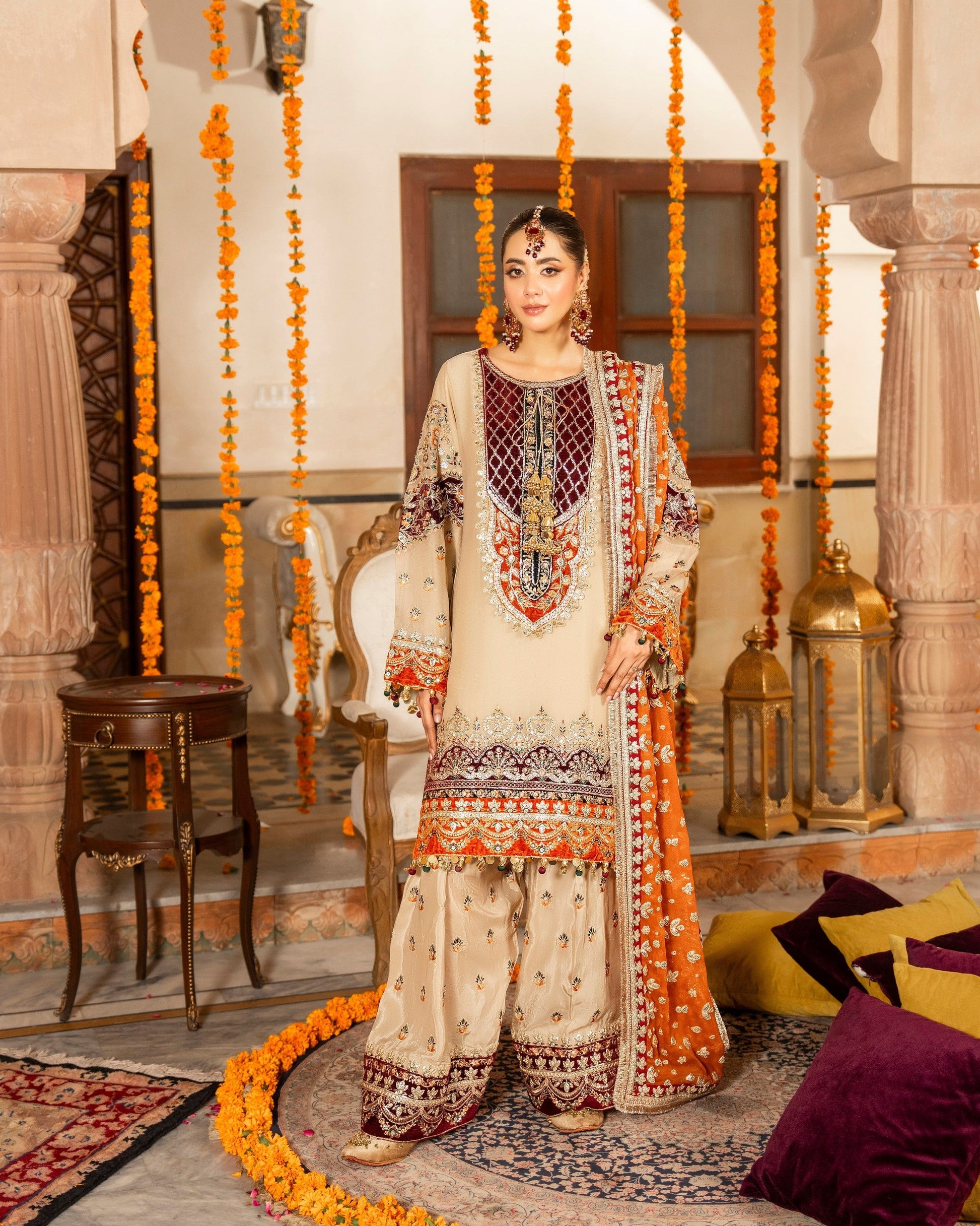 An elegant crinkle chiffon ensemble designed to capture timeless charm. The shirt features exquisite tilla, panni, sequin, and multi-thread embroidery, creating a luxurious, handcrafted look. Paired with a beautifully adorned crinkle chiffon dupatta detailed with panni and patchwork, and an embroidered shalwar that completes the traditional silhouette with grace.