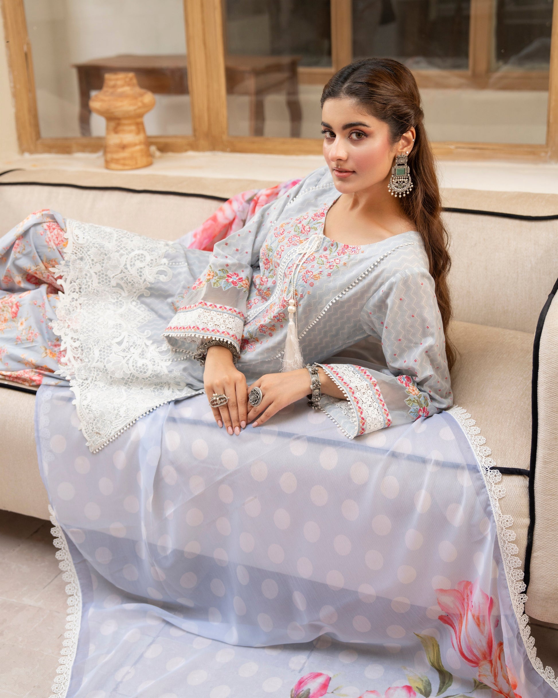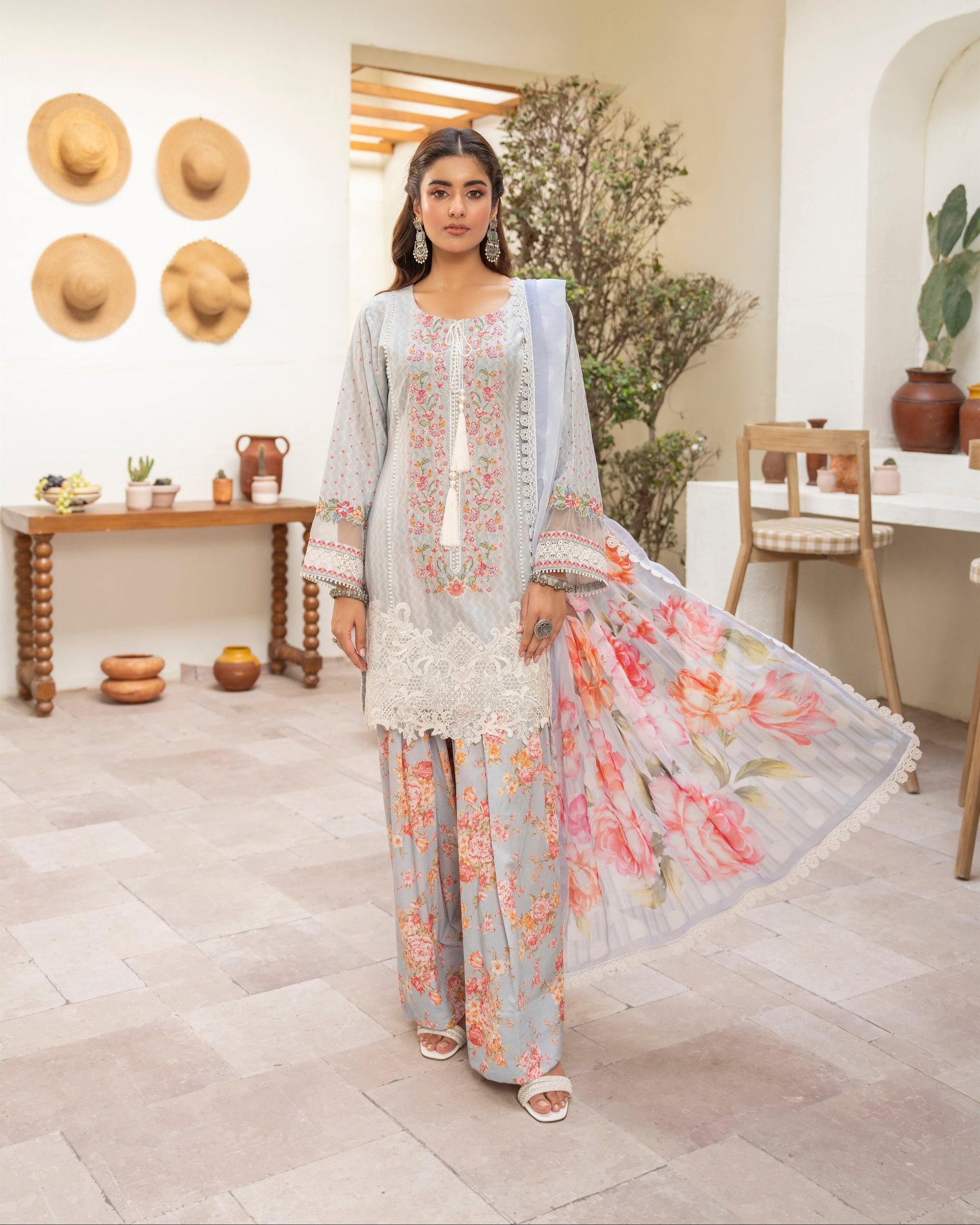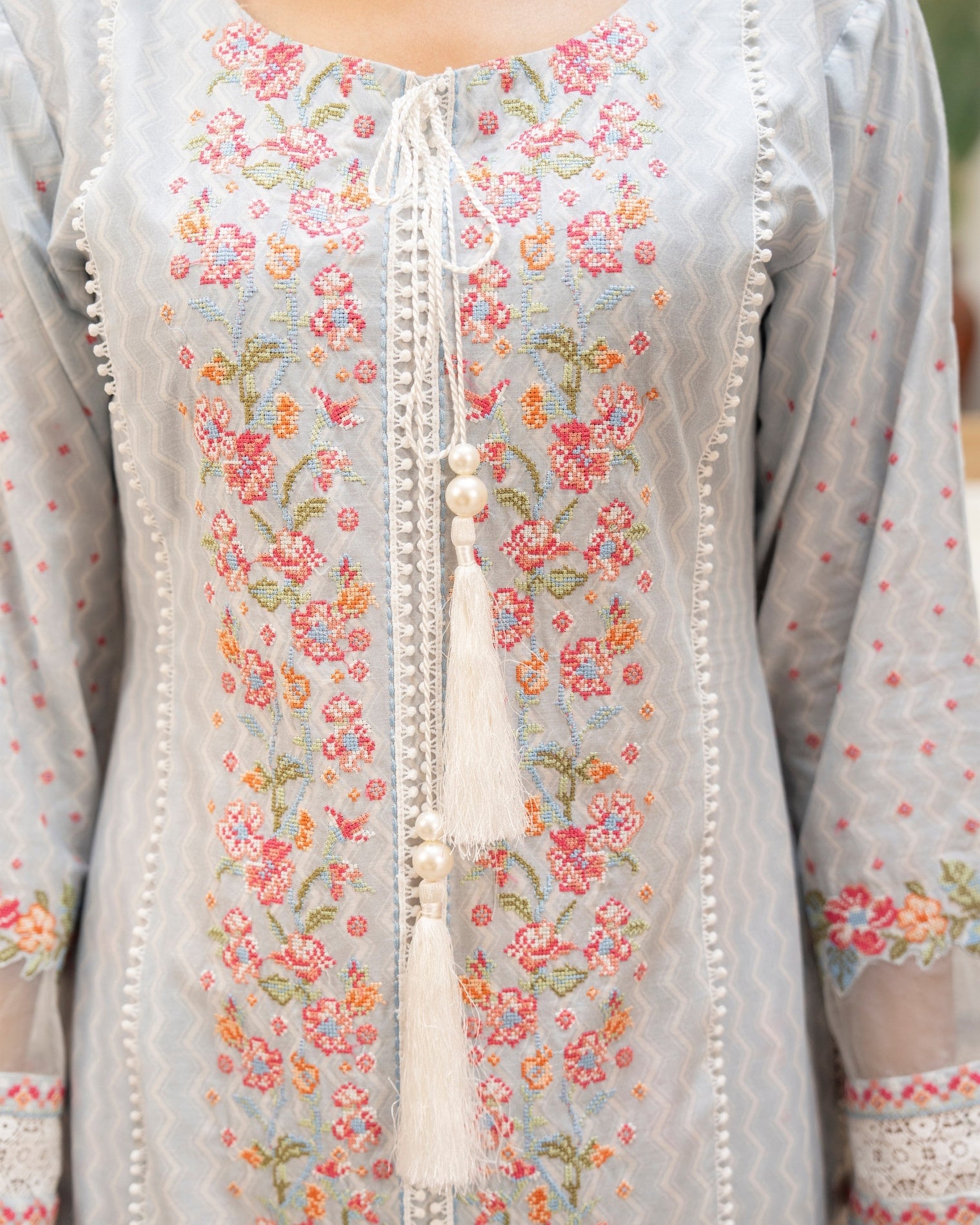 Discover the perfect look. Its intriguing details make it a must-have for any wardrobe. Designed for comfort and style, you'll feel confident and fashionable every time you wear it. Upgrade your look today with this outfit. This upcoming 3PC ensemble features a short shirt with a cross stitch neckline and organza patchwork on the borders and sleeves, paired with a printed crinkle chiffon dupatta finished with all-over lace, and a timeless farshi shalwar for a graceful silhouette.