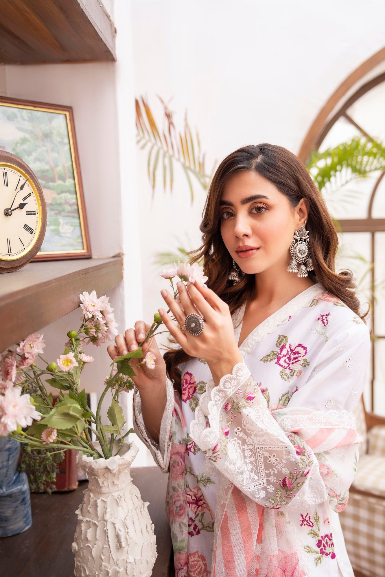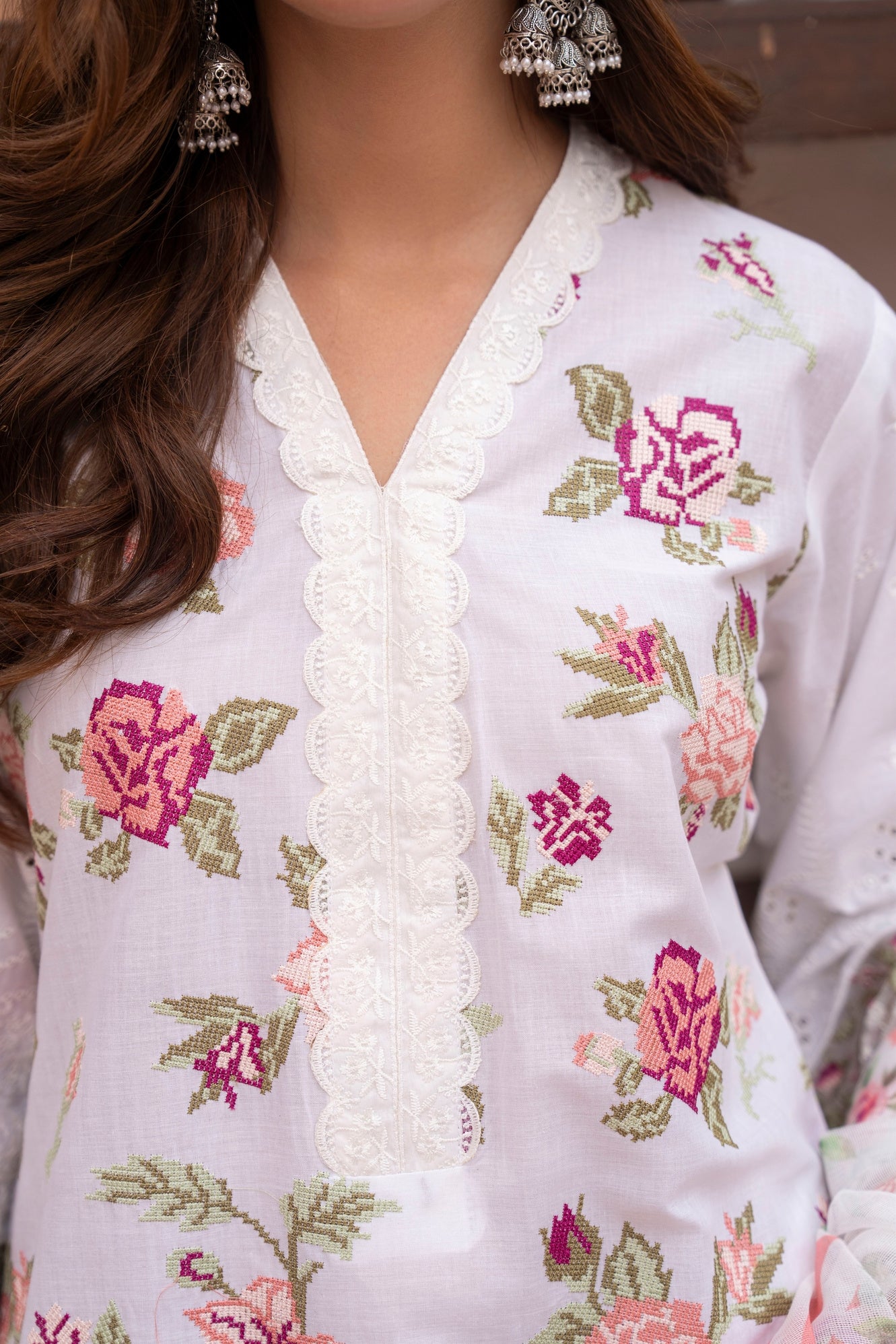 This 3PC ready-to-wear ensemble includes a short shirt crafted from cotton with intricate cross stitch work, giving it a textured, handcrafted charm. The dupatta is made of khaddi fabric, offering a breezy, traditional finish. The farshi shalwar stands out with its wide-legged cut and detailed cutwork patch, adding elegance to your movement. A balanced fusion of grace and craft, ideal for both casual and semi-formal occasions.