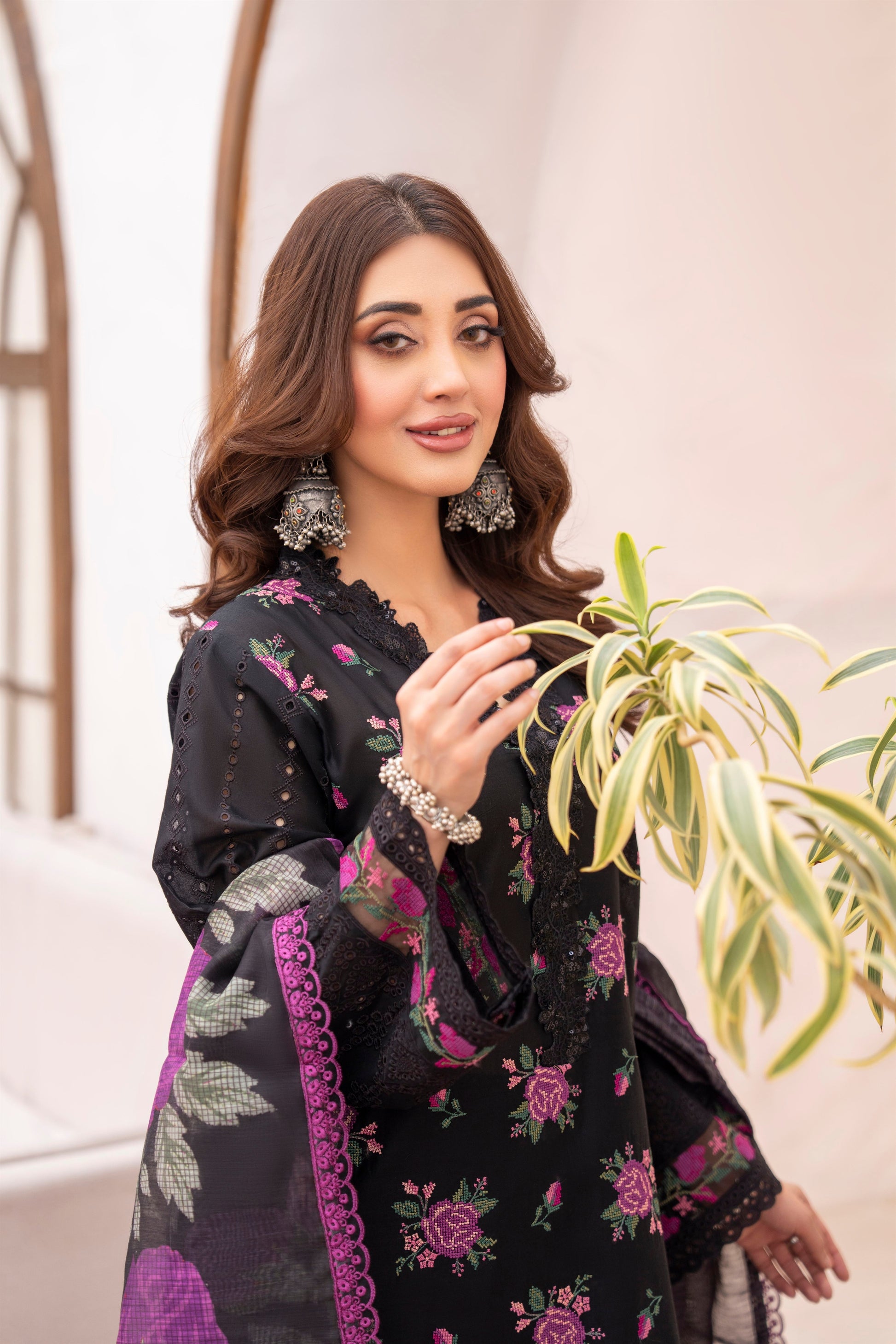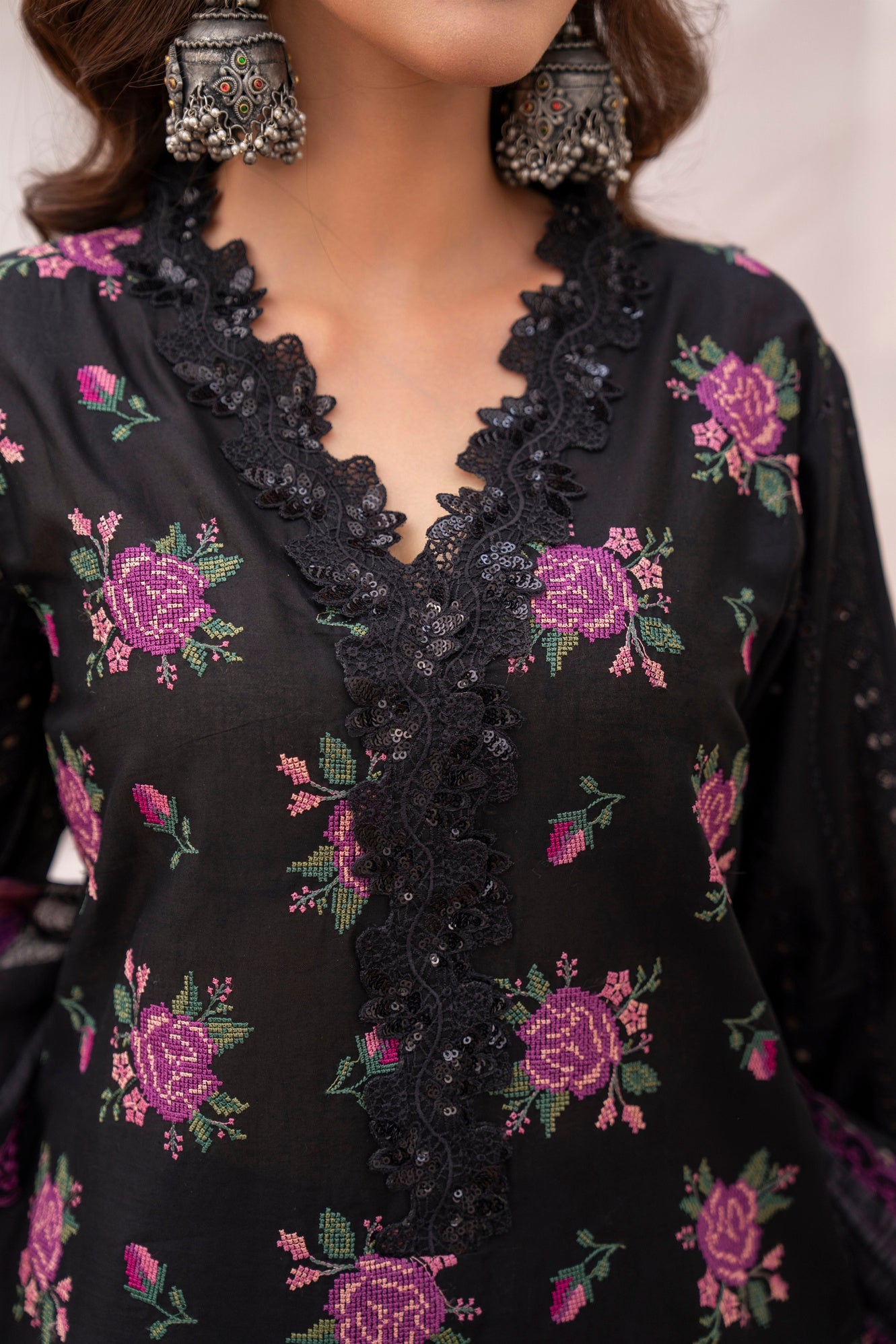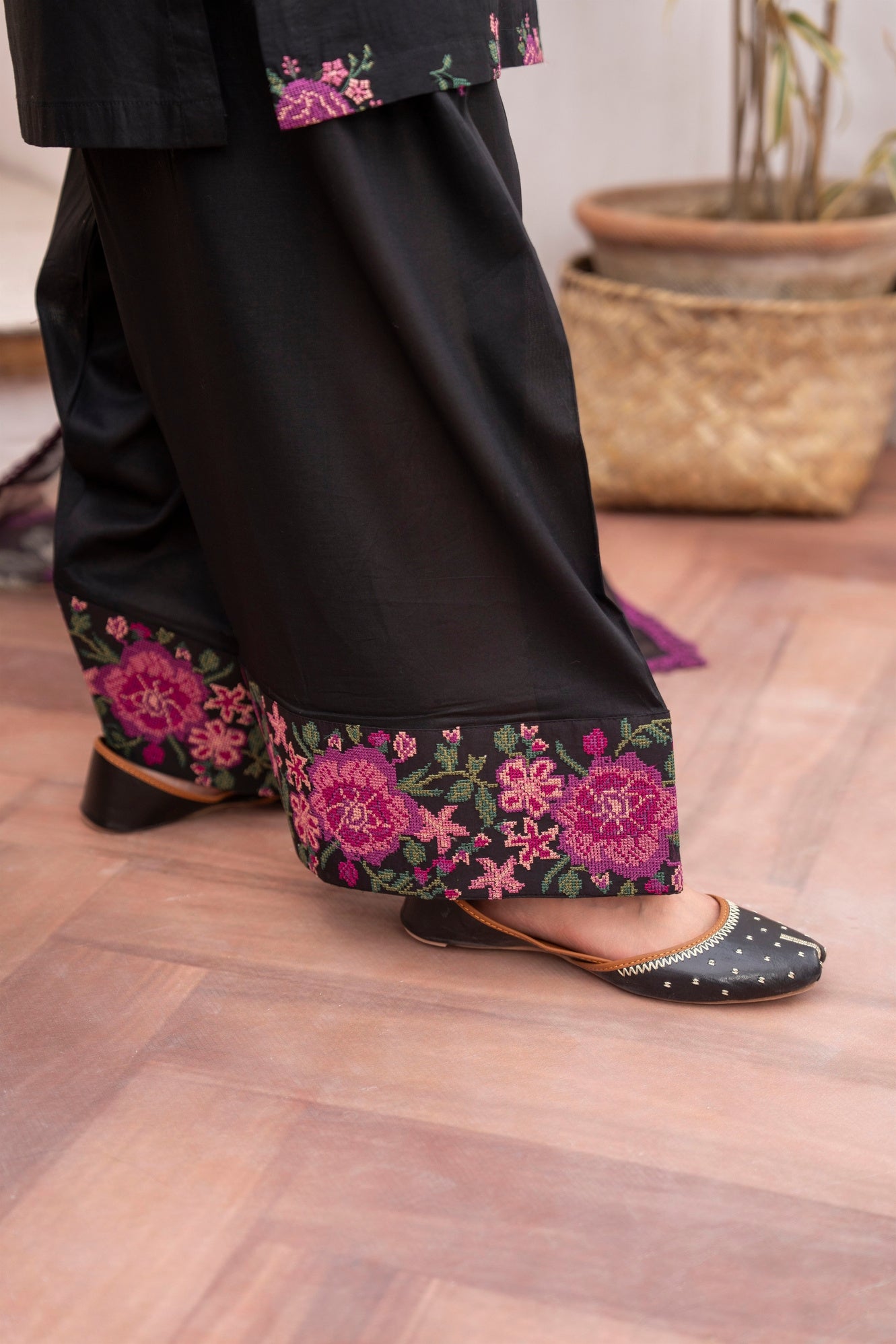 This 3PC ready-to-wear ensemble includes a short shirt crafted from cotton with intricate cross stitch work, giving it a textured, handcrafted charm. The dupatta is made of khaddi fabric, offering a breezy, traditional finish. The farshi shalwar stands out with its wide-legged cut and detailed cutwork patch, adding elegance to your movement. A balanced fusion of grace and craft, ideal for both casual and semi-formal occasions.