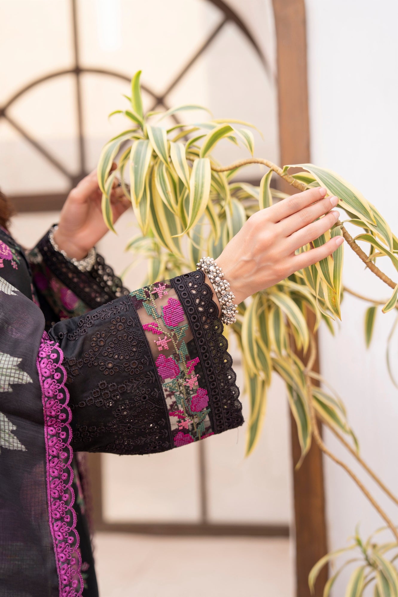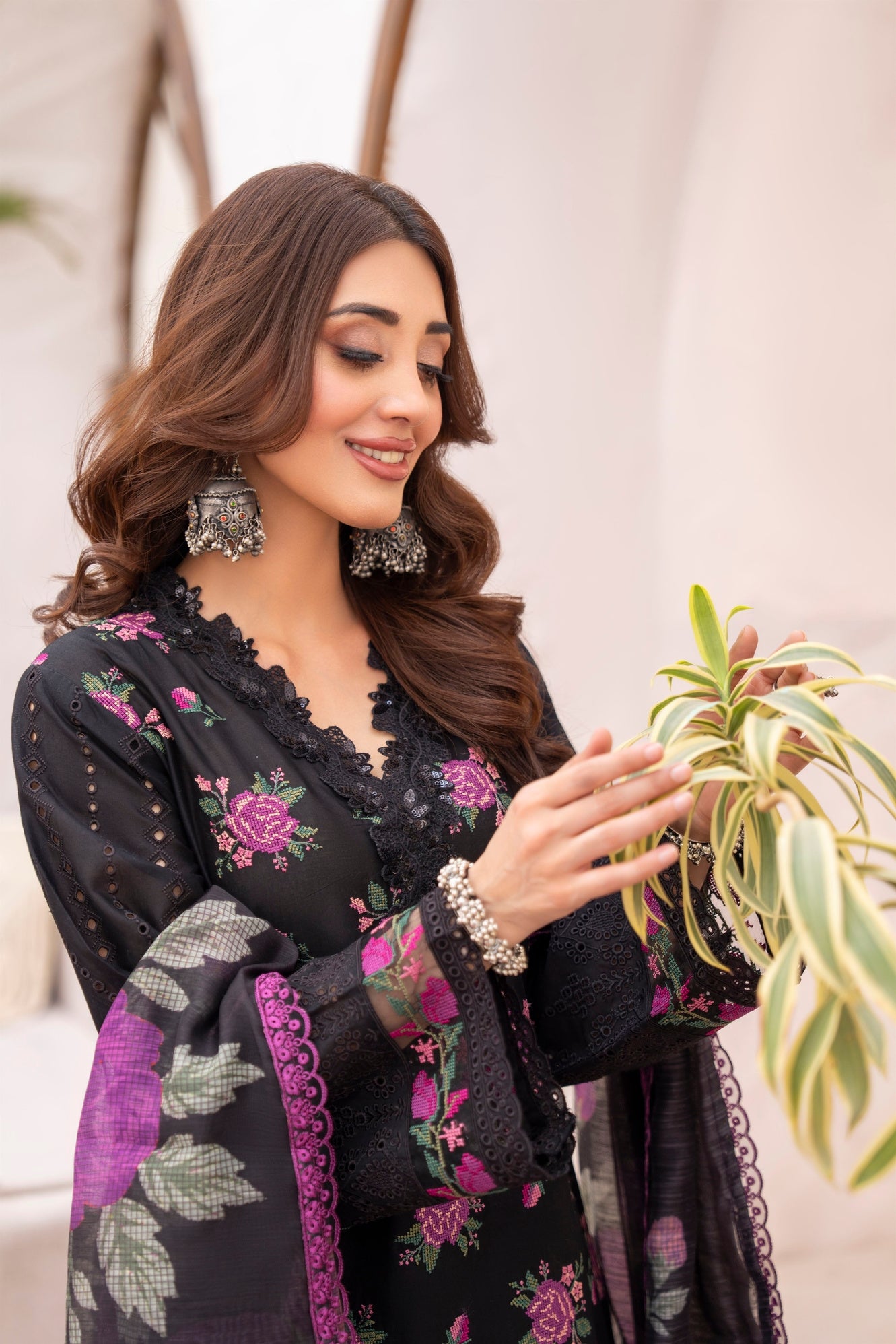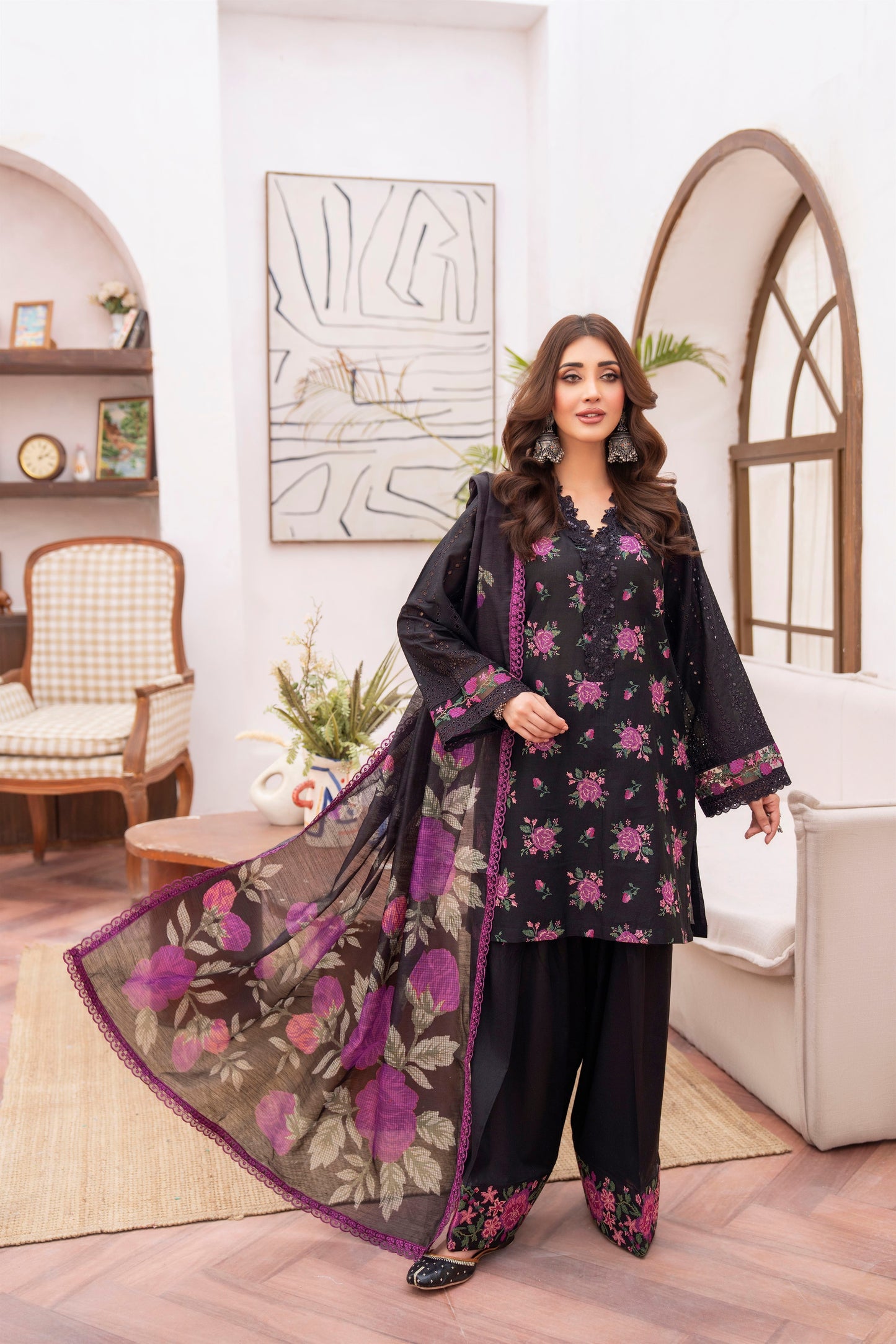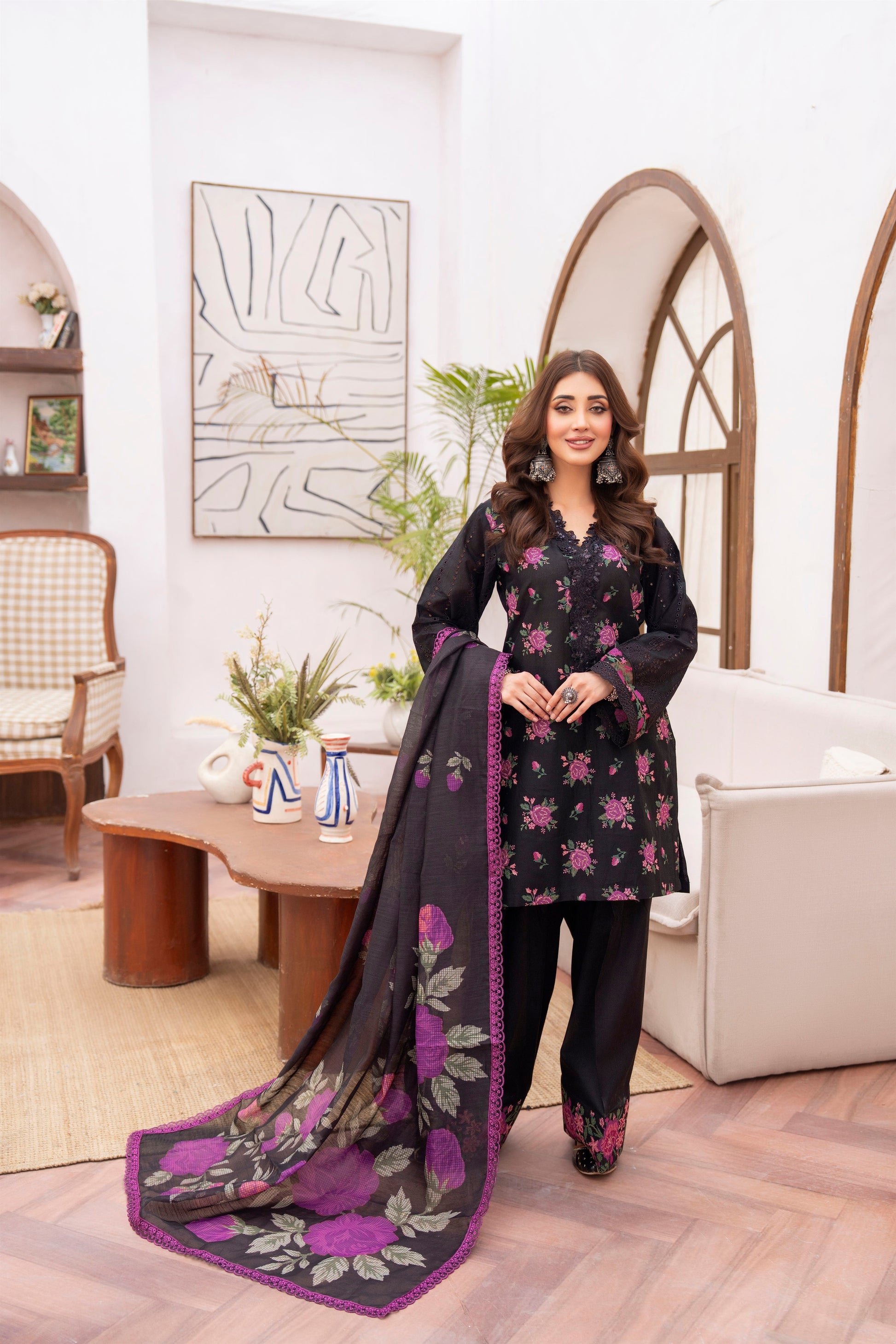 This 3PC ready-to-wear ensemble includes a short shirt crafted from cotton with intricate cross stitch work, giving it a textured, handcrafted charm. The dupatta is made of khaddi fabric, offering a breezy, traditional finish. The farshi shalwar stands out with its wide-legged cut and detailed cutwork patch, adding elegance to your movement. A balanced fusion of grace and craft, ideal for both casual and semi-formal occasions.