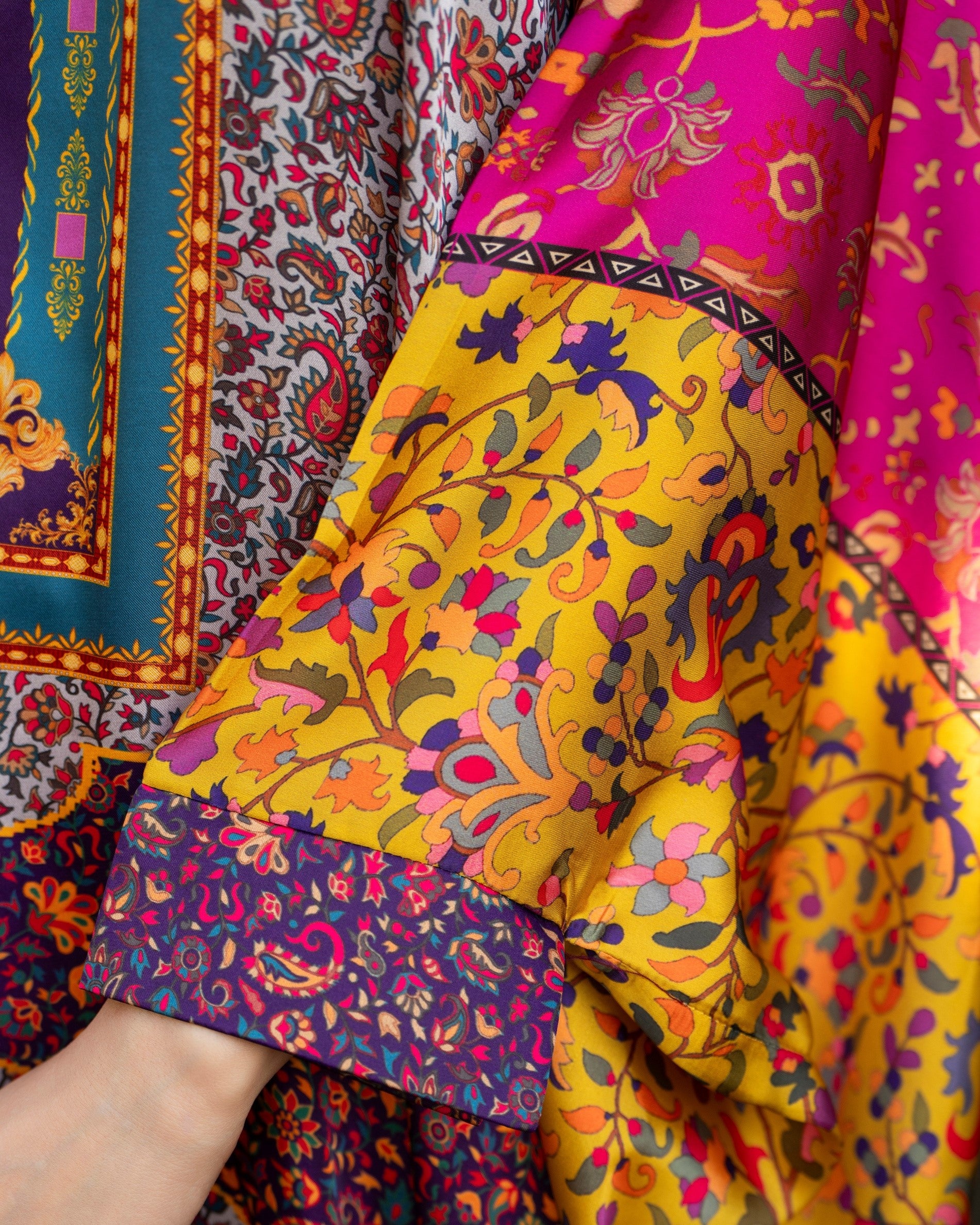 Shirt: Printed shamoz silk long shirt offering a smooth texture and an elegant fall.
