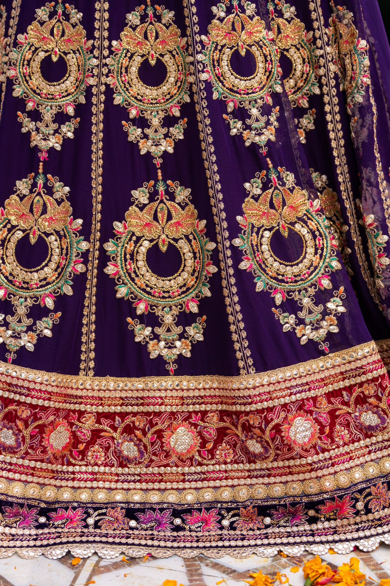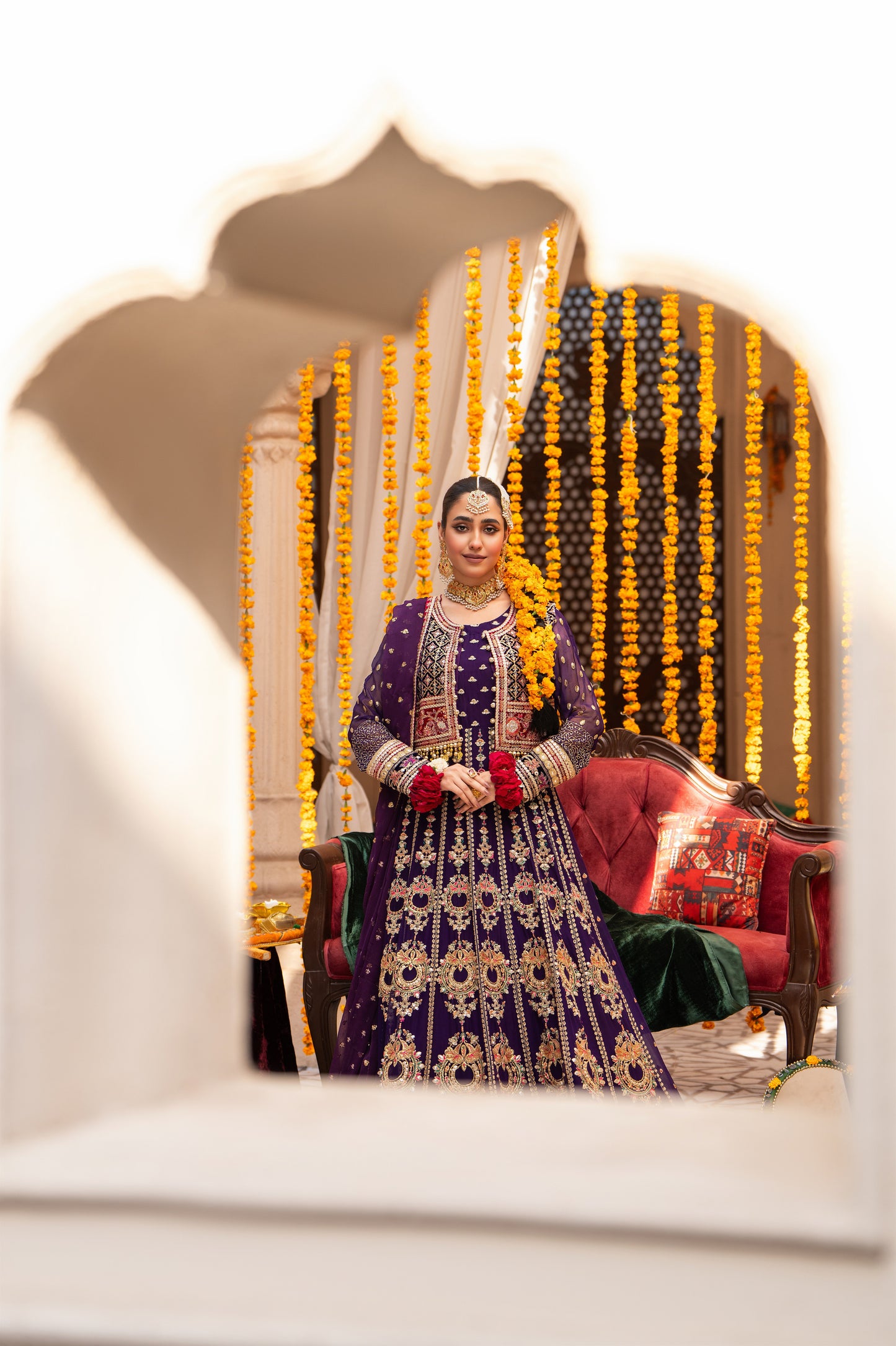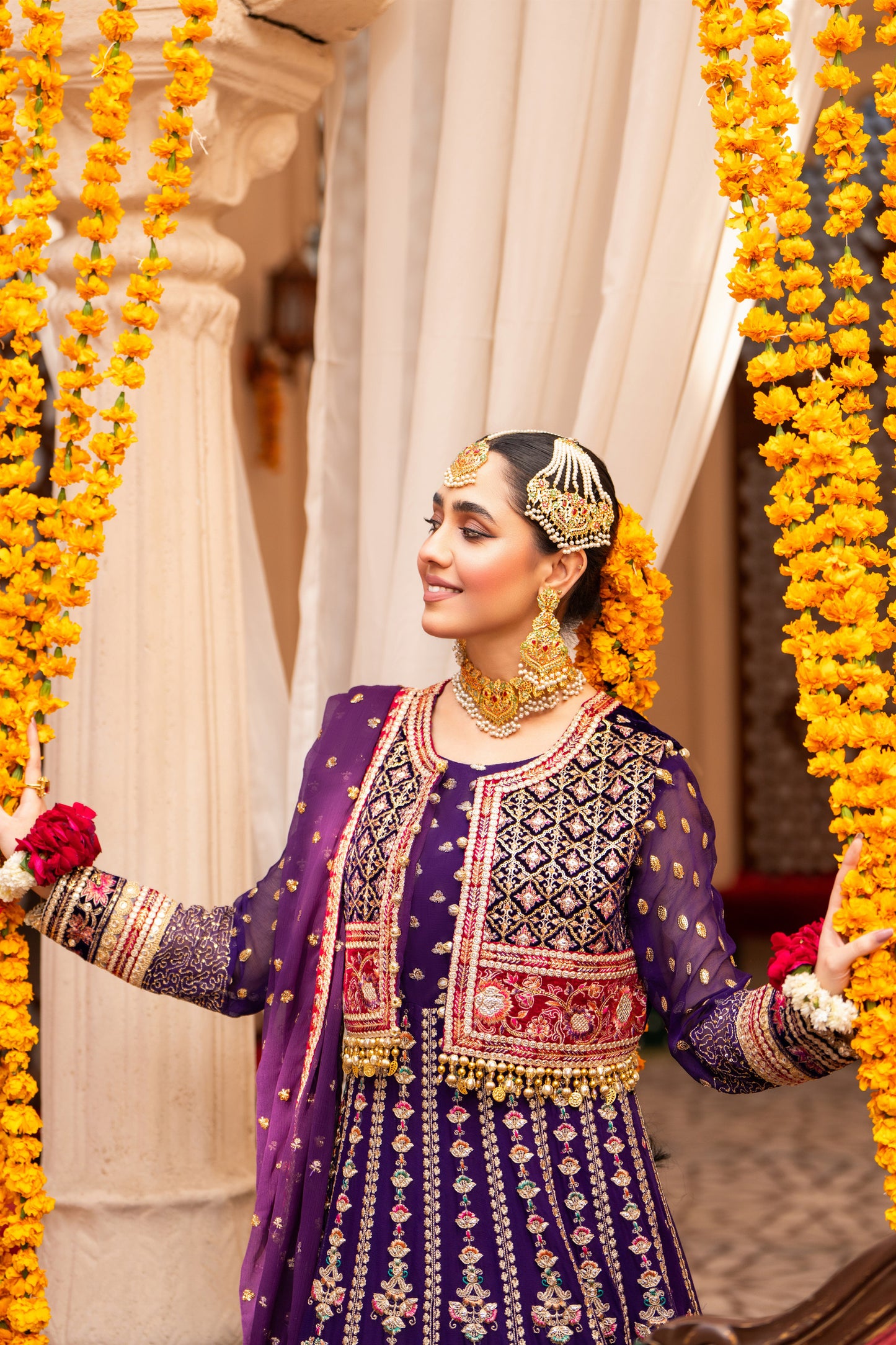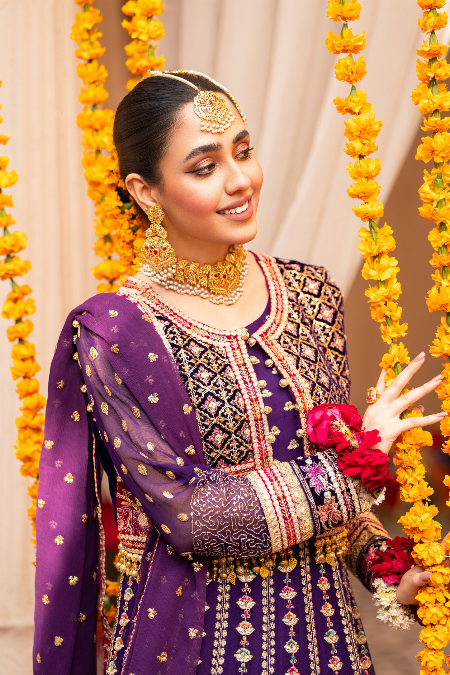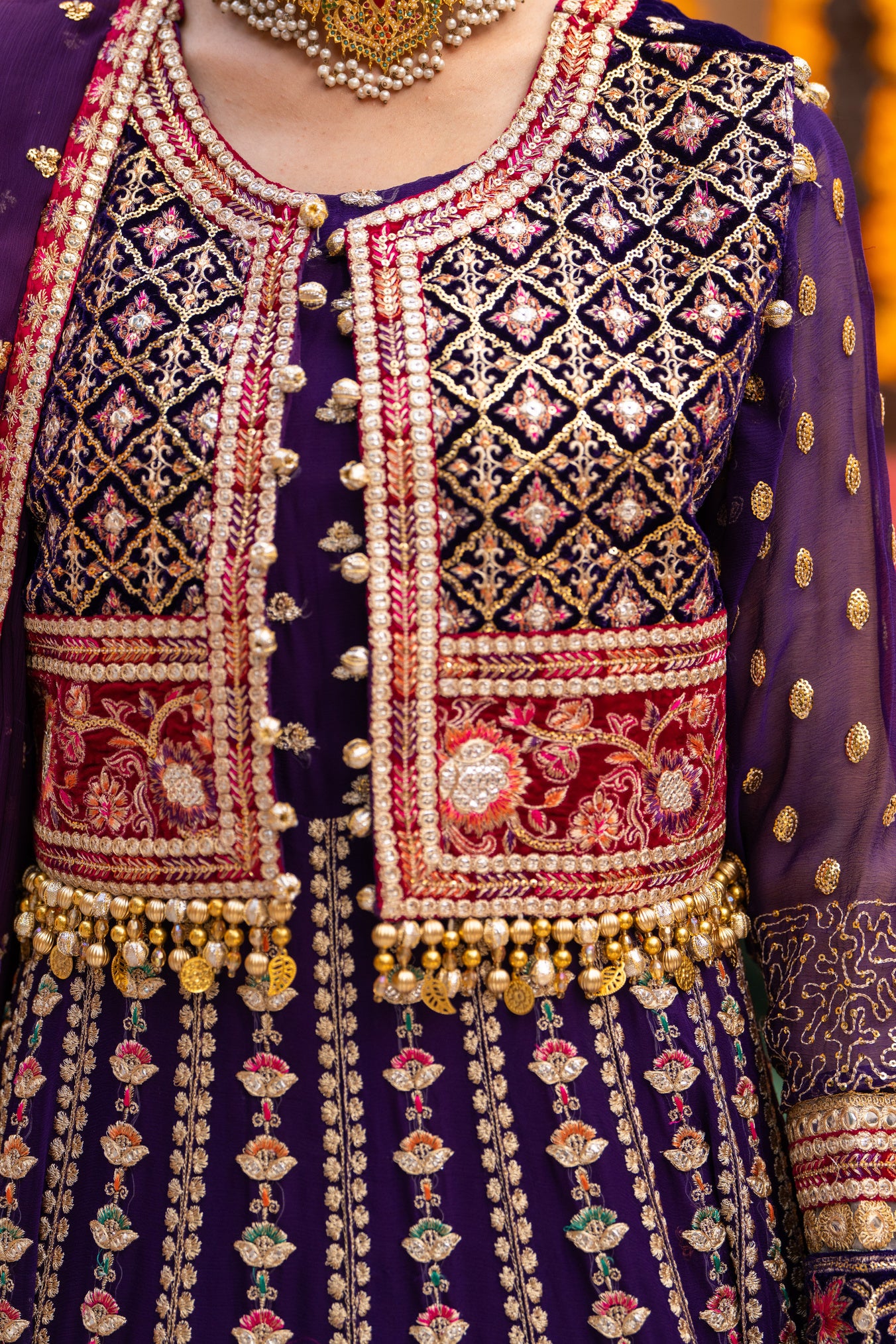 Turn heads in this luxurious maxi and jacket combination. The maxi is made from smooth chiffon, perfect for your evening affairs, while the velvet jacket adds a touch of richness. Embellished with intricate Panni work, Tilla, sequins, and lace details on the flares, it’s a perfect blend of elegance and tradition. The embroidered chiffon dupatta completes the look with a graceful finish.