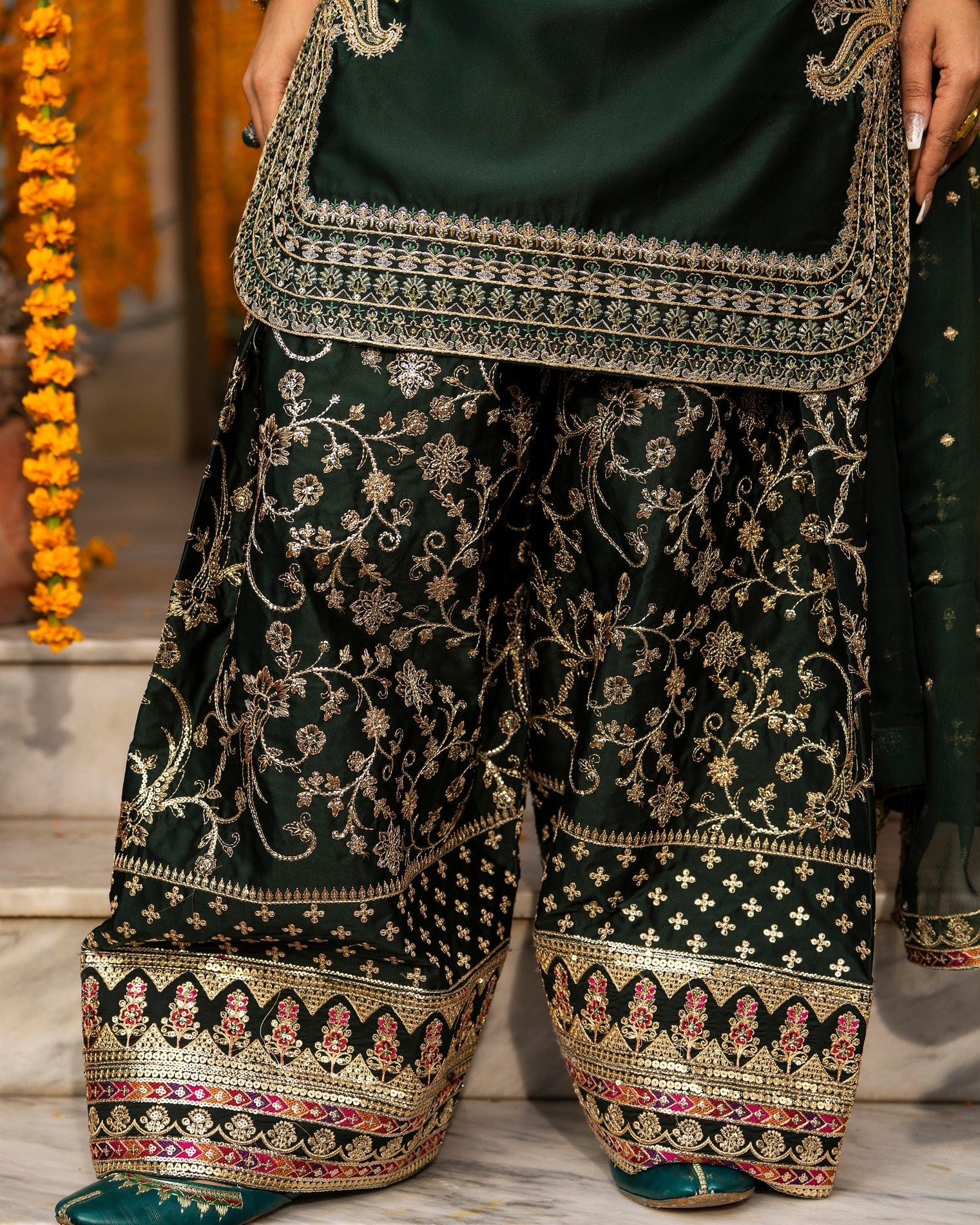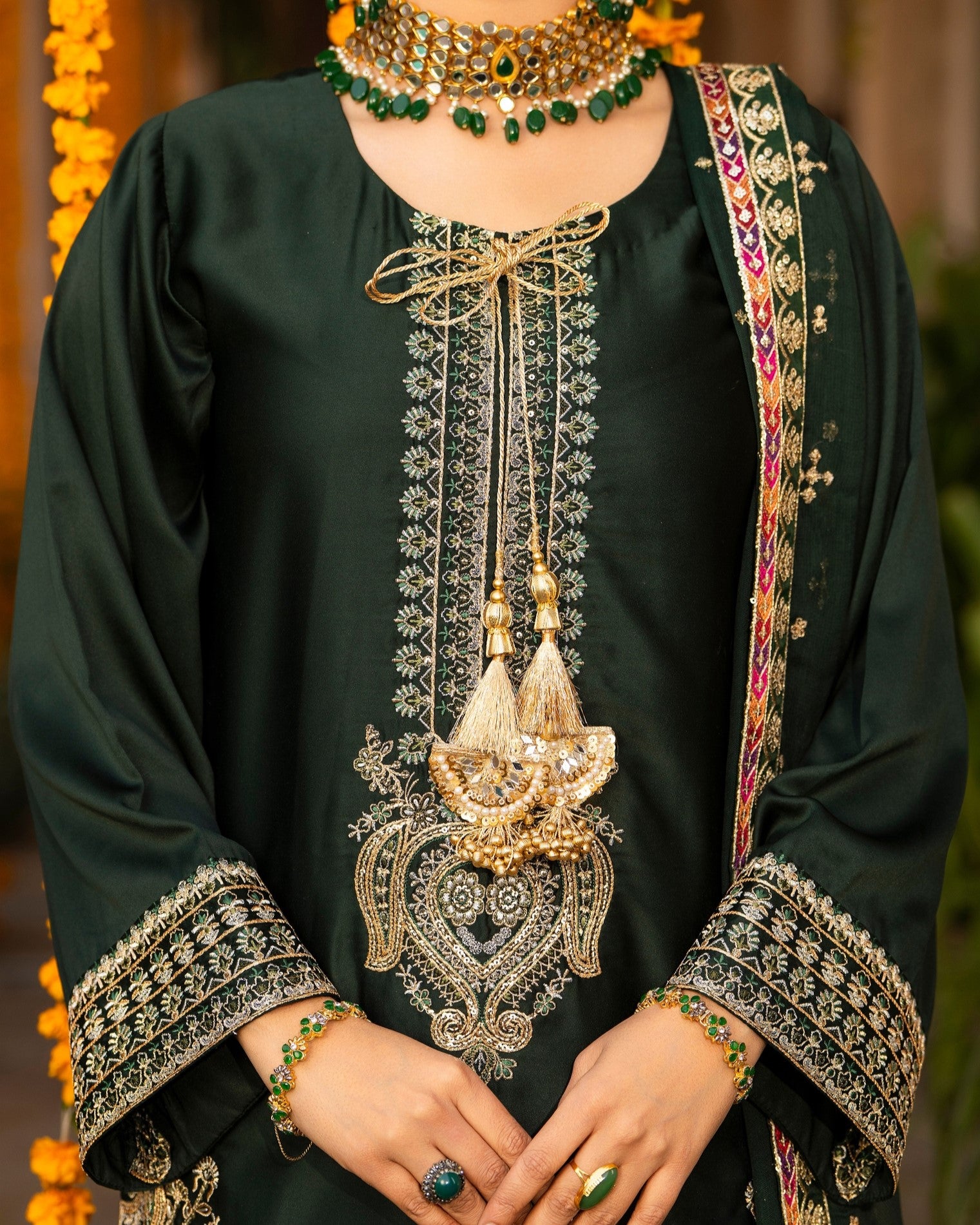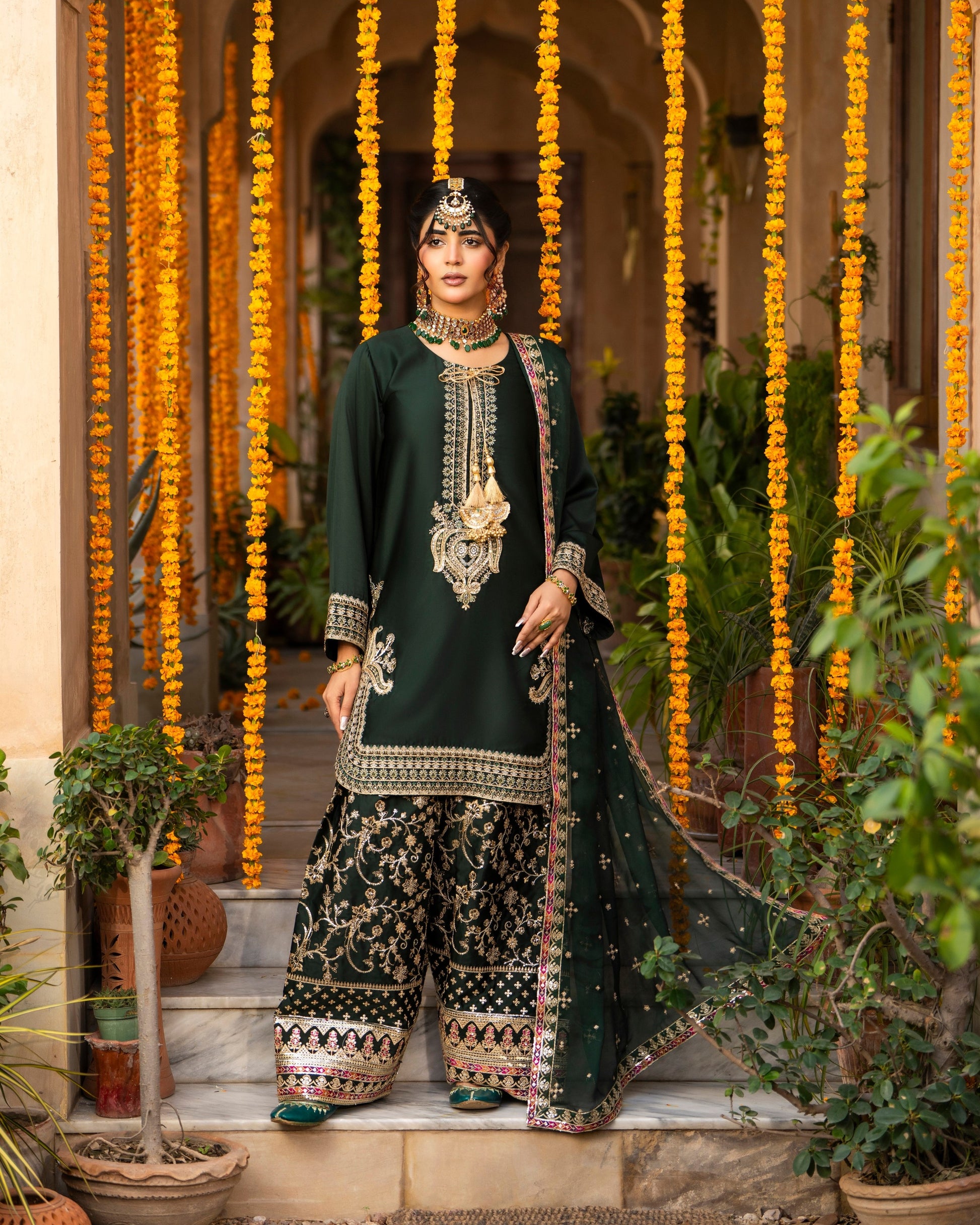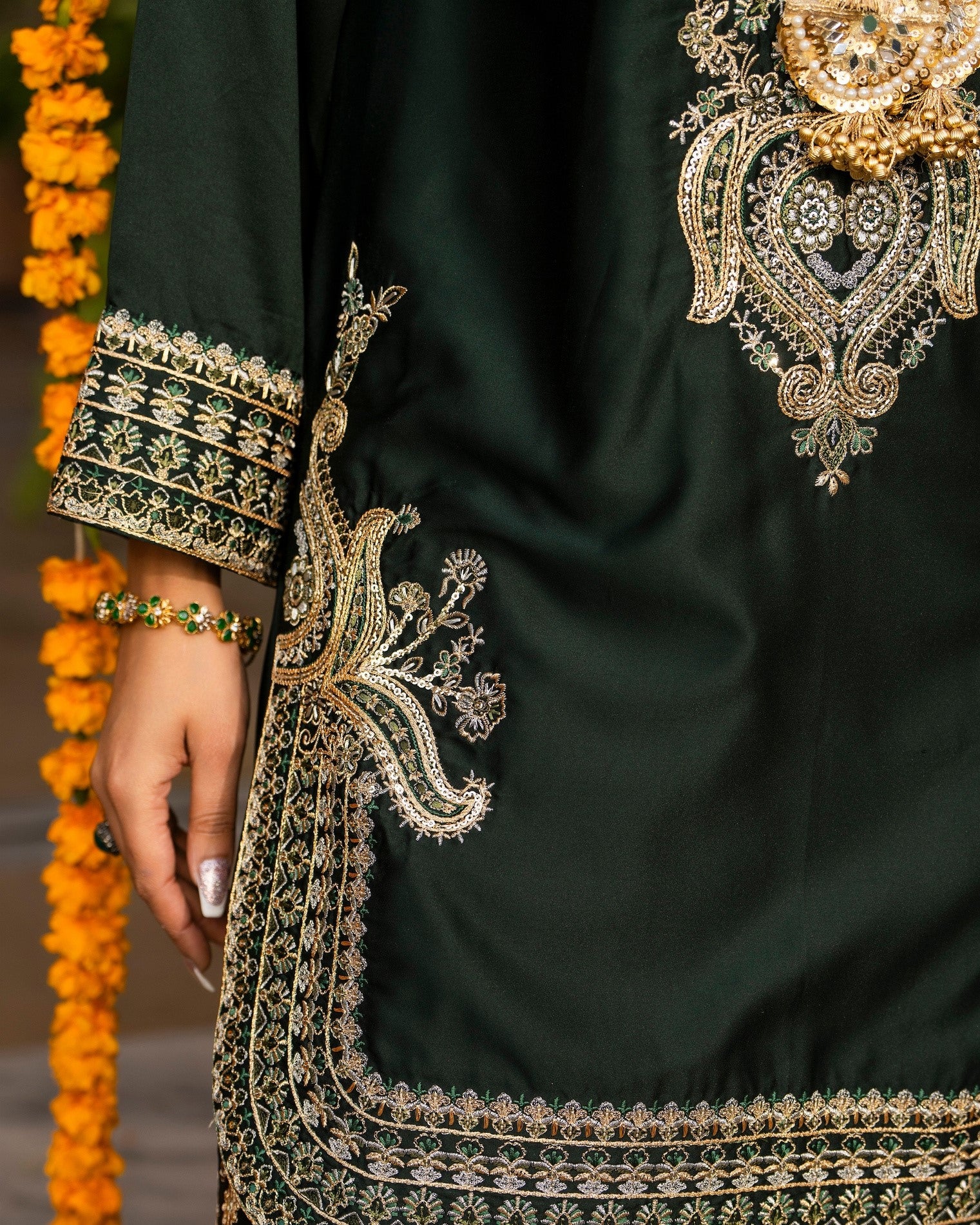 Discover the perfect look. Rich bottle green shades paired with detailed embroidery bring timeless elegance and cultural charm.