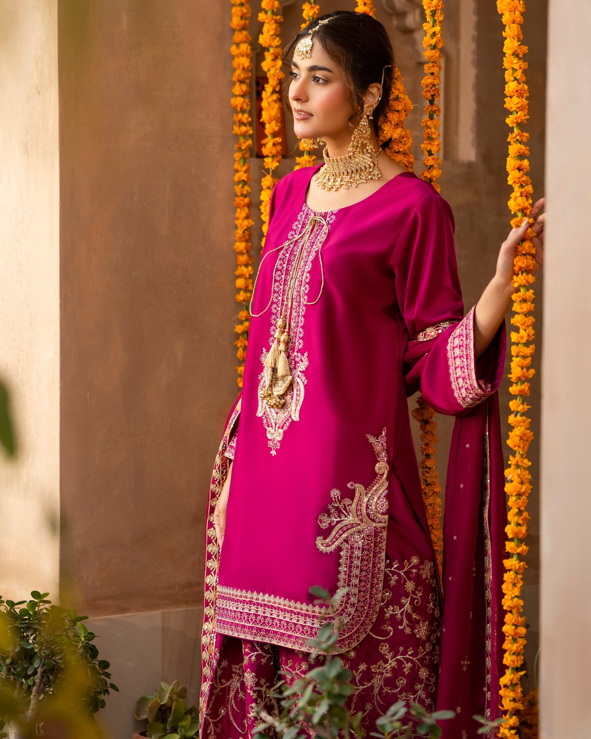 Discover the perfect look. Vibrant hot rose tones combined with classic embellishment make this outfit ideal for festive occasions.