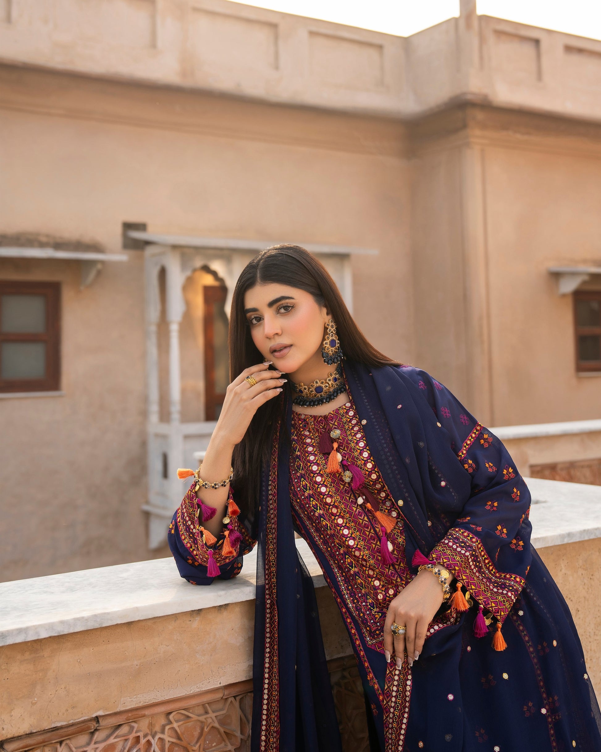 Shirt: Georgette chiffon long Balochi-style shirt with multi-thread and 9mm sequence embroidery, detailed with tussels, seep, and dori work.