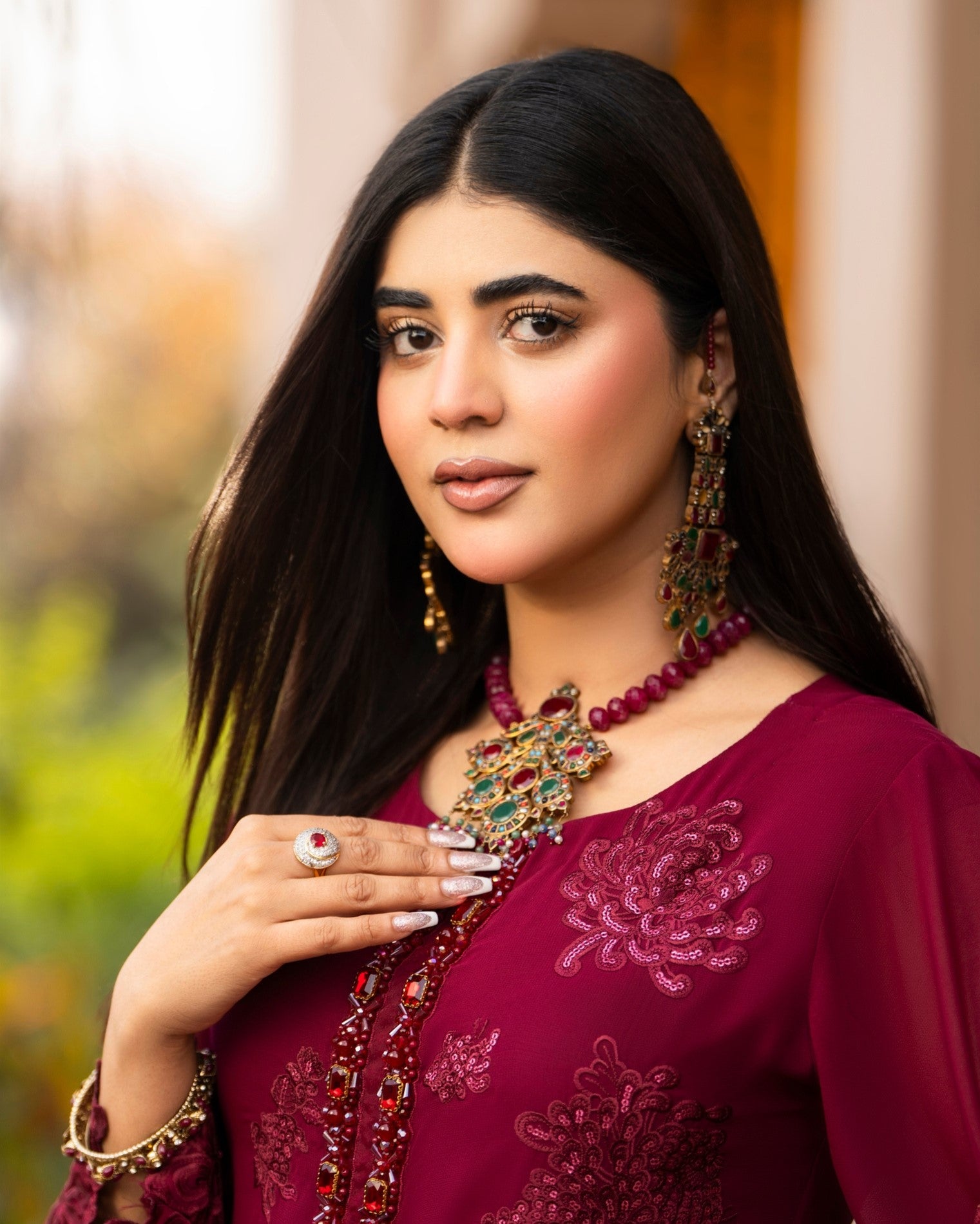 Discover the perfect look. Luxurious crimson velvet tones paired with delicate embroidery create a refined and graceful festive outfit.