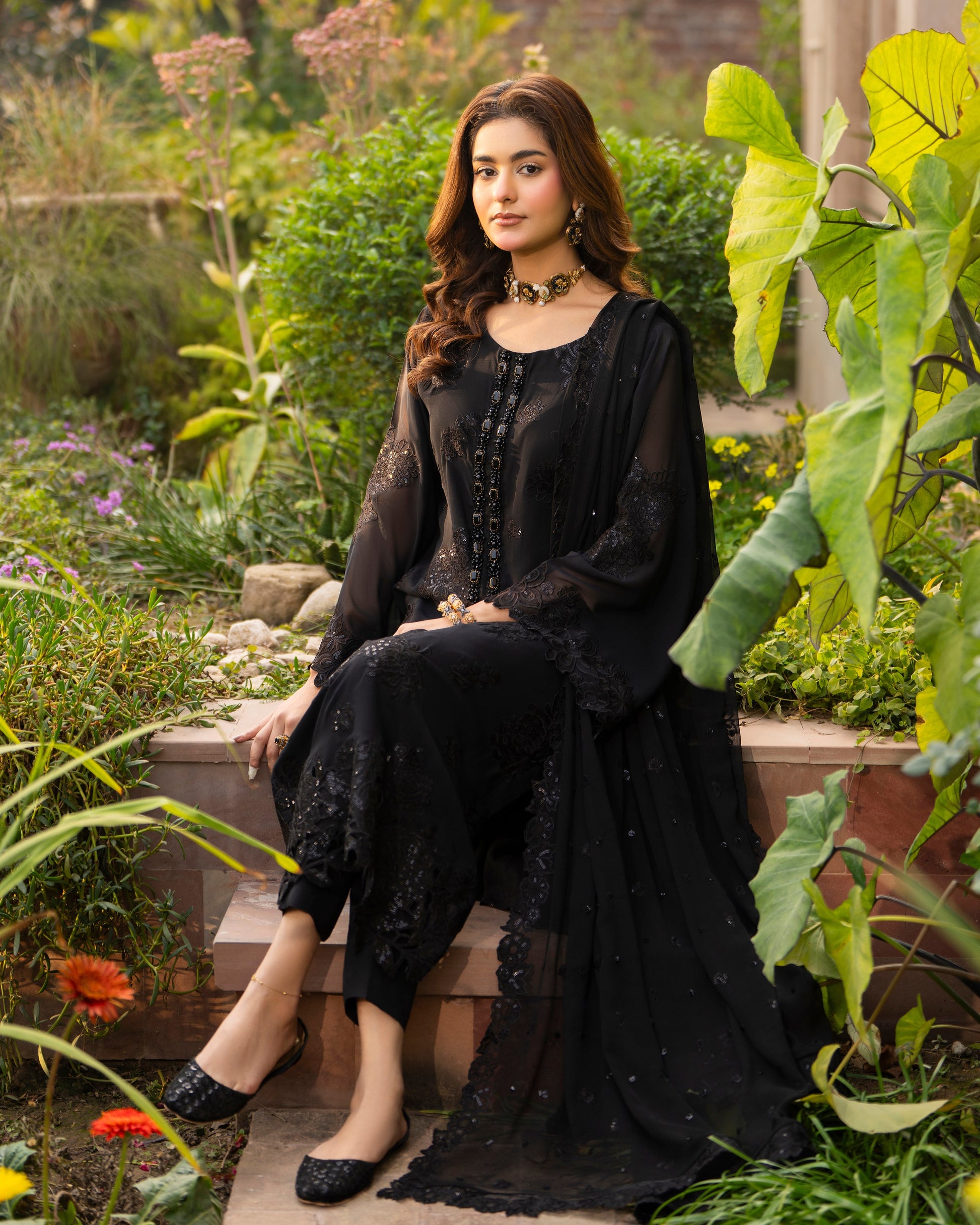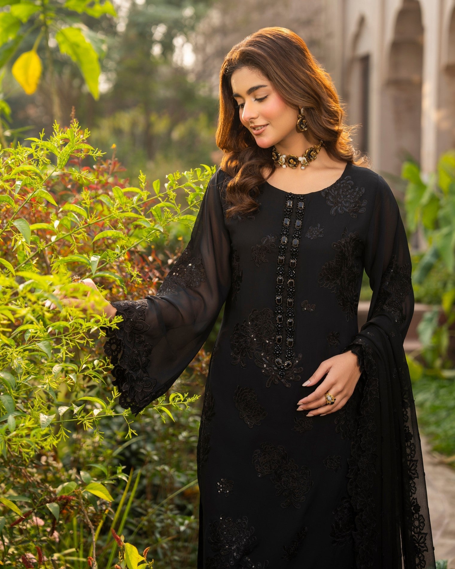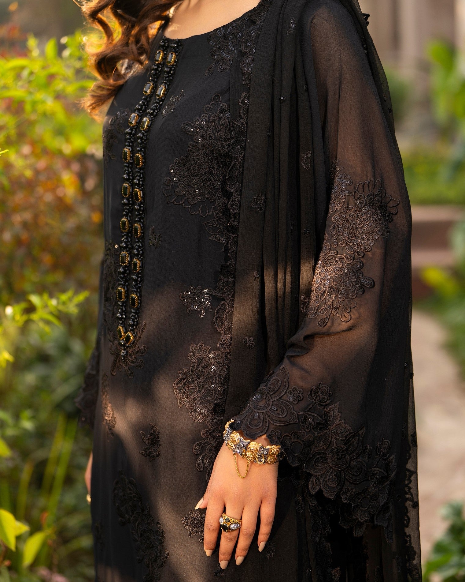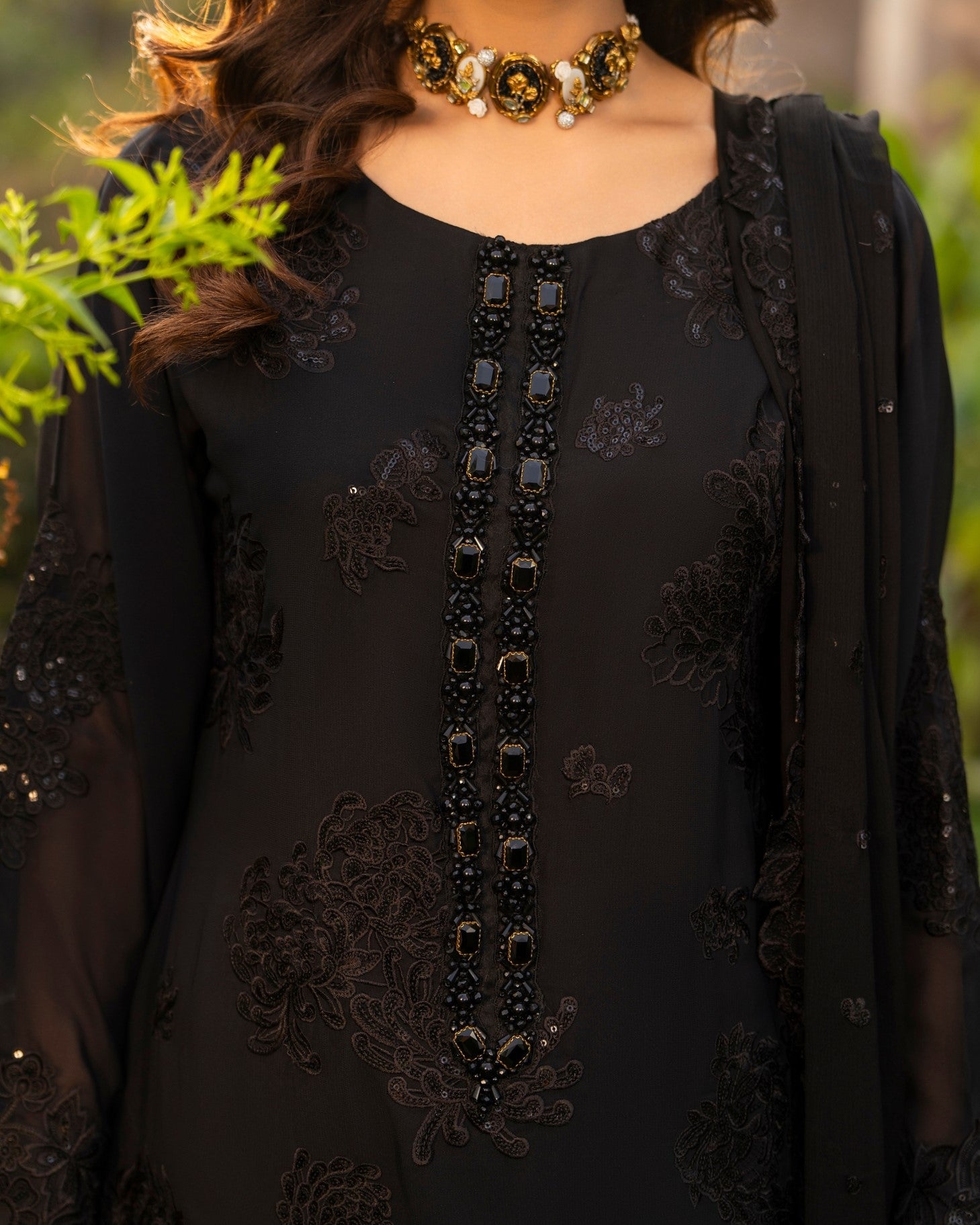 Discover the perfect look. Deep dark raven tones combined with fine adda work create a bold yet elegant ensemble ideal for evening wear and celebrations.