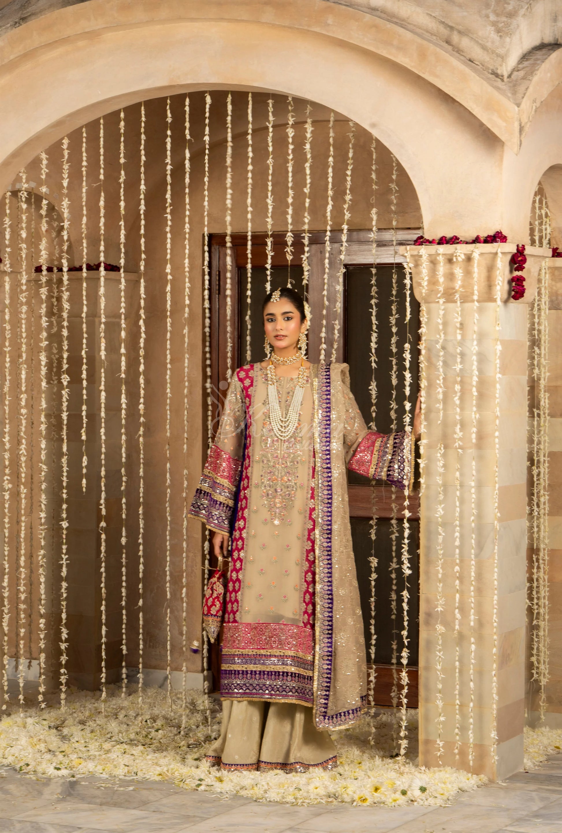 Sharara: Russian grip sharara detailed with embroidery and patch work, adding depth and refined elegance to the outfit.