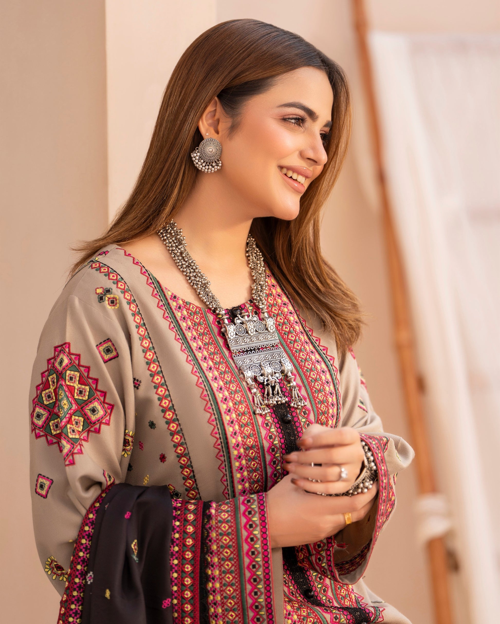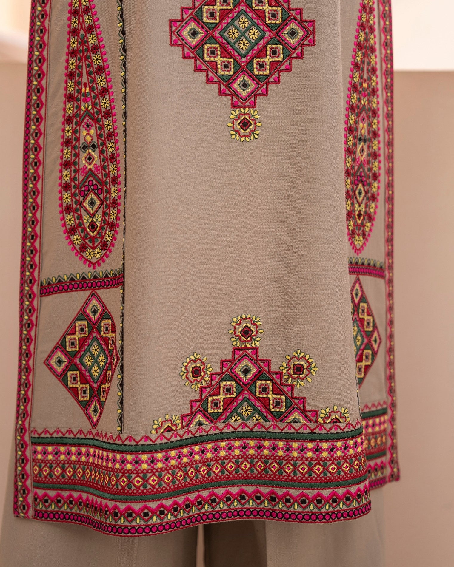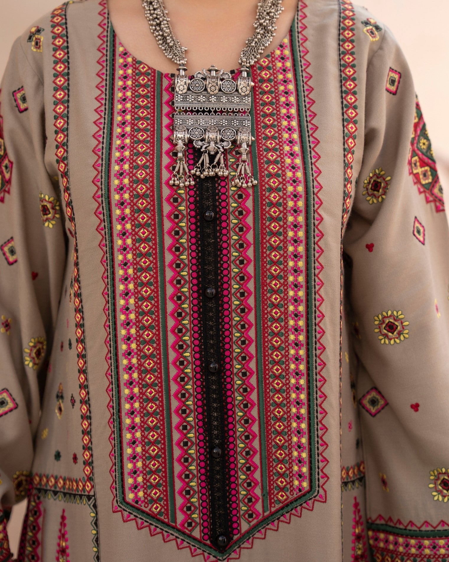 Discover the perfect look. Its soft Dhanak feel, elegant thread embroidery, and refined detailing make it an ideal winter outfit for casual gatherings, dawat wear, and everyday comfort. Designed for ease and style, it brings a polished charm to your wardrobe.