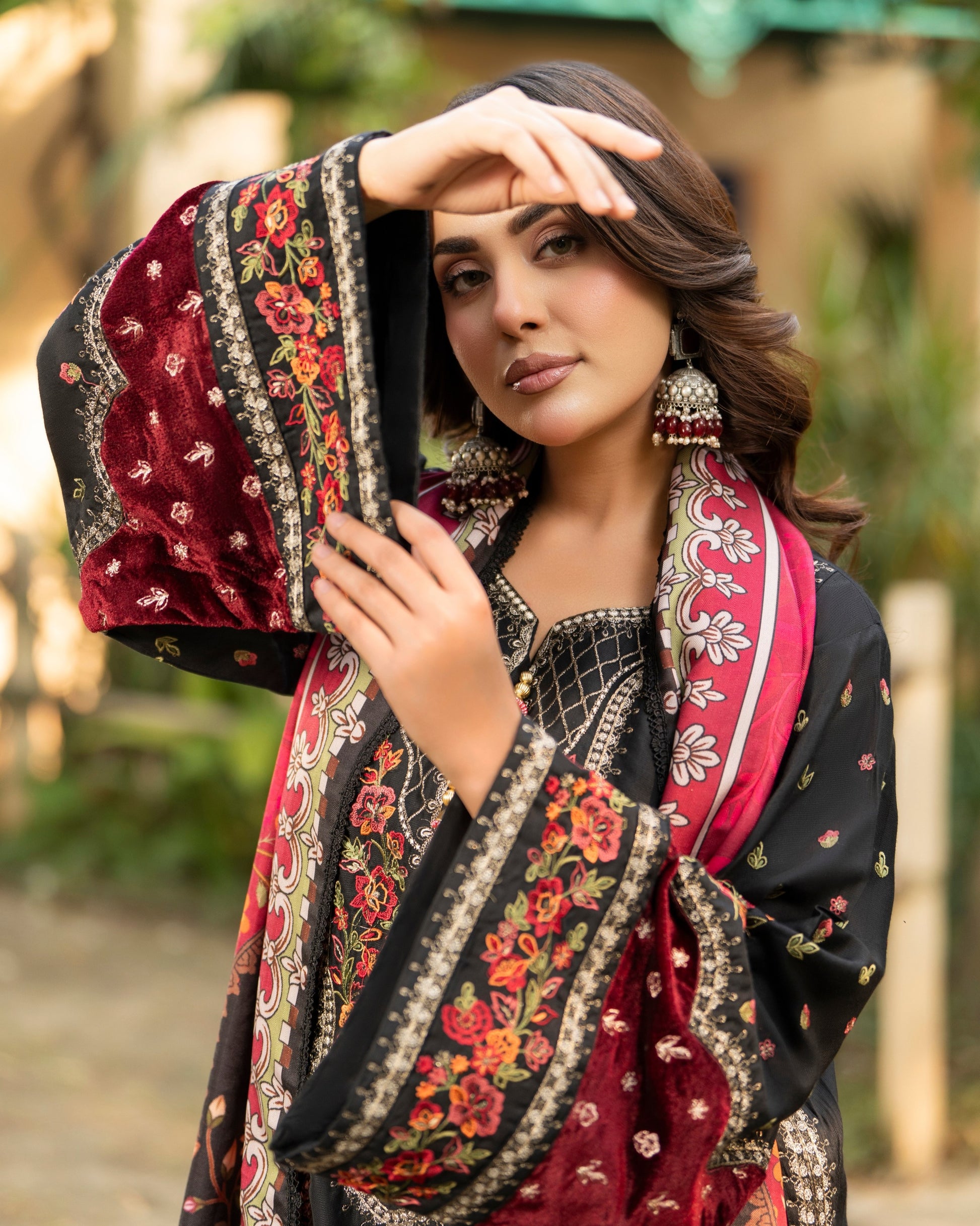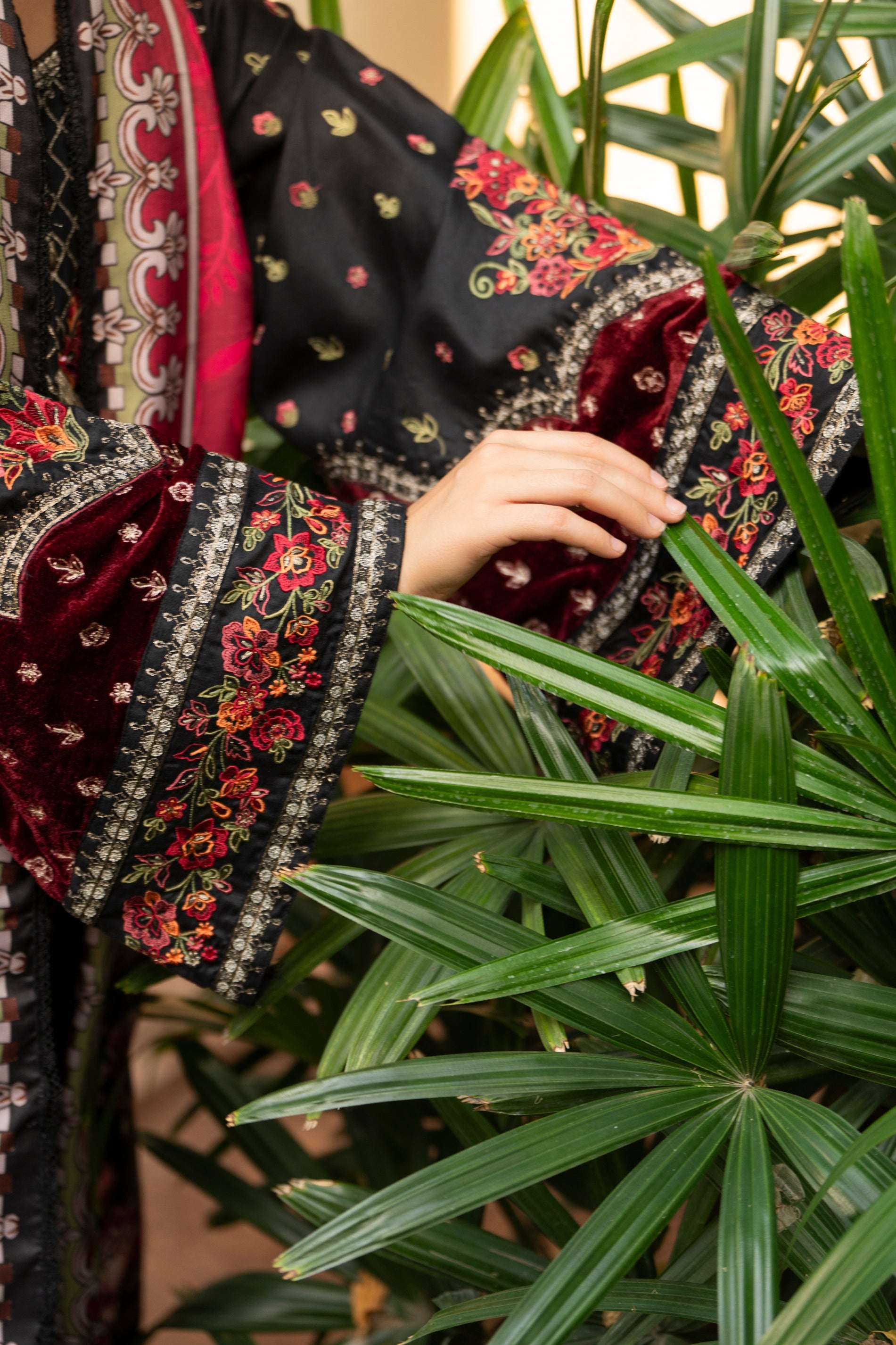 An elegant everyday look with a hint of luxury. The long kotrai shirt flows beautifully, while the velvet sleeve patches add a touch of richness — bringing a refined charm to casual wear.