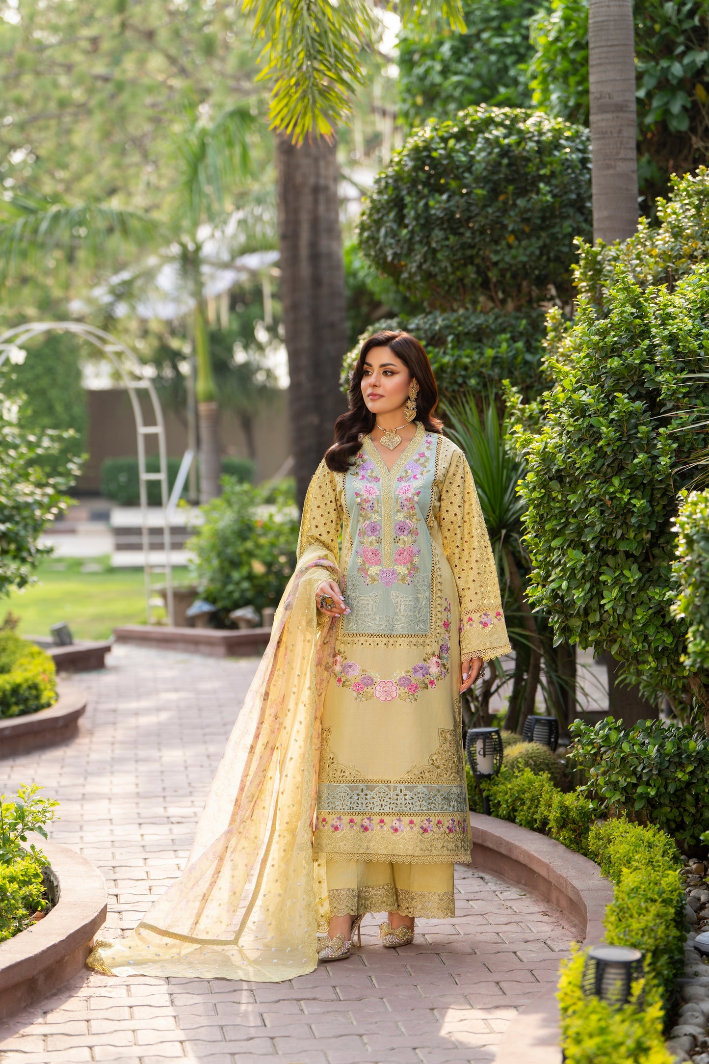 In Muted Mustard, this 3PC ready-to-wear ensemble presents a long shirt detailed with multi-thread neckline embroidery, lace work, Chikankari sleeves, and 3D laser organza border patches, elevating it to a statement piece. The digital-printed dupatta with a 10-inch sequin border adds shimmering contrast, while the loose trousers with embroidered bottoms and an elasticized waistband offer effortless movement and a refined finish.
