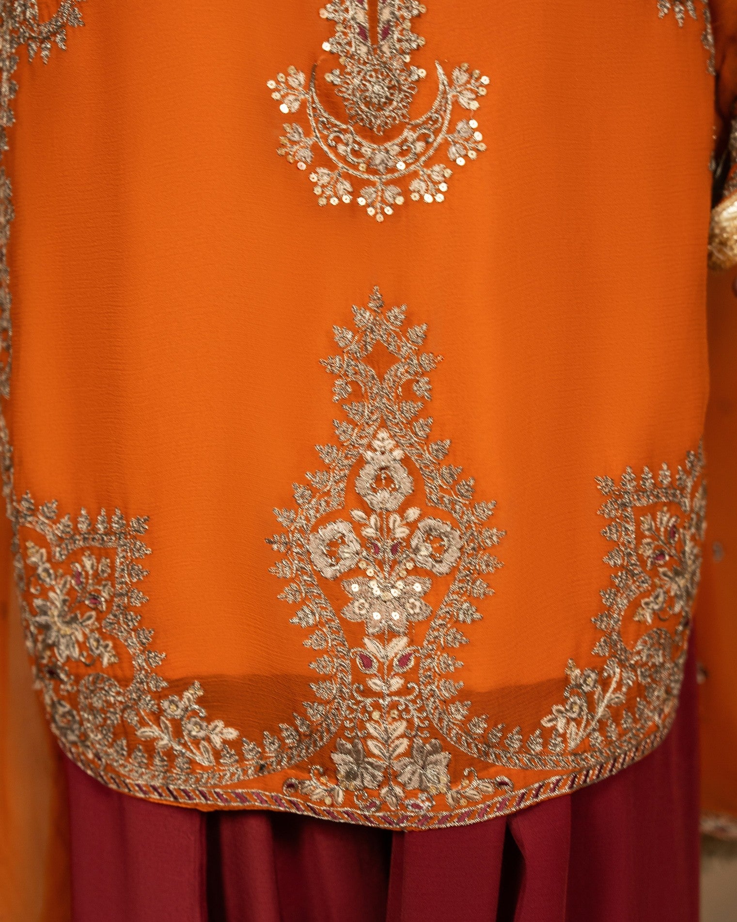 Shirt: Crinkle chiffon shirt with delicate tilla embroidery and dori neckline finish