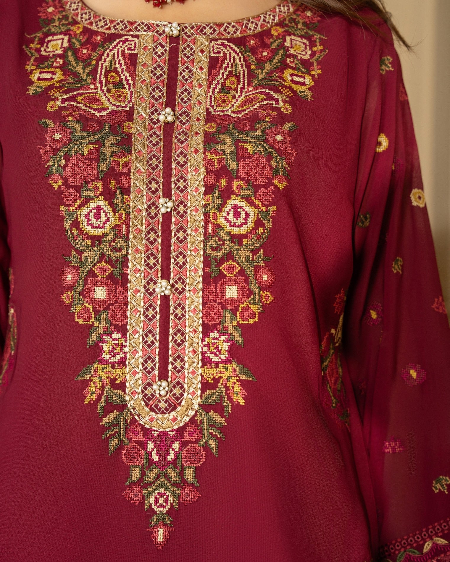 Shirt: Georgette chiffon shirt with cross-stitch embroidery and metal buttons on neckline