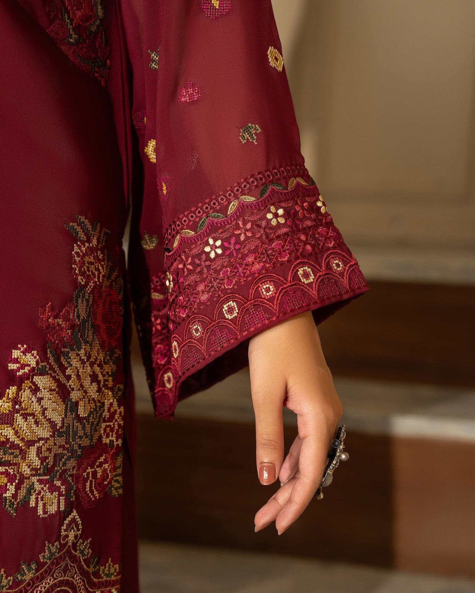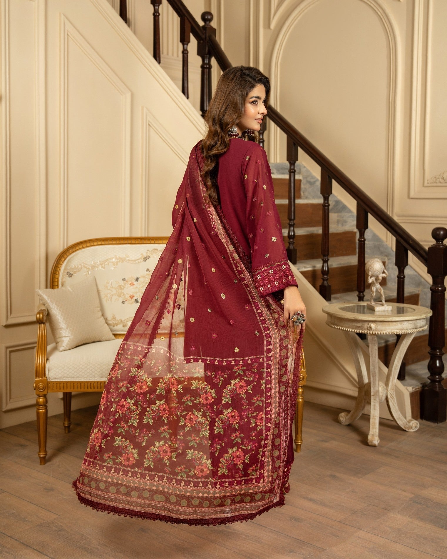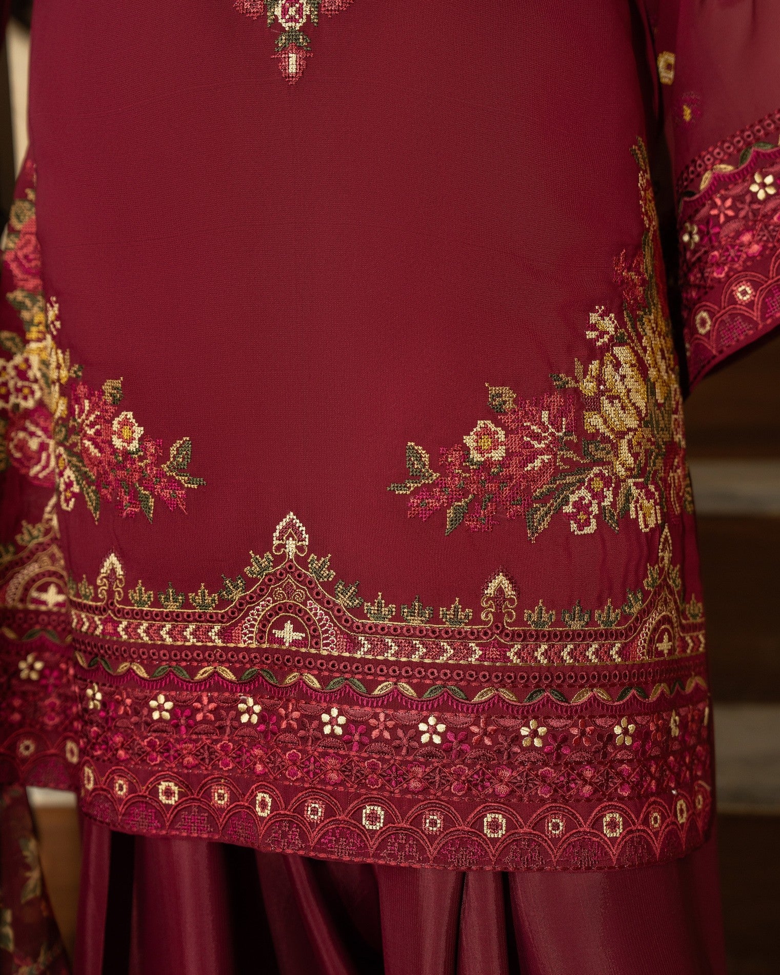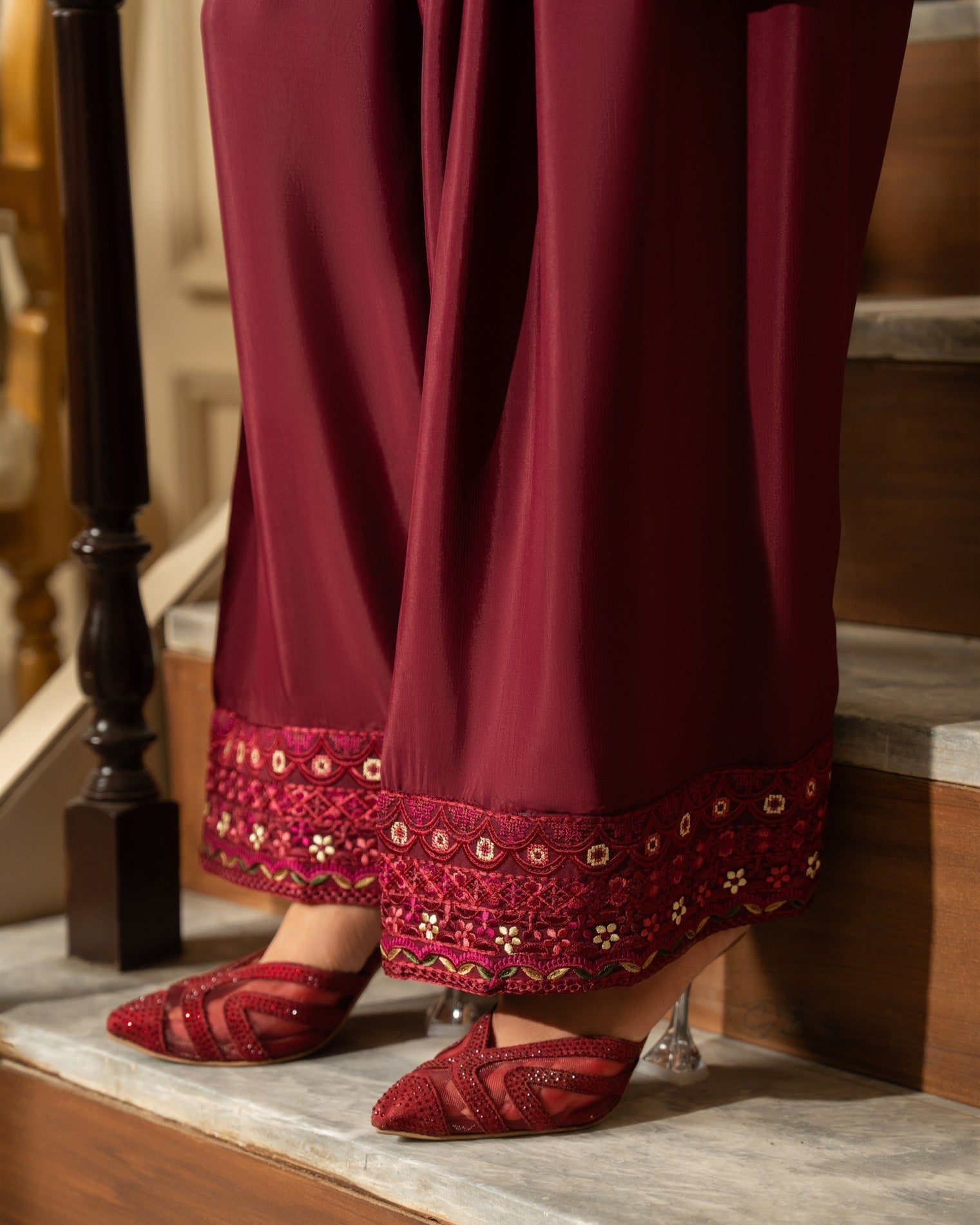 Grace meets comfort in this striking farshi shalwar ensemble. Designed from premium-quality fabrics, it brings together sophistication and breathability, making it ideal for festive gatherings, cultural events, and formal occasions. The intricate embroidery and fine details reflect timeless craftsmanship with a modern flair.