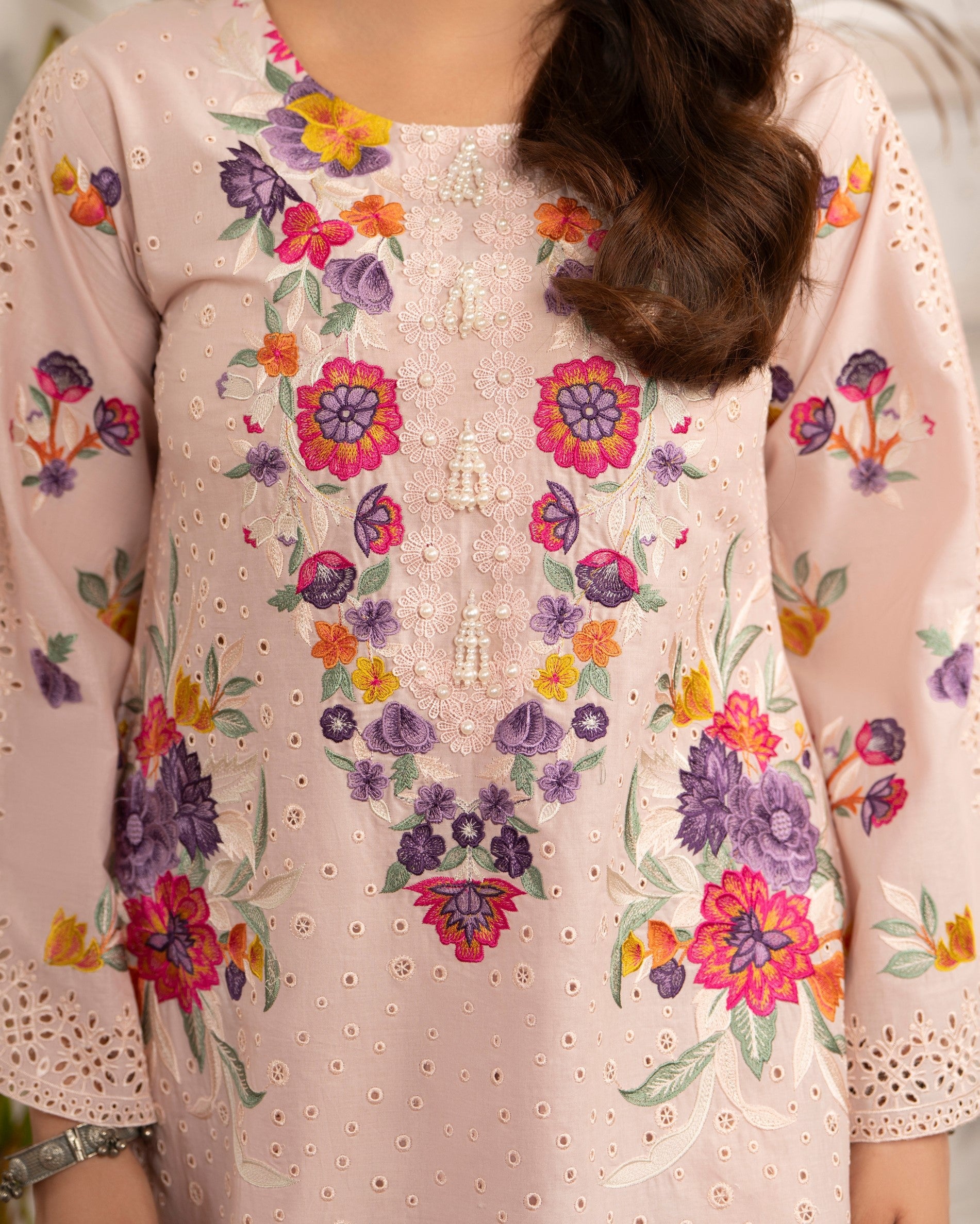 Get ready to turn heads in this 3PC ready-to-wear ensemble! Featuring a beautiful cotton short round shirt with multi thread work embroidery and a cotton tulip shalwar, paired with a stunning printed chiffon dupatta with all around lace, this ensemble is perfect for any occasion. Stand out from the crowd in this exquisitely detailed design.