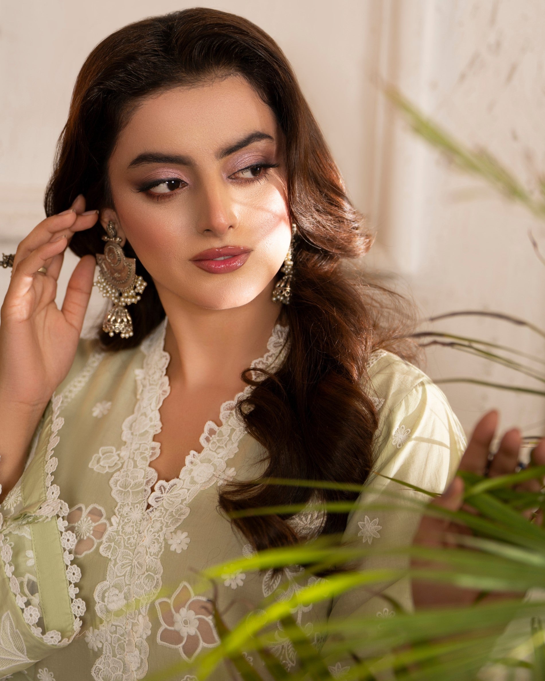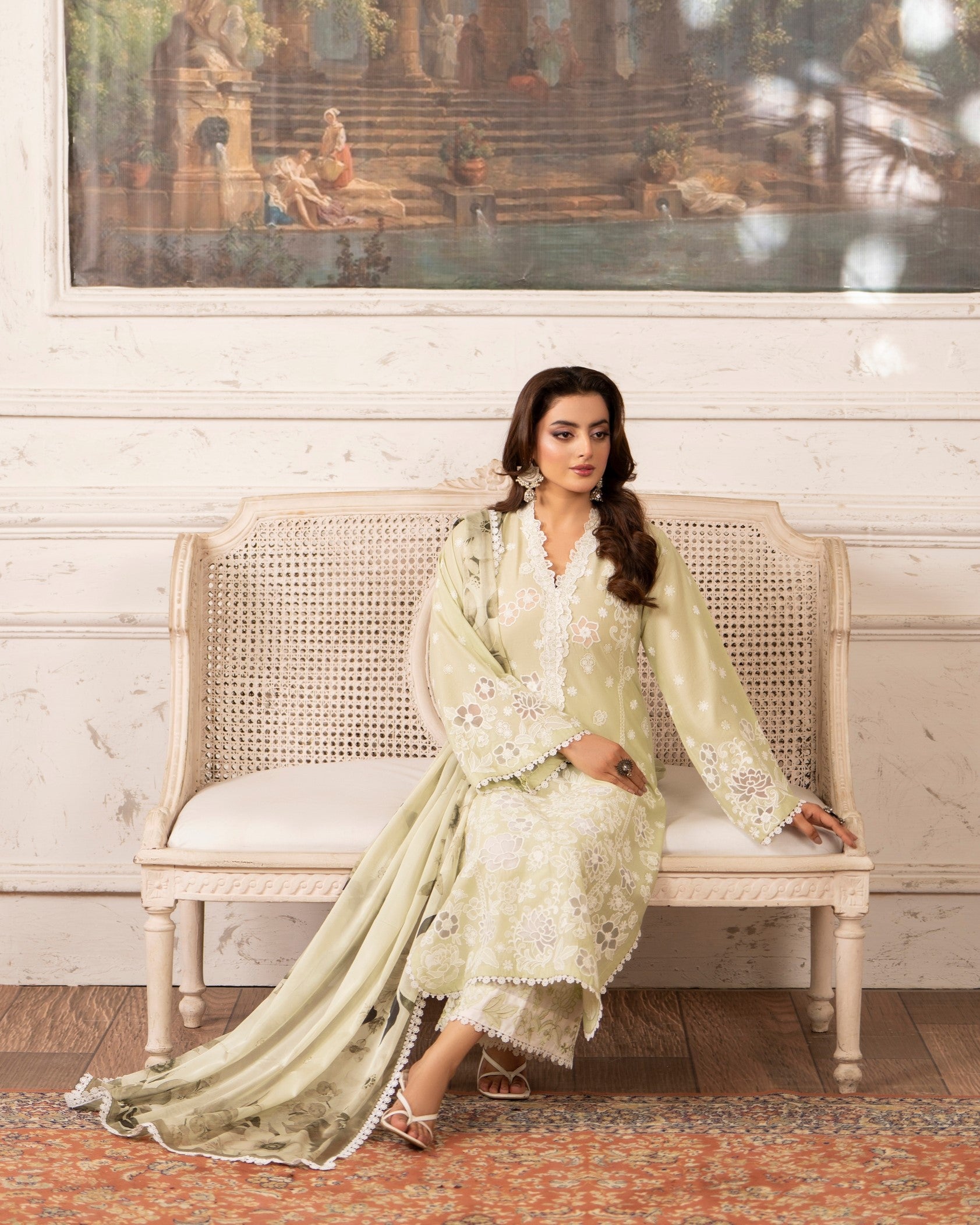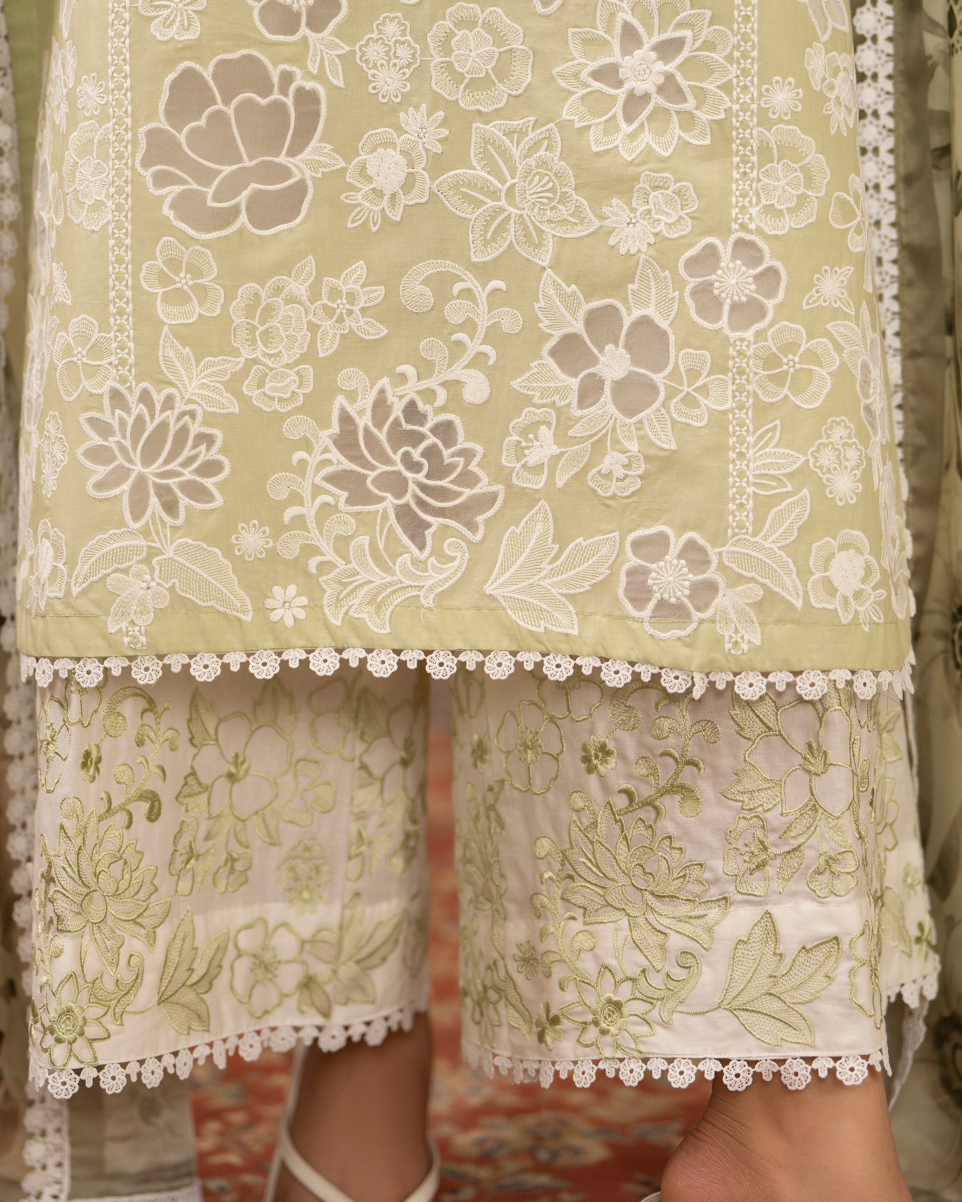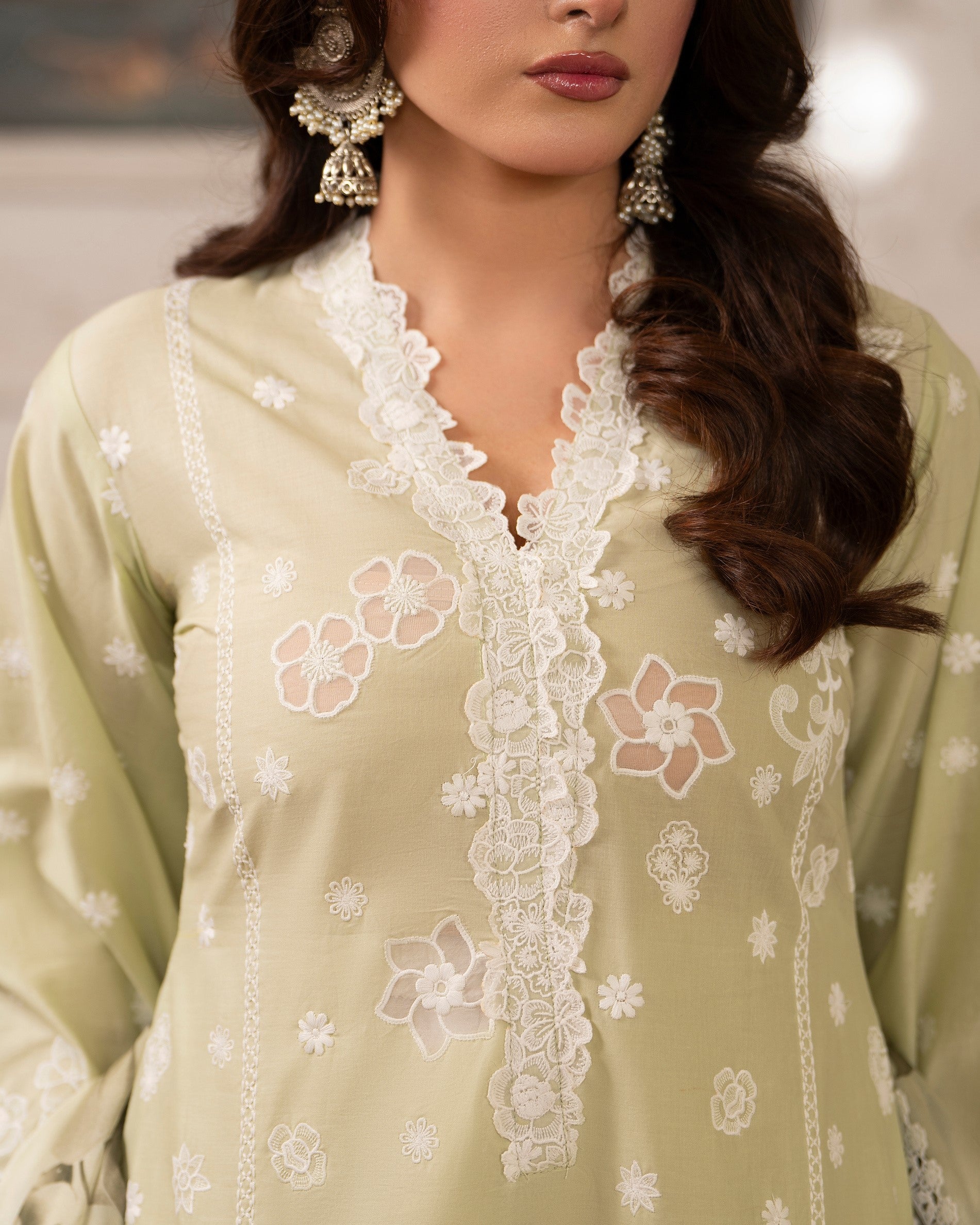 Get ready to turn heads in this 3PC ready-to-wear ensemble! Featuring a beautiful cotton medium length high neck shirt with organza cutwork and 3D flower work and a cotton loose bottom trouser, paired with a stunning matte chiffon printed dupatta, this ensemble is perfect for any occasion. Stand out from the crowd in this exquisitely detailed design.