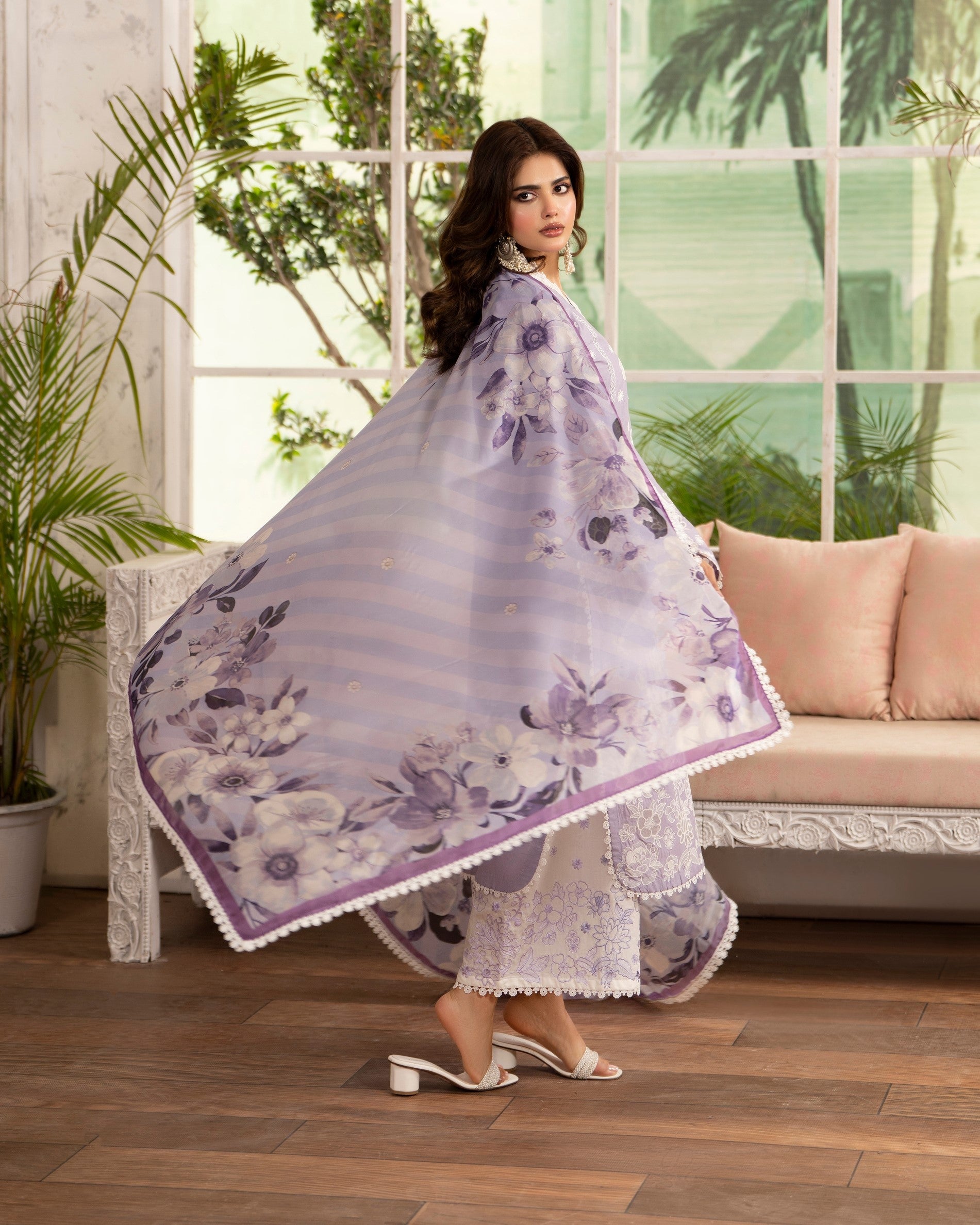 Get ready to turn heads in this 3PC ready-to-wear ensemble! Featuring a beautiful cotton medium length high neck shirt with organza cutwork and 3D flower work and a cotton loose bottom trouser, paired with a stunning matte chiffon printed dupatta, this ensemble is perfect for any occasion. Stand out from the crowd in this exquisitely detailed design.