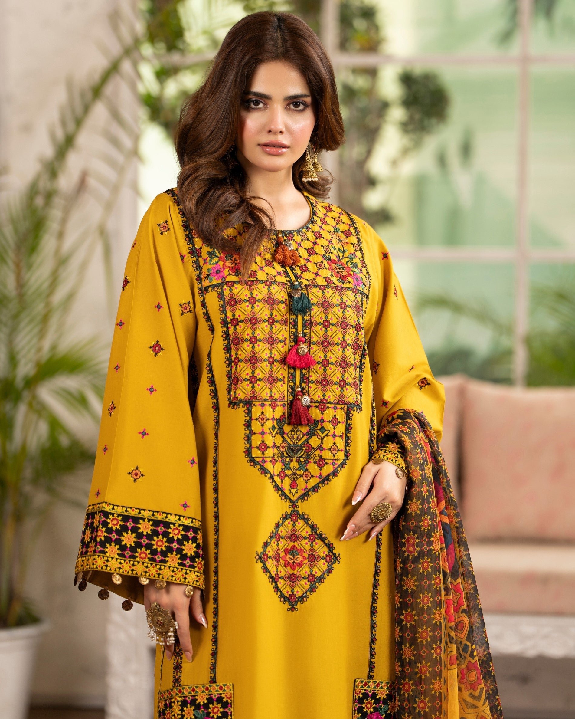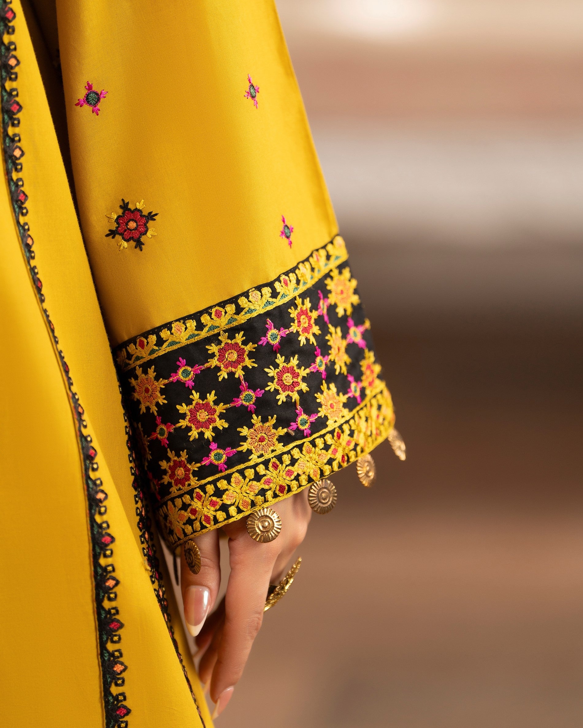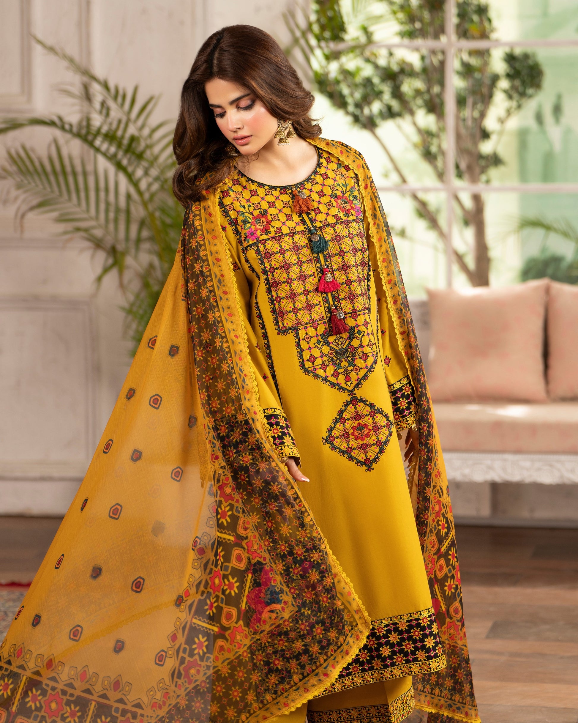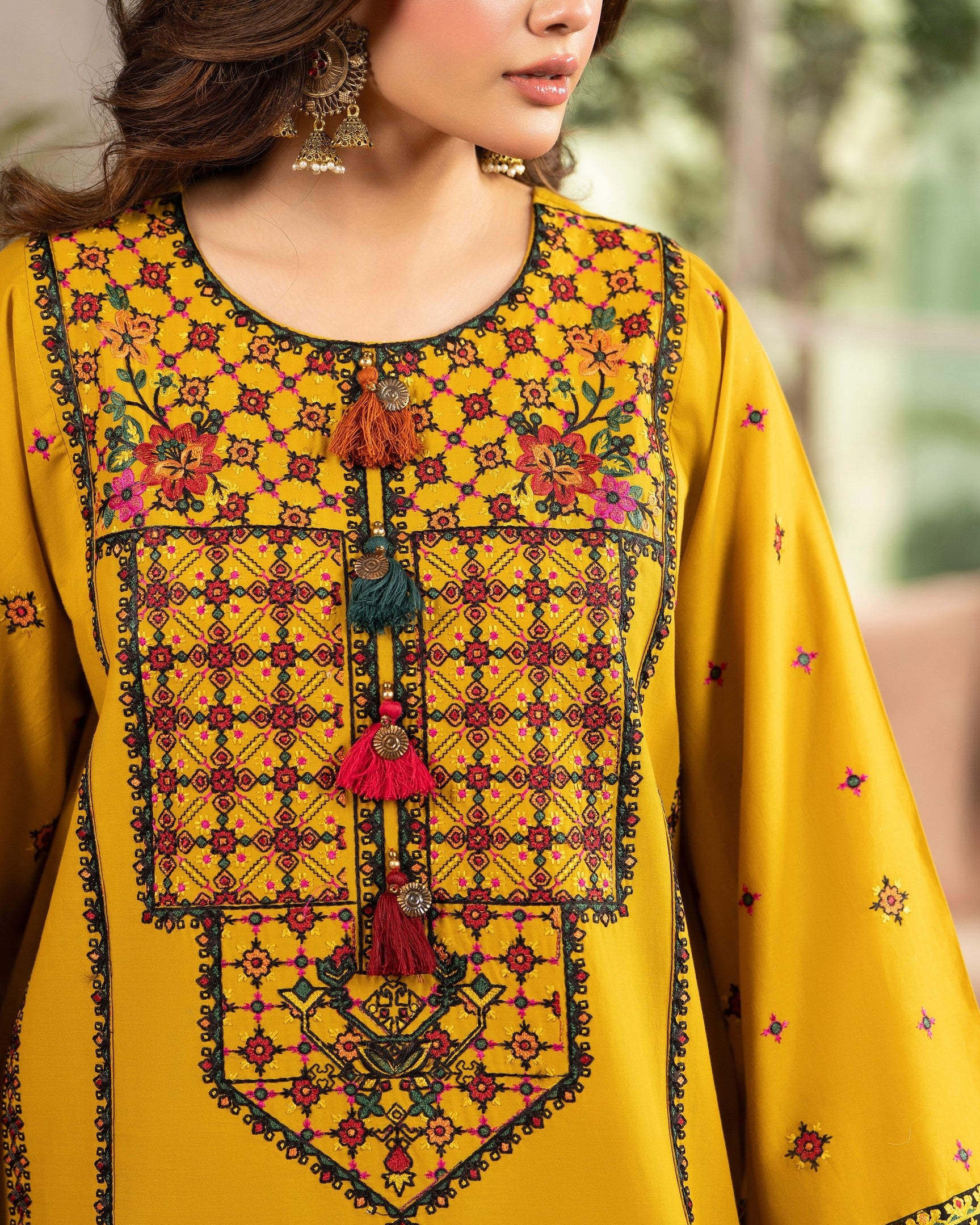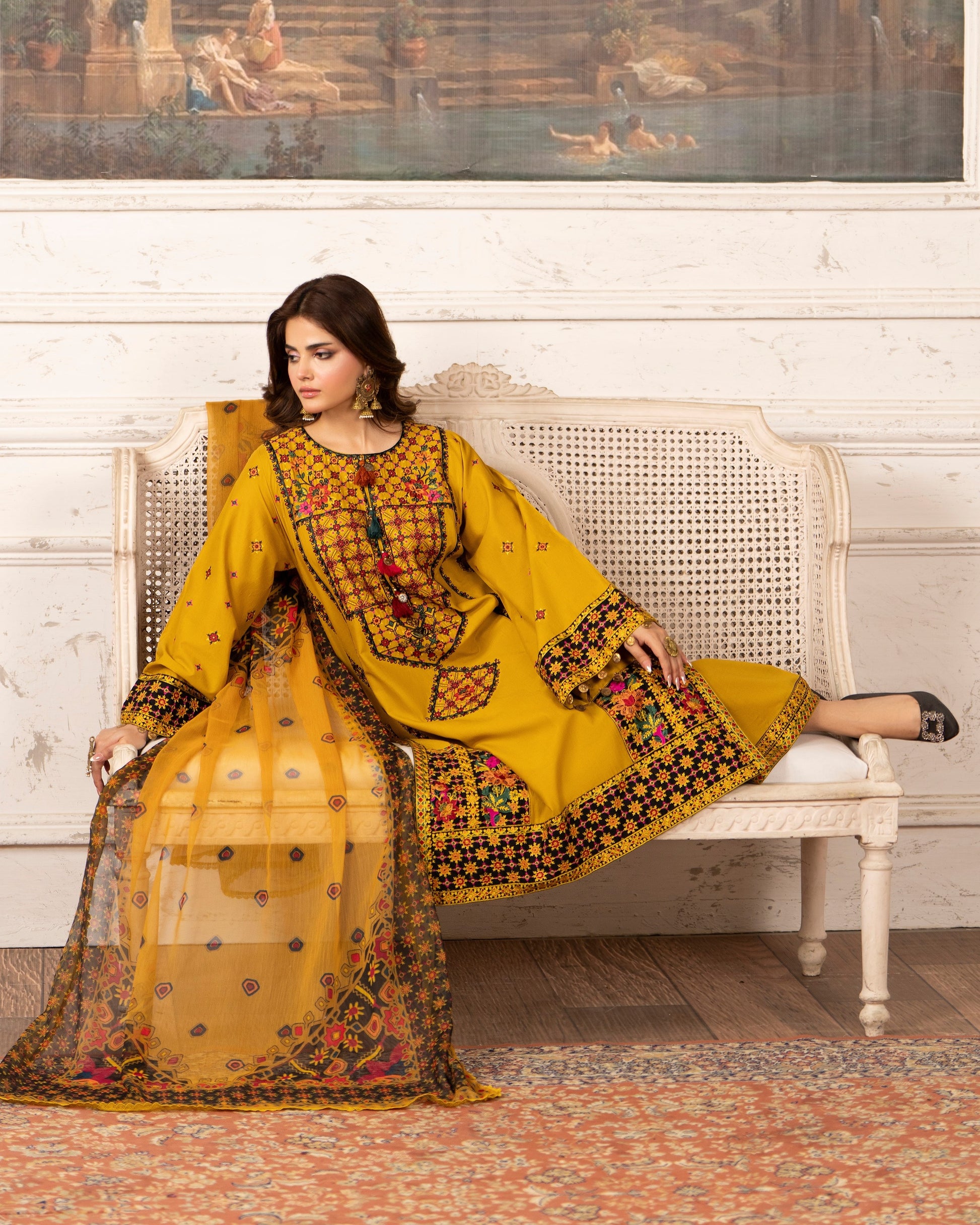 Get ready to turn heads in this 3PC ready-to-wear ensemble! Featuring a beautiful cotton medium length shirt with Sindhi embroidery and multi thread stitching, tussels on neckline and sleeves and a cotton loose bottom trouser, paired with a stunning printed crinkle chiffon dupatta with all around lace, this ensemble is perfect for any occasion. Stand out from the crowd in this exquisitely detailed design.