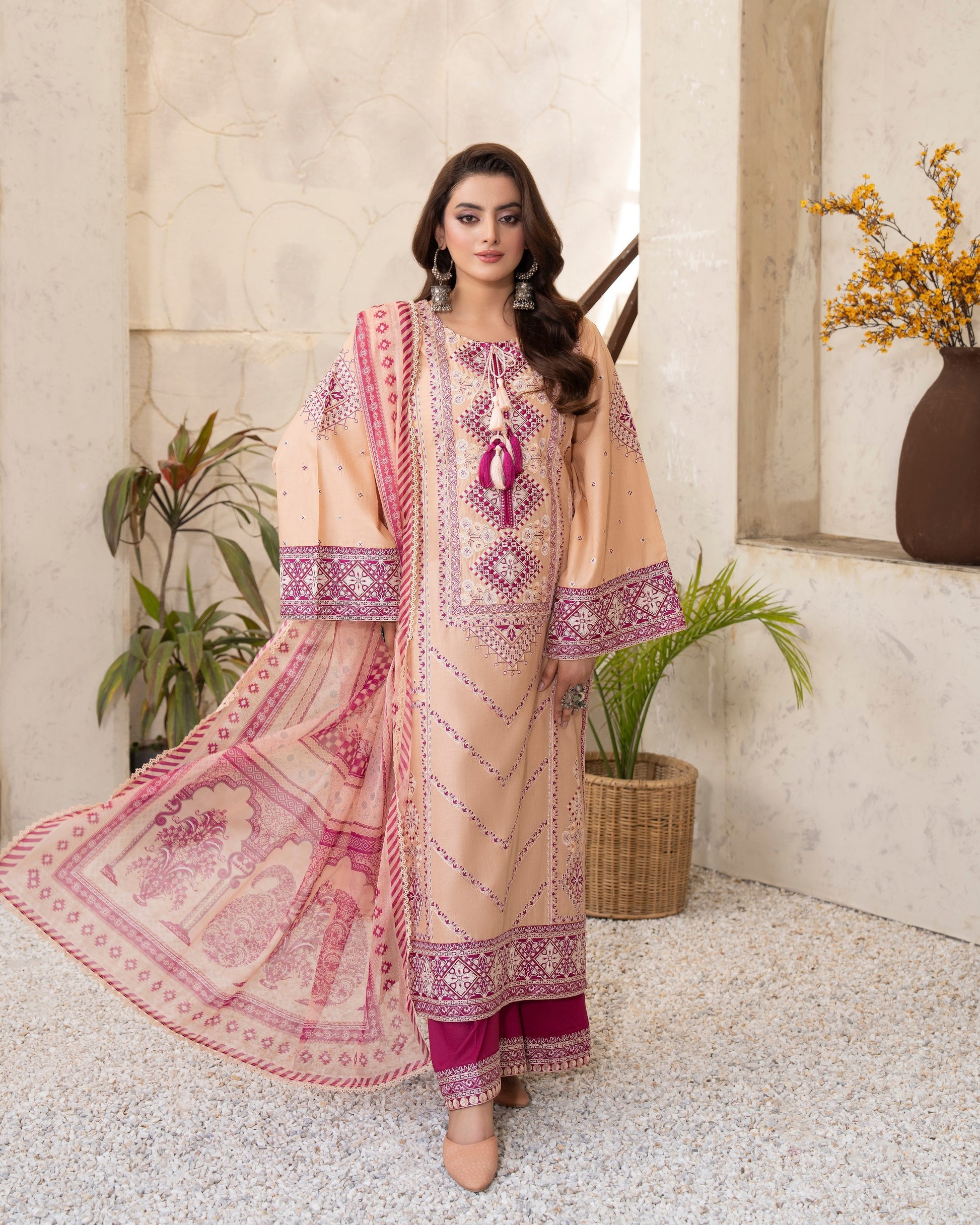 Get ready to turn heads in this 3PC ready-to-wear ensemble! Featuring a beautiful long cotton shirt with multi thread embroidery, applique and tussels on neckline and a loose bottom trouser, paired with a stunning printed chiffon dupatta with all around lace, this ensemble is perfect for any occasion. Stand out from the crowd in this exquisitely detailed design.