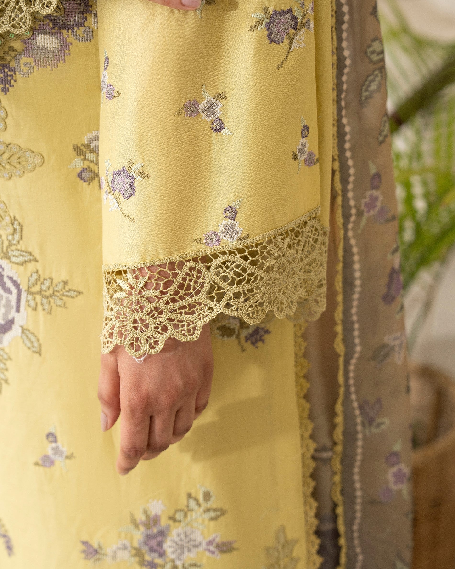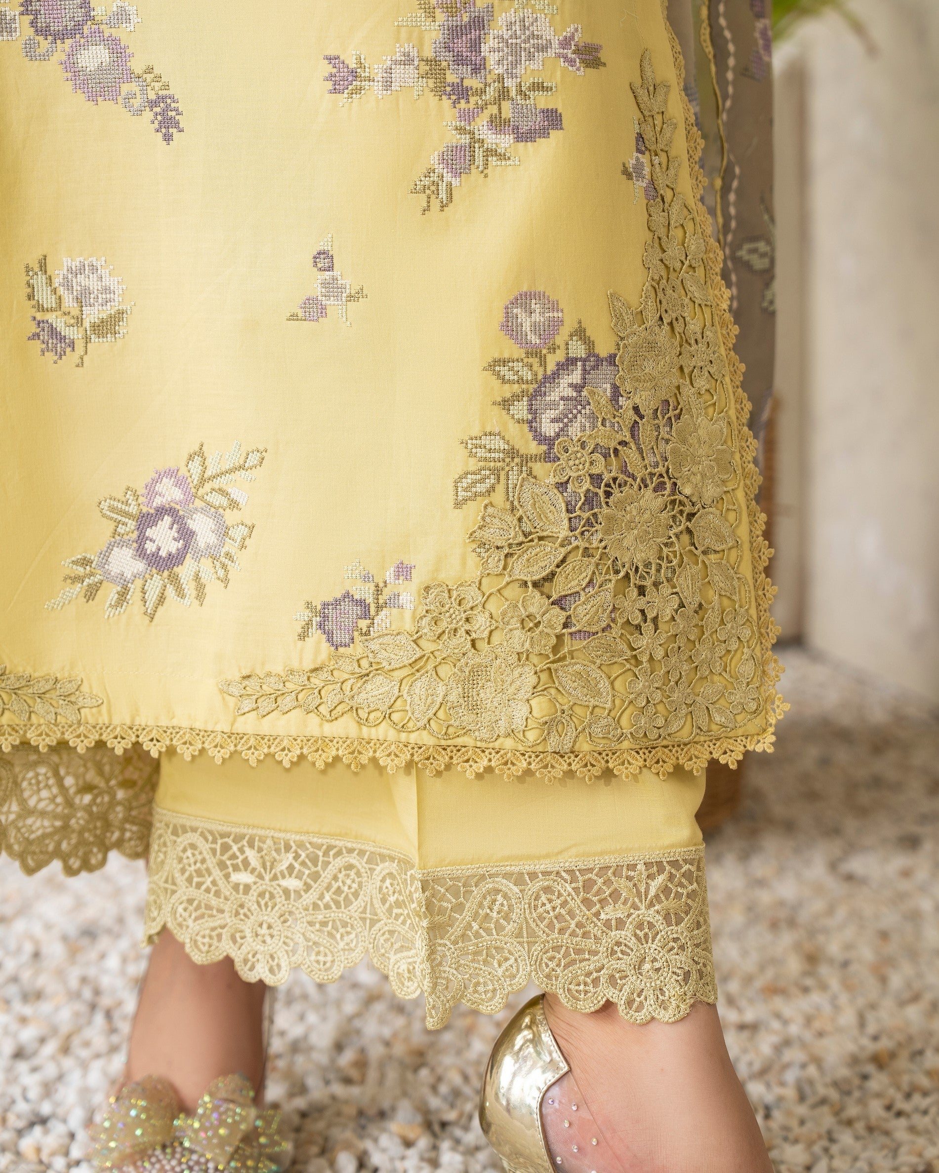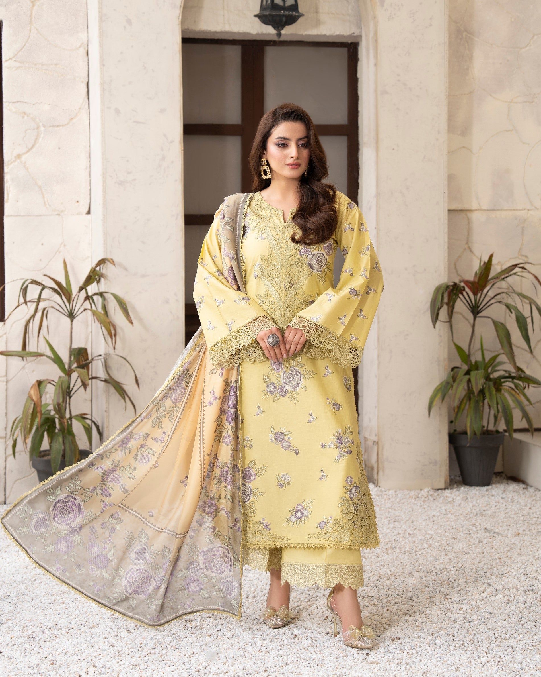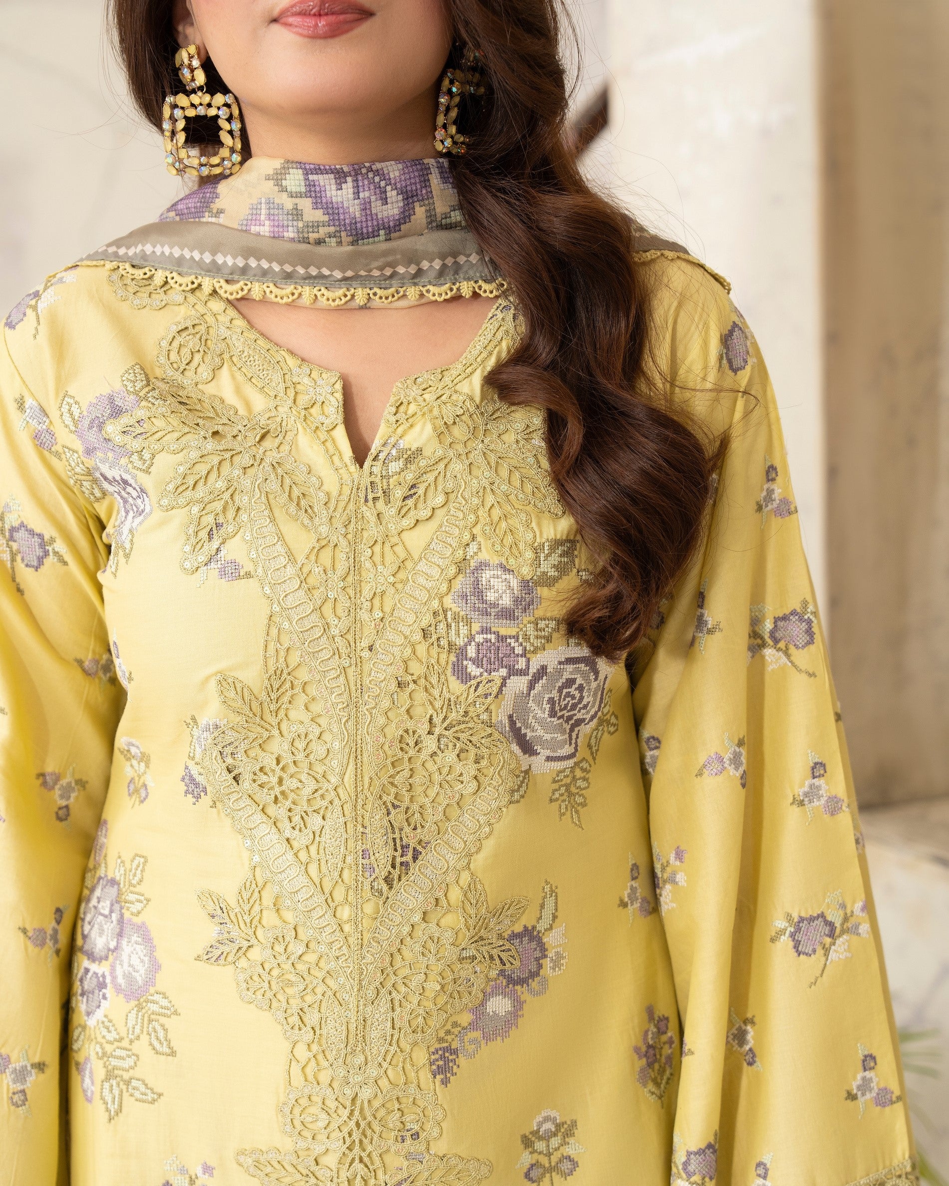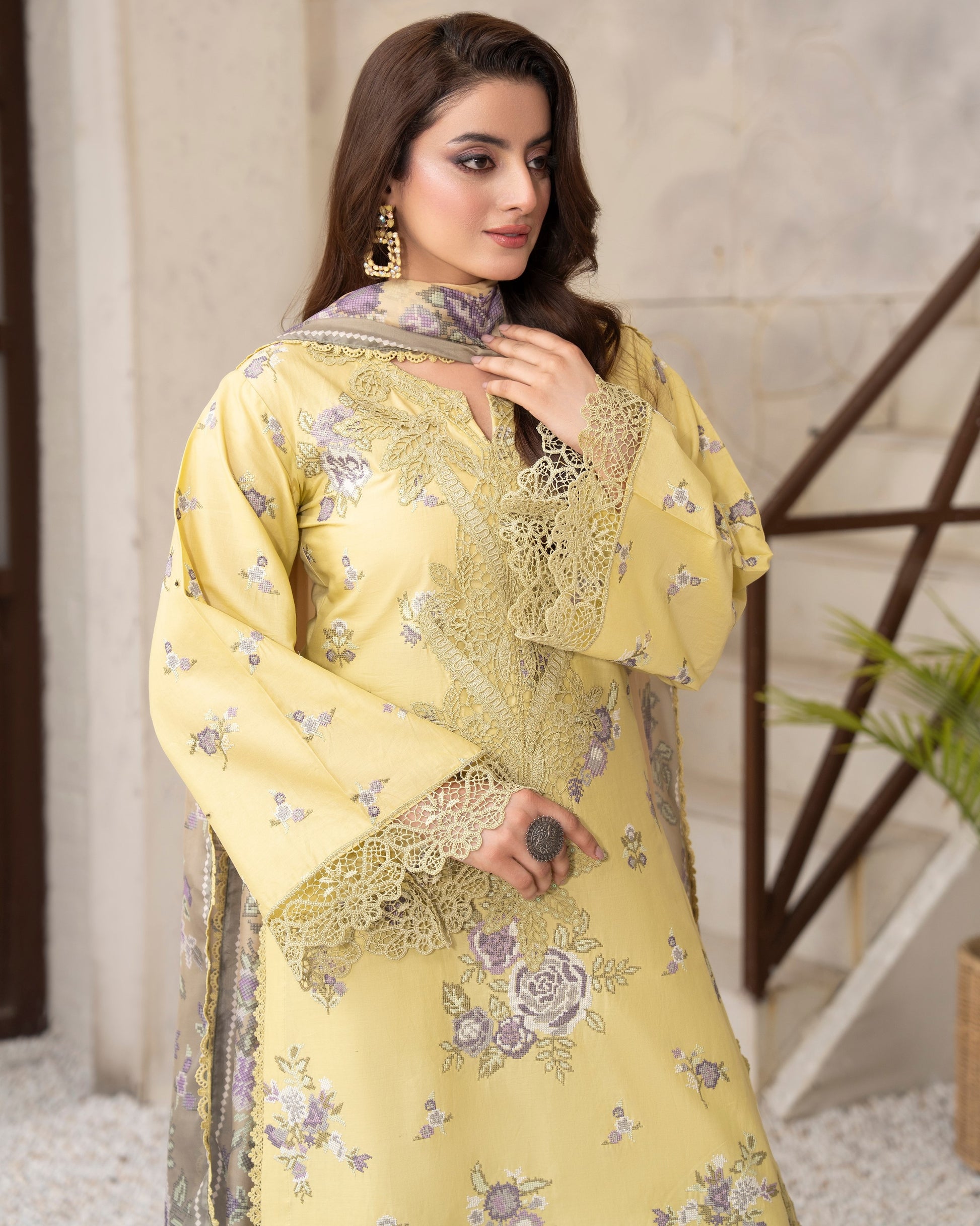 Get ready to turn heads in this 3PC ready-to-wear ensemble! Featuring a beautiful cotton long shirt with cross stitch embroidery and patch work and a cotton loose bottom trouser with cutwork patch, paired with a stunning printed dupatta with all around lace, this ensemble is perfect for any occasion. Stand out from the crowd in this exquisitely detailed design.