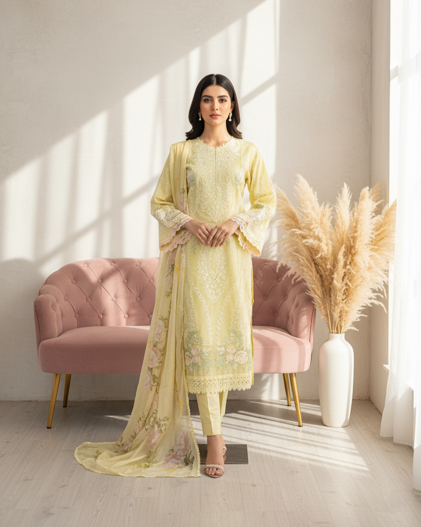 An organza shirt beautifully enhanced with delicate laser cutting and pearls, giving it a refined and chic appeal. Paired with plain grip trousers for a sleek finish and a digitally printed dupatta with lace that adds a stylish flair—perfect for an elegant statement.