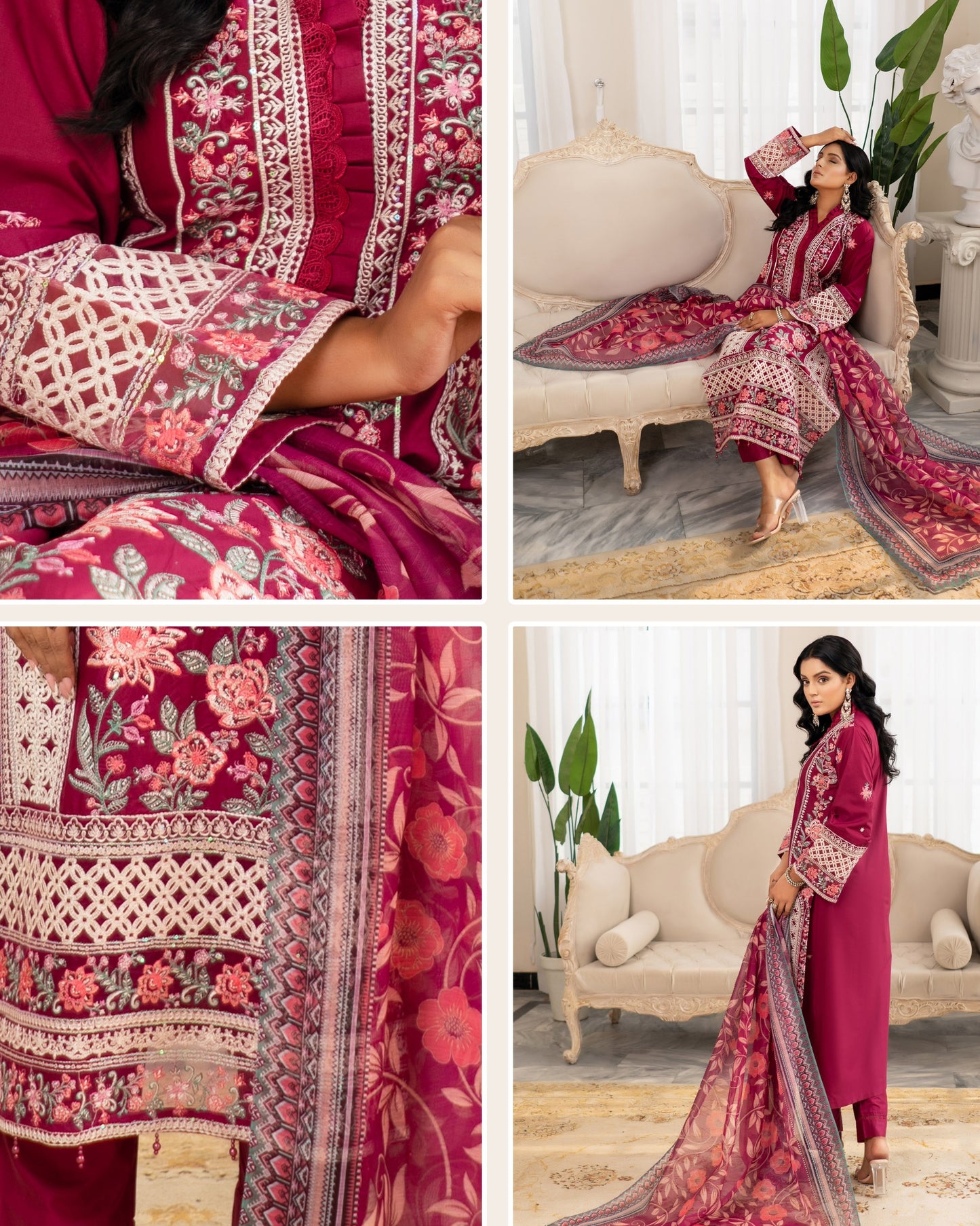 Design Details: Front-heavy embroidery with patchwork, sequins, chikankari