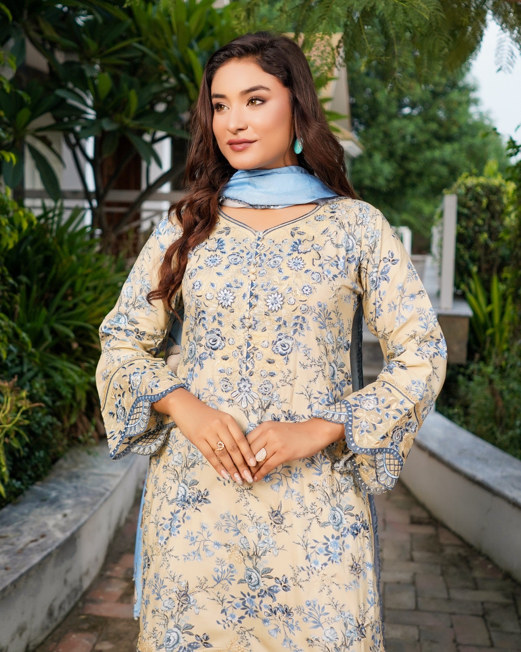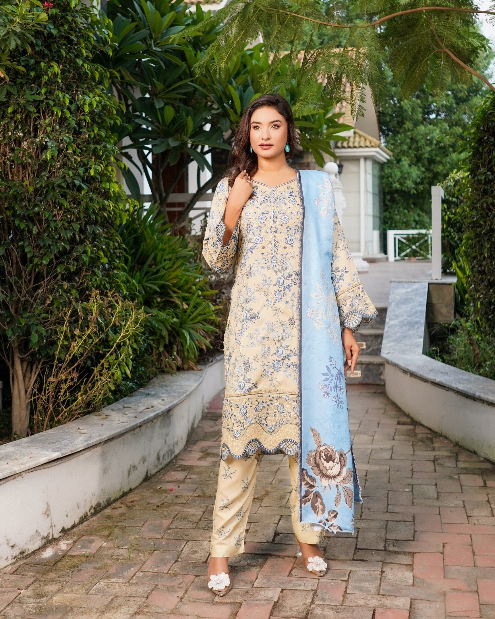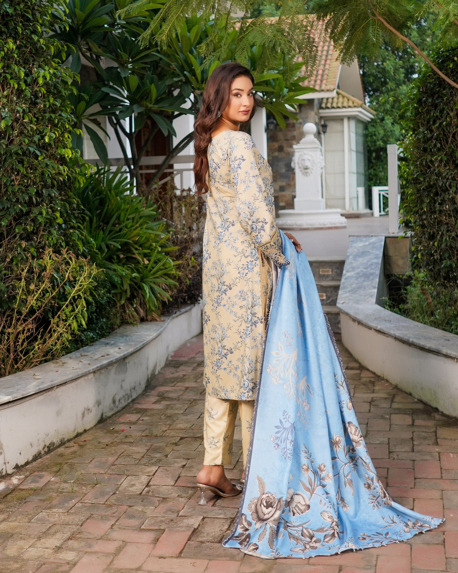 Elevate your winter wardrobe with the Munira Printed Collection. Designed in linen fabric, this outfit features refined print details with matchwork embroidery for a chic yet traditional touch. Paired with a soft pashmina shawl for added warmth and linen trousers for a seamless finish, this 3PC set blends style and comfort effortlessly—perfect for casual and festive gatherings.