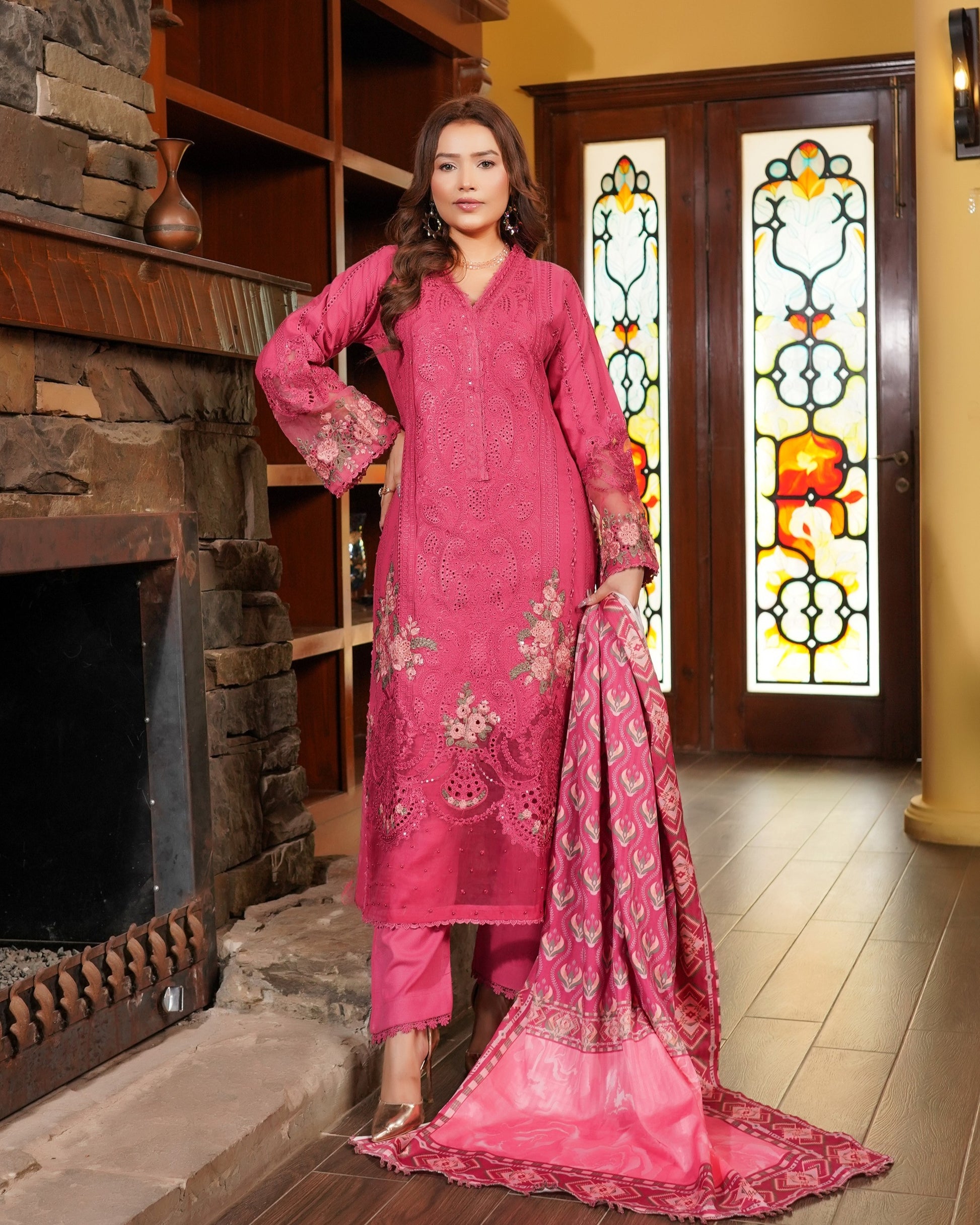 Step into timeless elegance with the Munira Luxury 3PC Dhanak Collection. Crafted from premium embroidered dhanak fabric, this ensemble is elevated with thick embroidery, sequin accents, and chikankari border work that bring a rich, luxurious vibe. Paired with a pashmina shawl for warmth and elegance, and dhanak trousers finished with lace work, this outfit blends comfort with sophistication—perfect for winter festivities.
