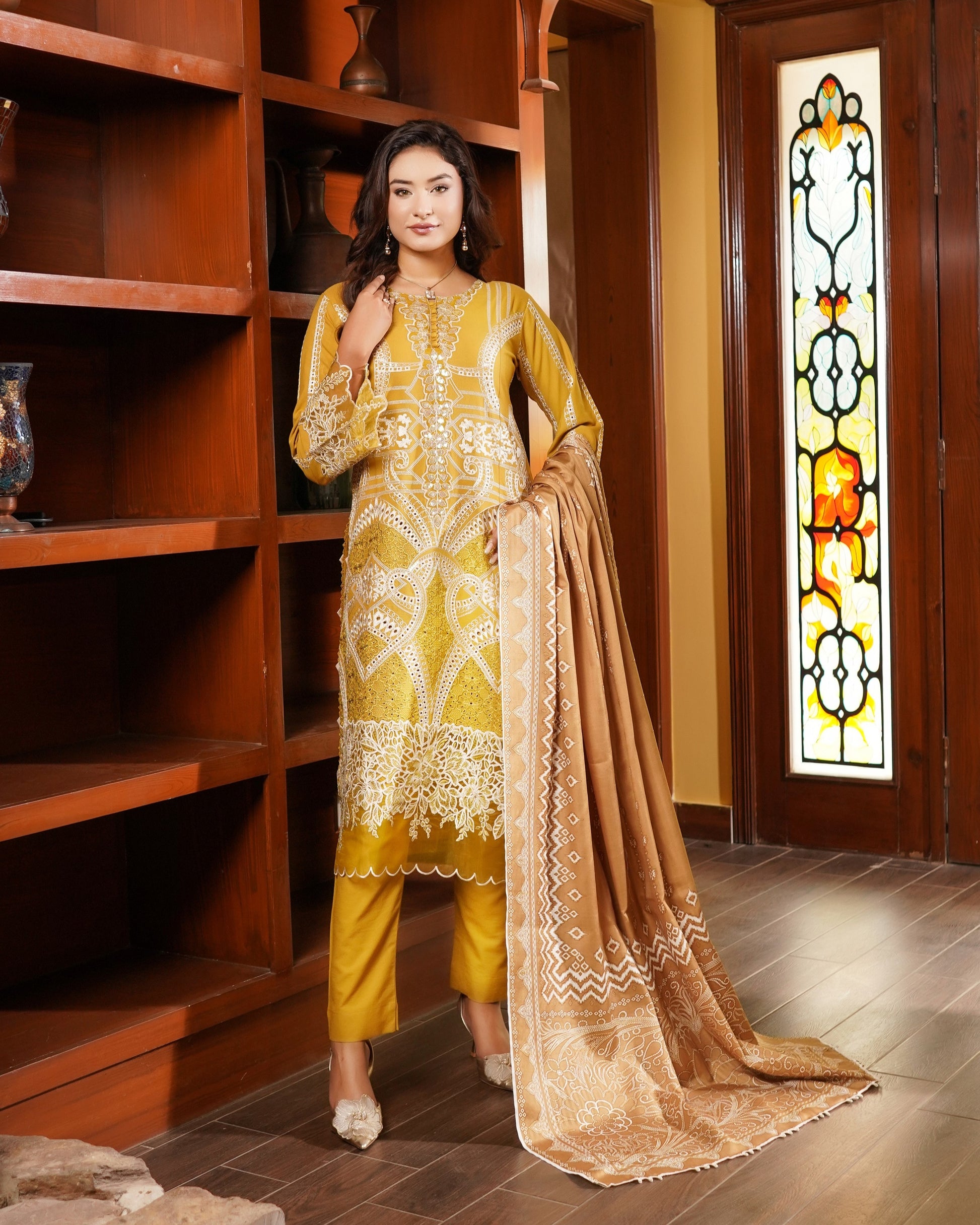 Step into timeless elegance with the Munira Luxury 3PC Dhanak Collection. Crafted from premium embroidered dhanak fabric, this ensemble is elevated with thick embroidery, sequin accents, and chikankari border work that bring a rich, luxurious vibe. Paired with a pashmina shawl for warmth and elegance, and dhanak trousers finished with lace work, this outfit blends comfort with sophistication—perfect for winter festivities.
