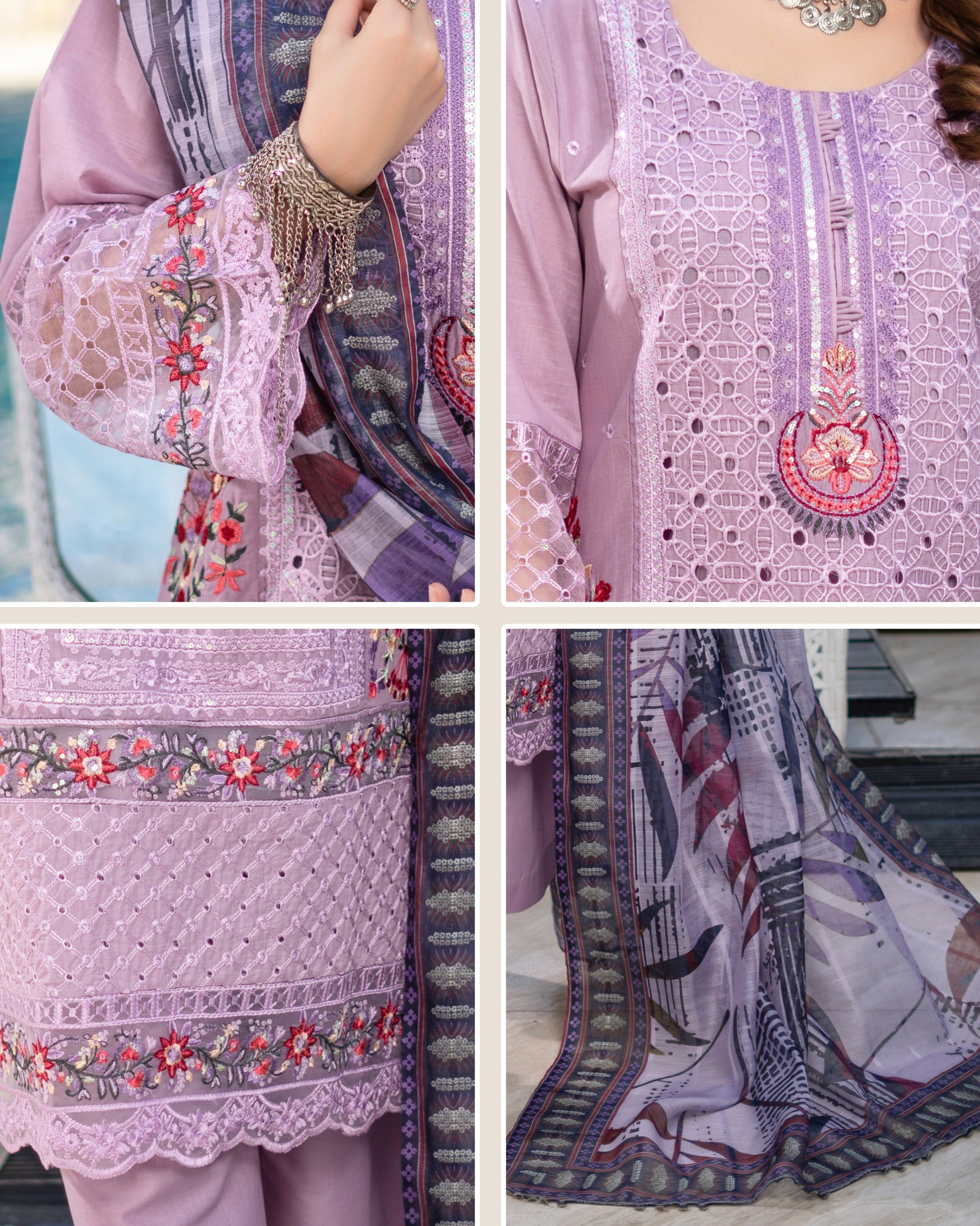 Introducing the Munira 7 Scrolling Cotton collection – a 3-piece luxury cotton outfit adorned with intricate embroidery and detailed patchwork that speaks of timeless elegance. Paired with a stunning floral diamond-patterned dupatta, this ensemble is designed to bring out the best in your festive and formal looks. The breathable cotton fabric ensures comfort, while the luxurious detailing elevates your overall style effortlessly.