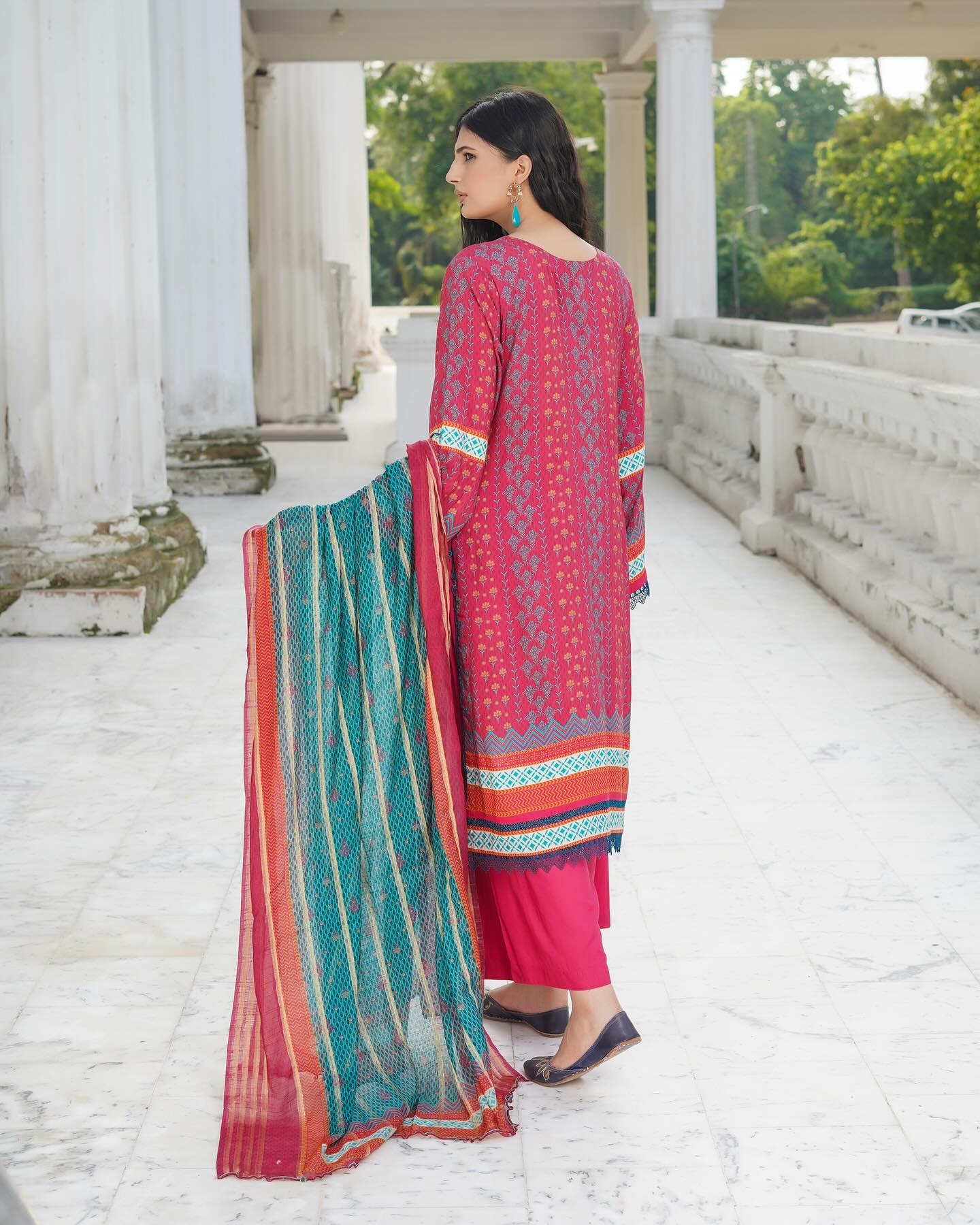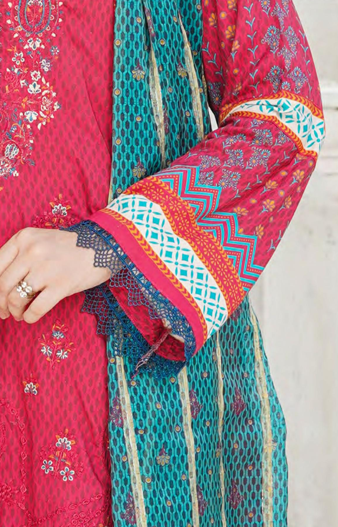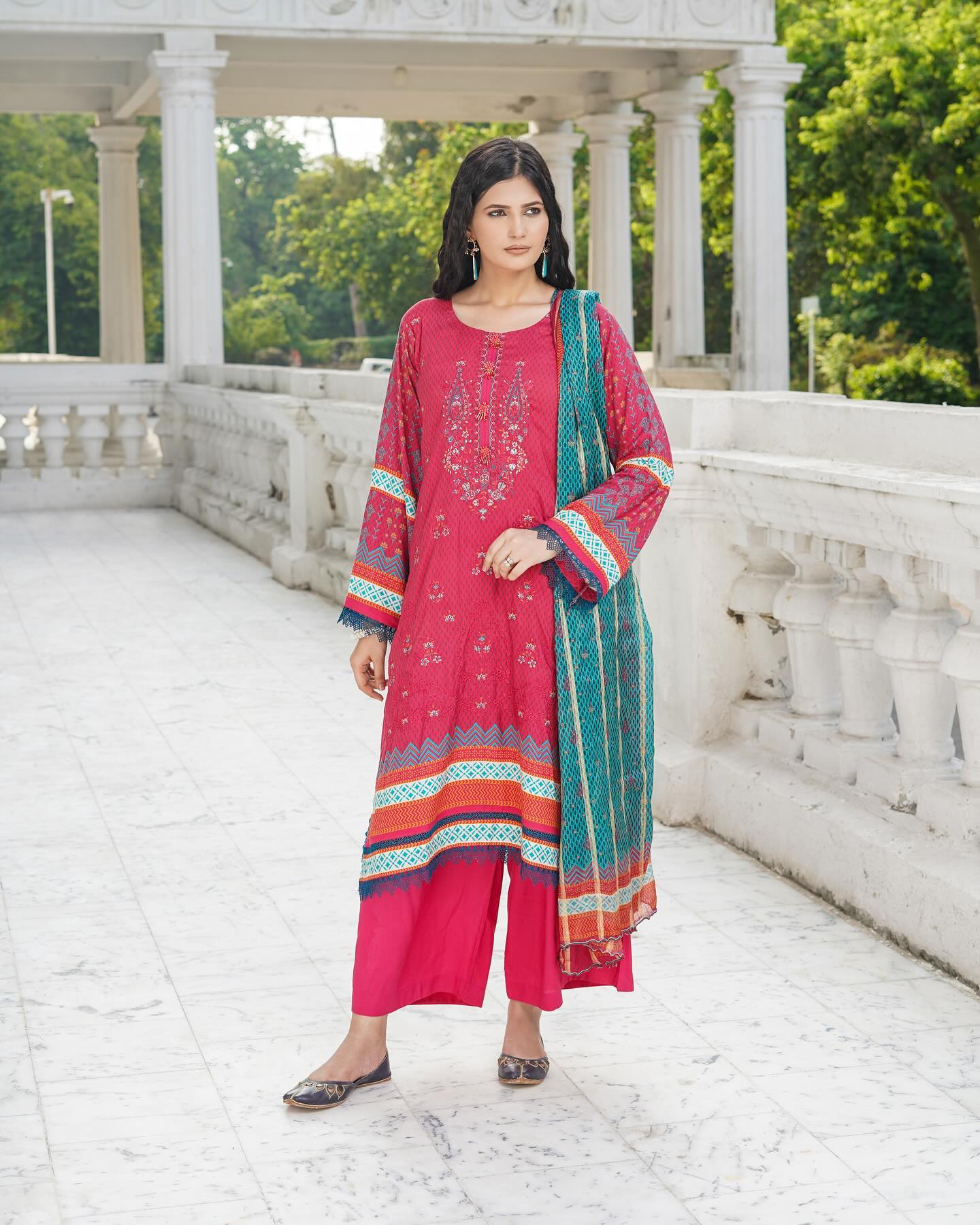 Enhance your wardrobe with Munira's August Embroidery Linen. The 3PC READY TO WEAR set includes an embroidered linen shirt, a diamond printed dupatta, and a linen flapper. With this set, you'll have elegant and comfortable options for any occasion.