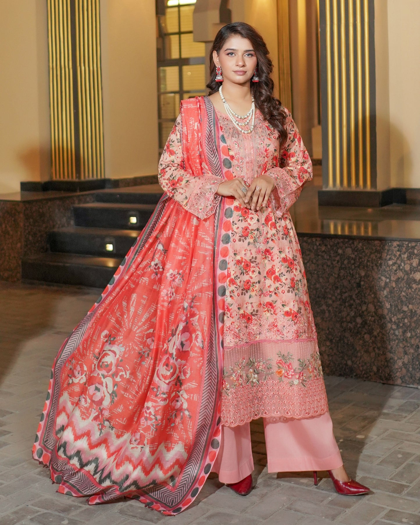 From the Printed Patch Work Luxury Collection, this 3PC ready-to-wear outfit features a long lawn shirt with vibrant prints, intricate patchwork, and tasteful embellishments that bring effortless elegance to your look. Styled with a flowing diamond dupatta and cotton flapper trousers with an elasticized waistband, this outfit blends classic charm with modern comfort.