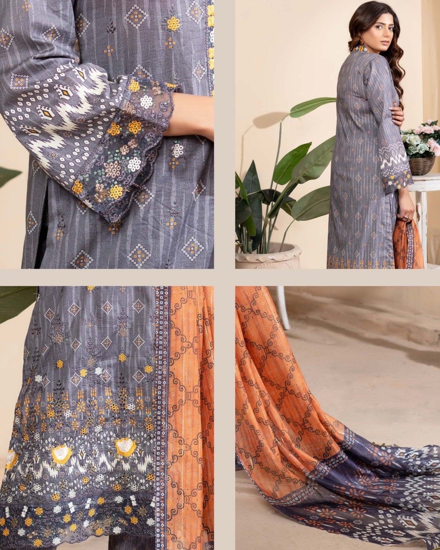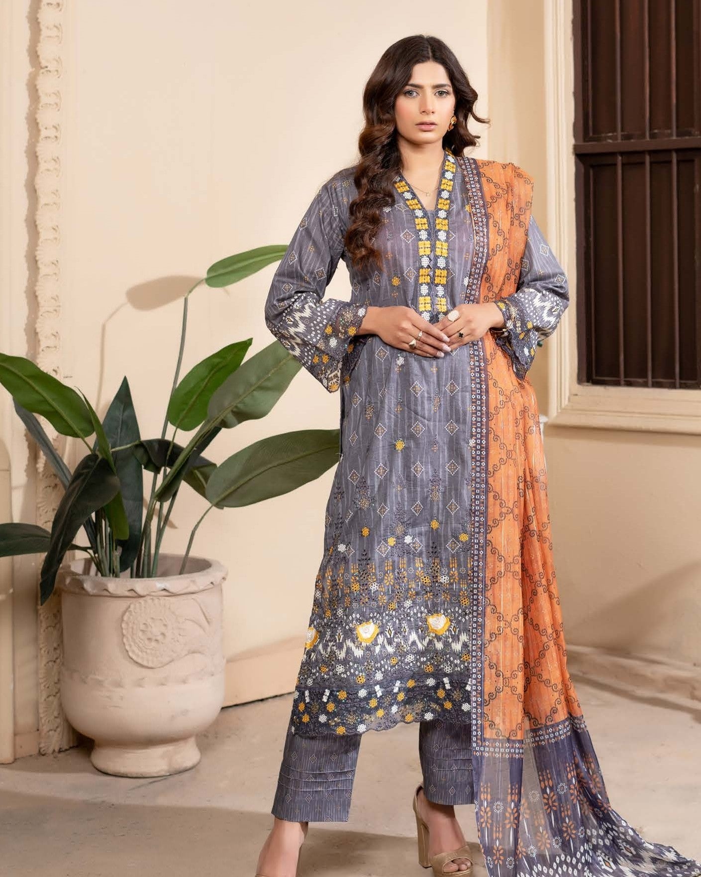 Complete your summer look with Munira Eid Lawn. This 3-piece ready-to-wear outfit includes a stylish shirt, diamond dupatta, and comfortable cotton trouser. Made with high-quality lawn fabric and adorned with chicken work, thread, sequence, and patch for a chic touch. Available in small and medium with trouser, and large and extra-large with shalwar for a perfect fit.