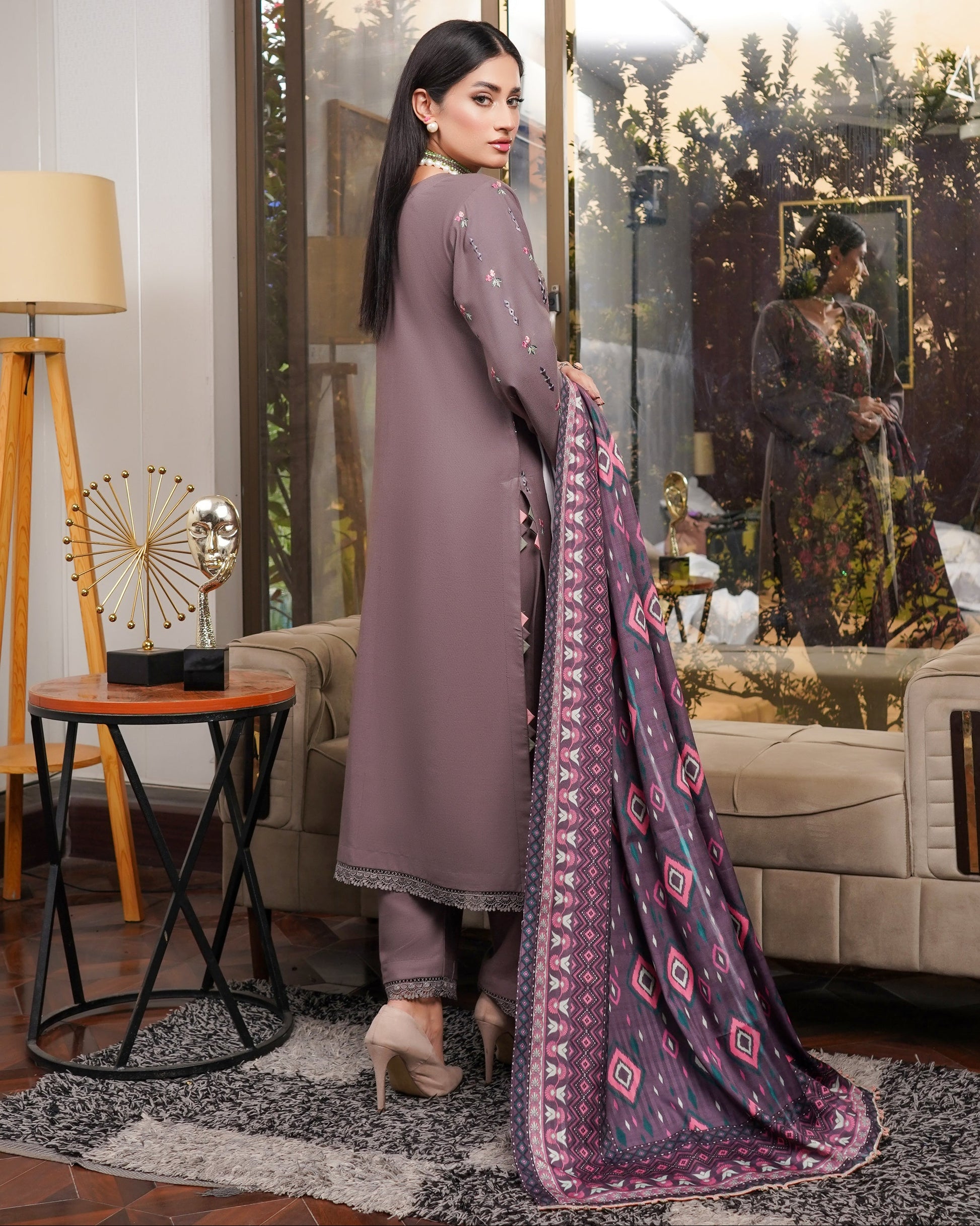 A stunning Dhanak ensemble featuring elegant patch and boring work on the neckline, sleeves, and border for a refined traditional touch. Paired with matching trousers for a cohesive look, while the printed wool shawl adds warmth and a graceful finish — perfect for winter elegance.