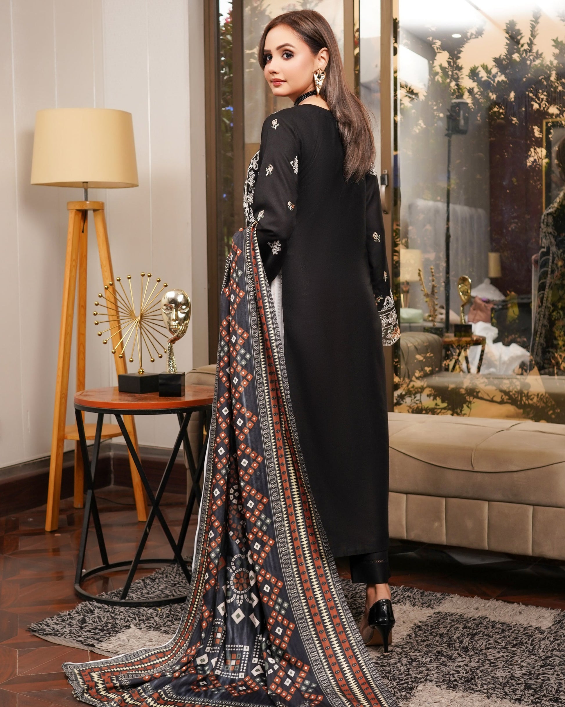 A stunning Dhanak ensemble featuring elegant patch and boring work on the neckline, sleeves, and border for a refined traditional touch. Paired with matching trousers for a cohesive look, while the printed wool shawl adds warmth and a graceful finish — perfect for winter elegance.