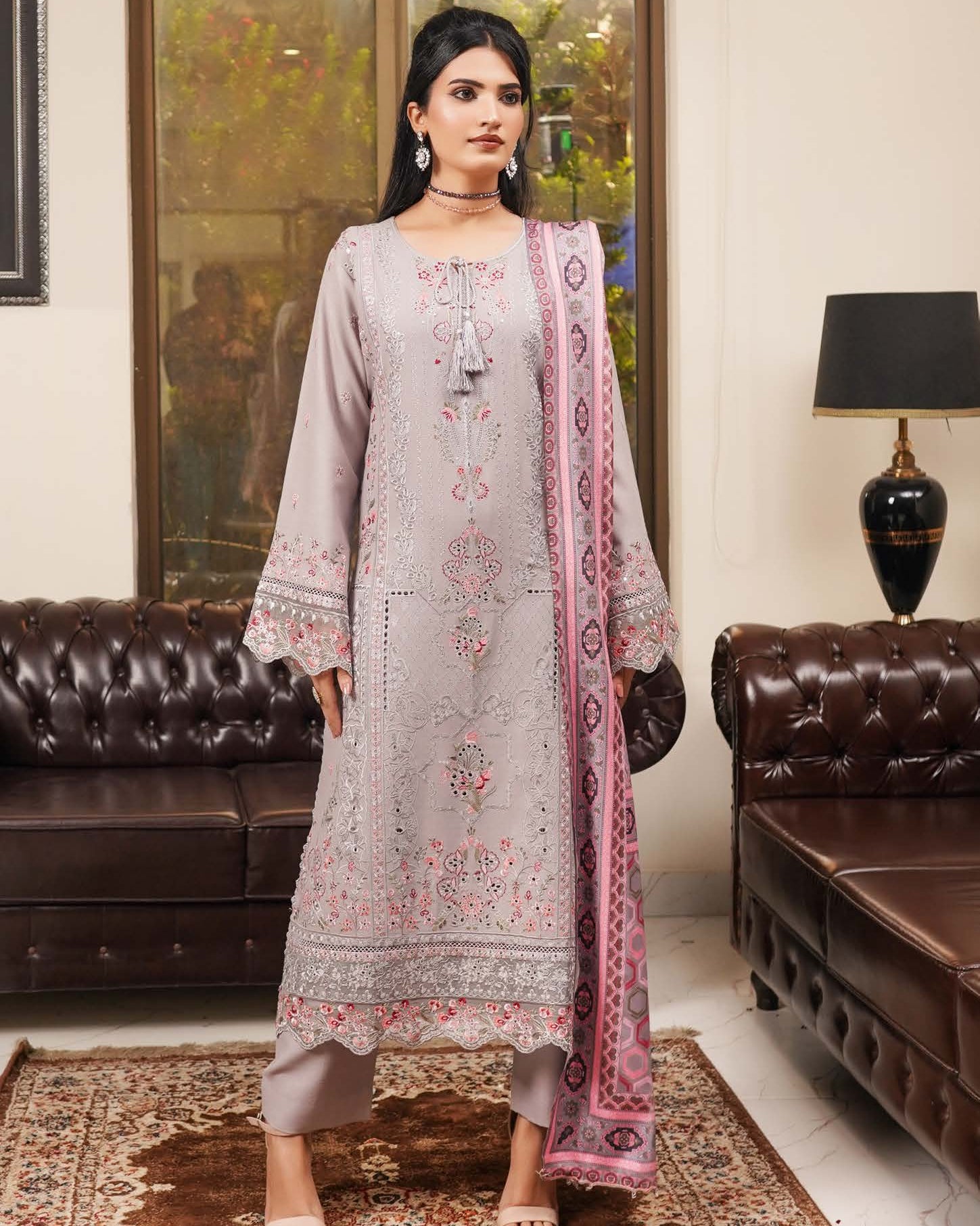 A stunning Dhanak ensemble featuring elegant patch and boring work on the neckline, sleeves, and border for a refined traditional touch. Paired with matching trousers for a cohesive look, while the printed wool shawl adds warmth and a graceful finish — perfect for winter elegance.
