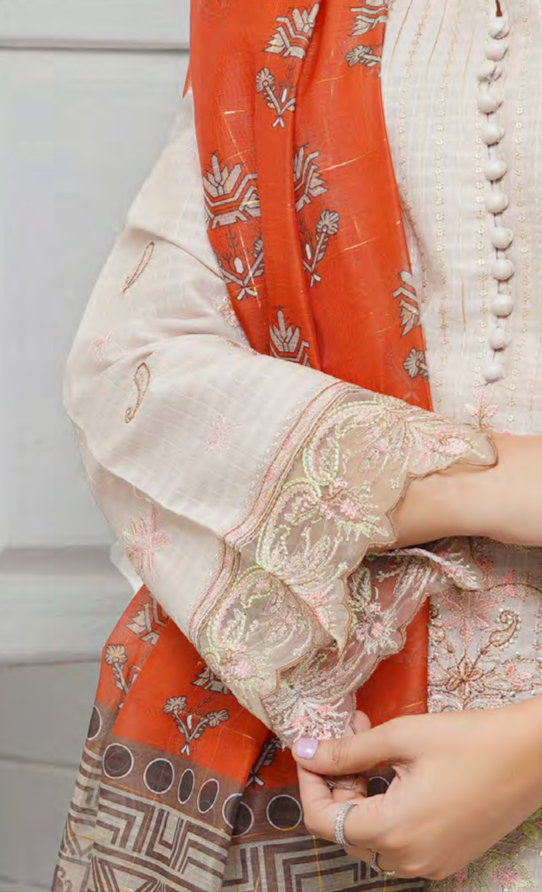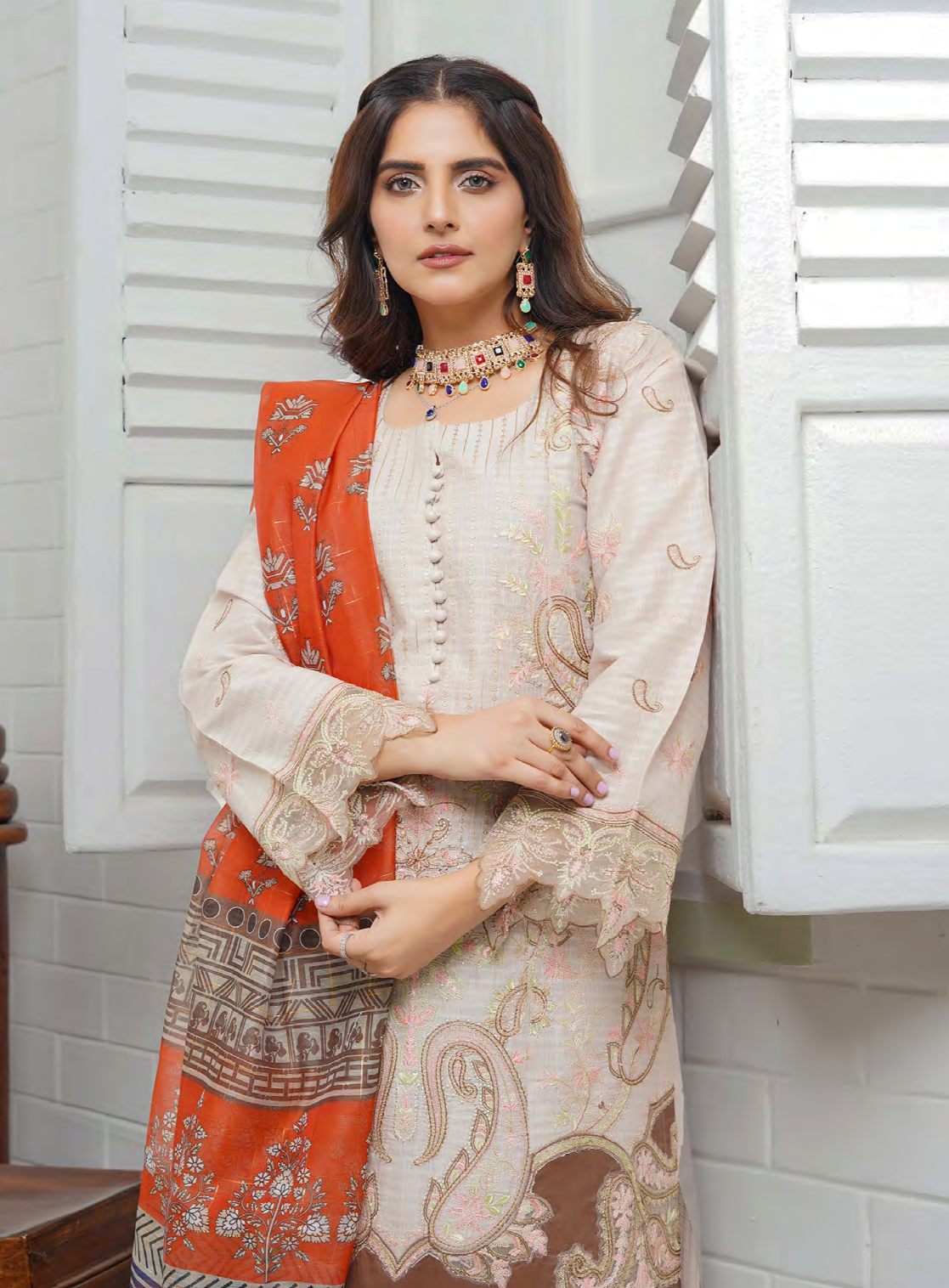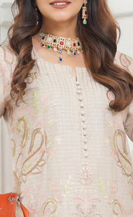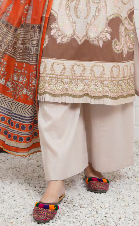 This stunning printed lawn collection features beautiful embroidered details, delicate sequins, and tilla accents. With a flattering lace on chock and elegant ghera, this outfit is perfect for any occasion. Upgrade your wardrobe and confidently stand out in this stylish and inclusive design.