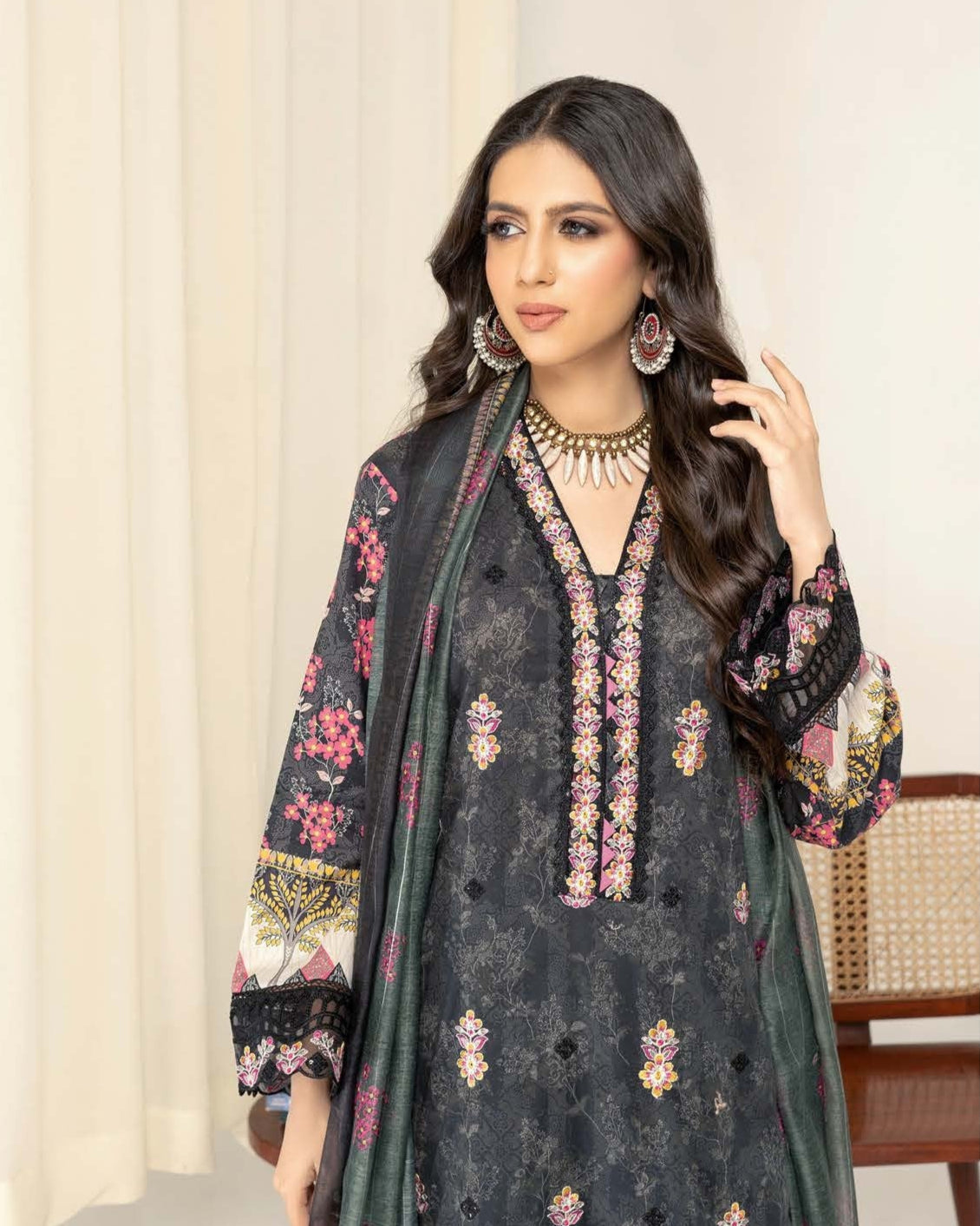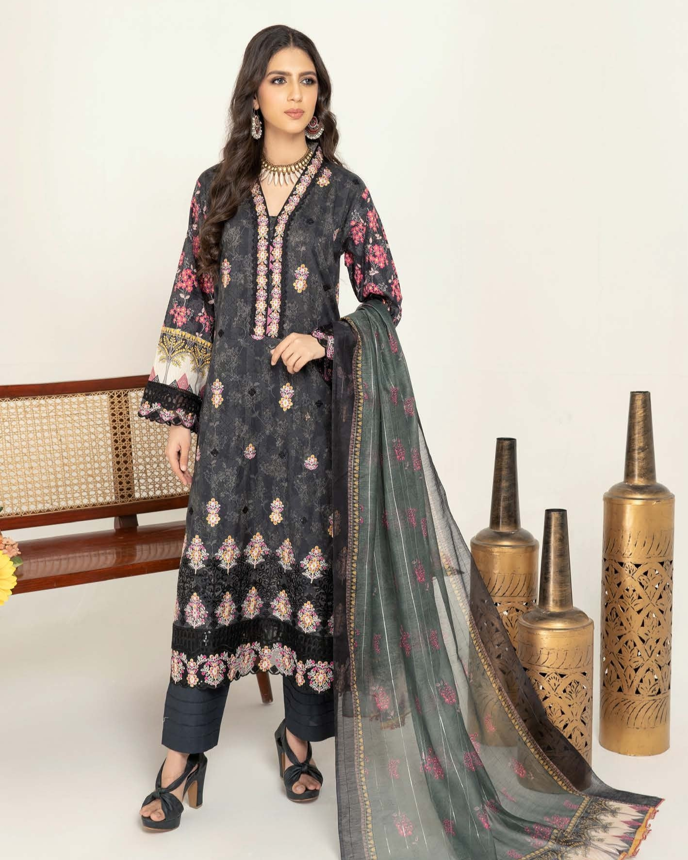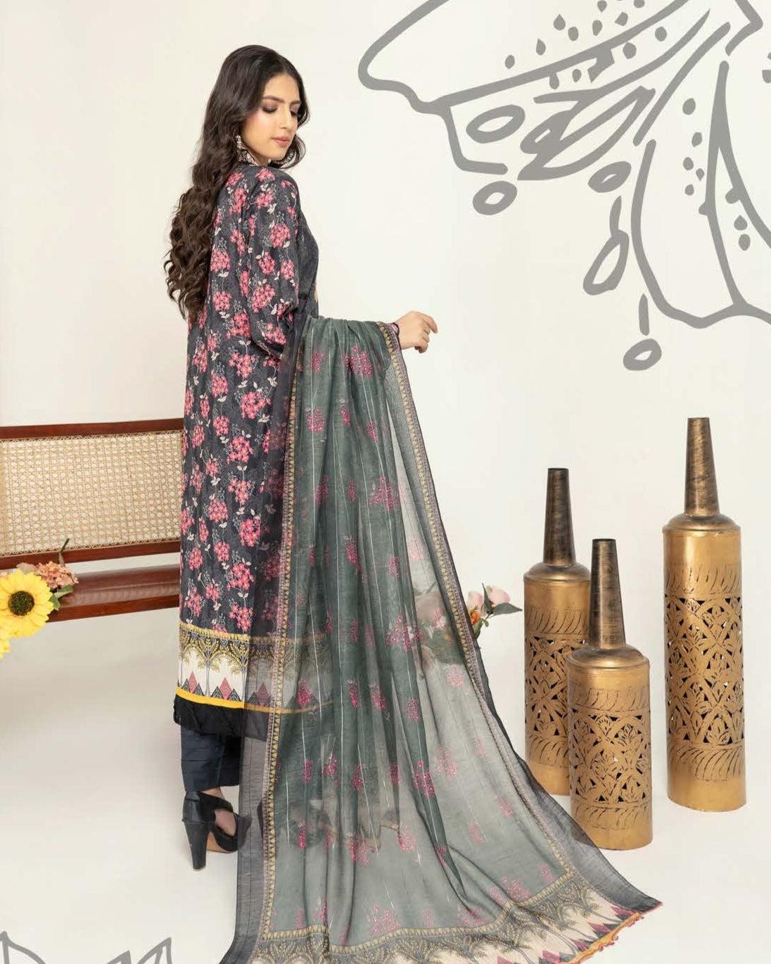 Get ready to slay in this 3PC Munira Mahi Lawn set. Made of high-quality Lawn and Diamond Chiffon, it includes a shirt, dupatta, and trouser. The embroidered patch work adds a touch of elegance to your outfit.