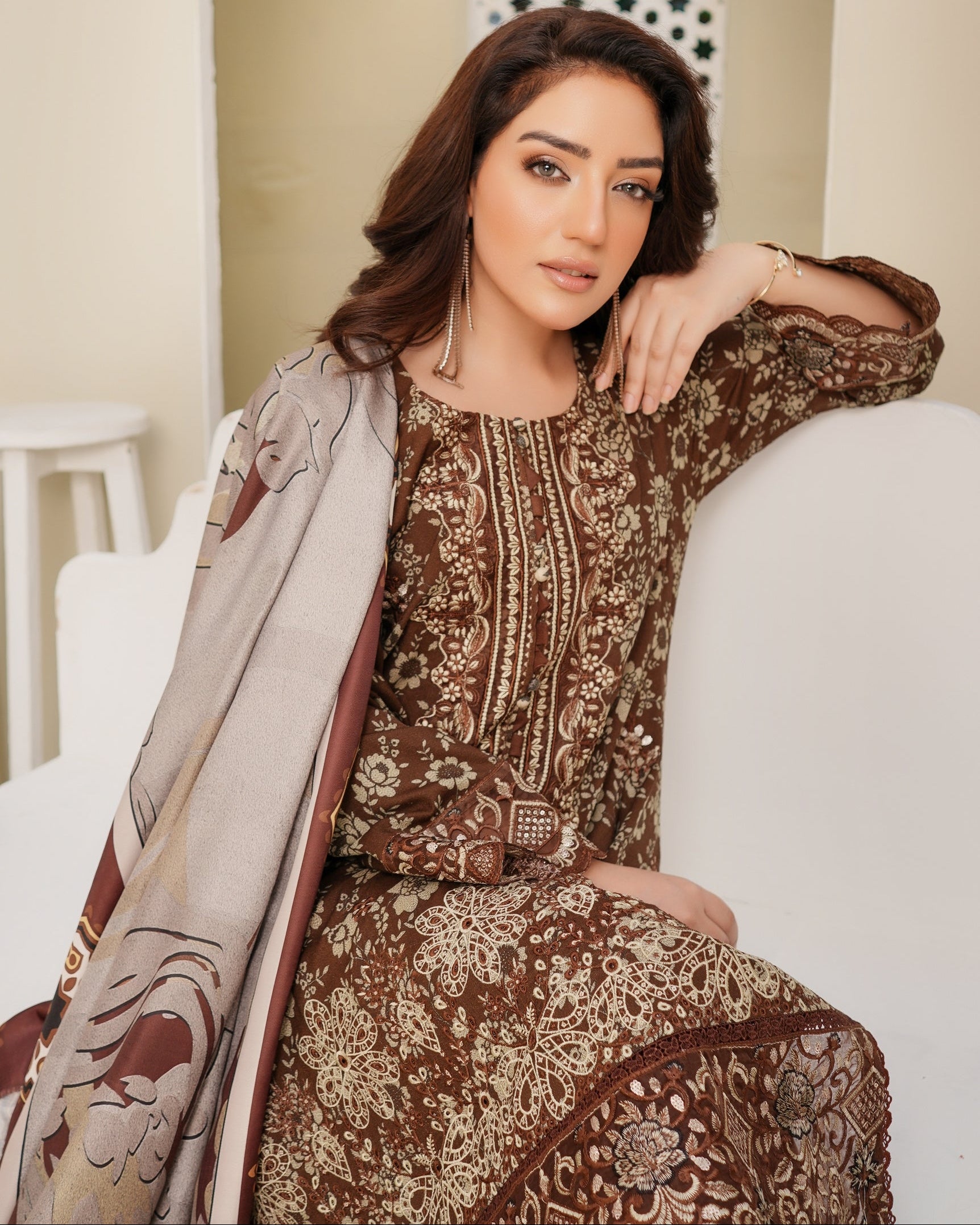 A stunning Dhanak ensemble featuring elegant patch and boring work on the neckline, sleeves, and border for a refined traditional touch. Paired with matching trousers for a cohesive look, while the printed wool shawl adds warmth and a graceful finish — perfect for winter elegance.