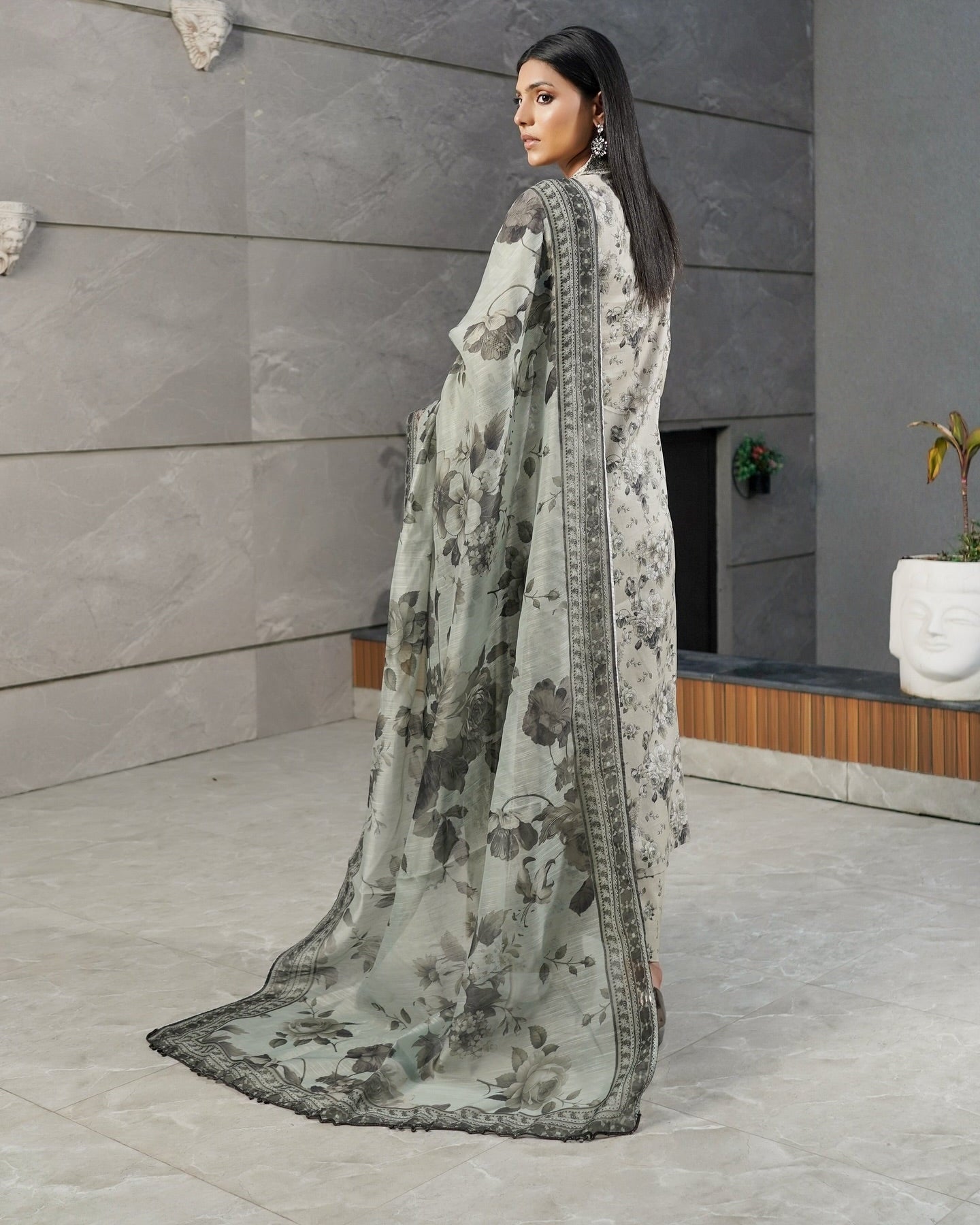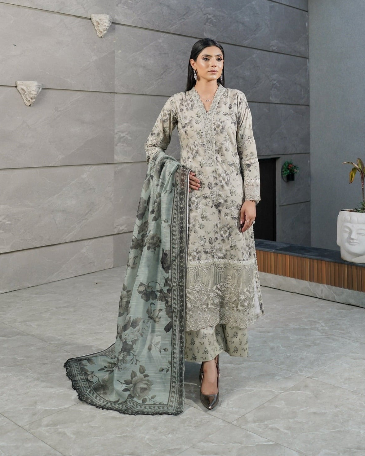 From the Munira Saya Collection, this beautiful 3PC ready-to-wear ensemble features a printed lawn long shirt highlighted with chikankari work, patch details, and rich embroidery for an elegant yet trendy vibe. The look is paired with a diamond dupatta that adds graceful flow, and cotton flapper trousers with an elasticized waistband to complete the style with comfort and flair.