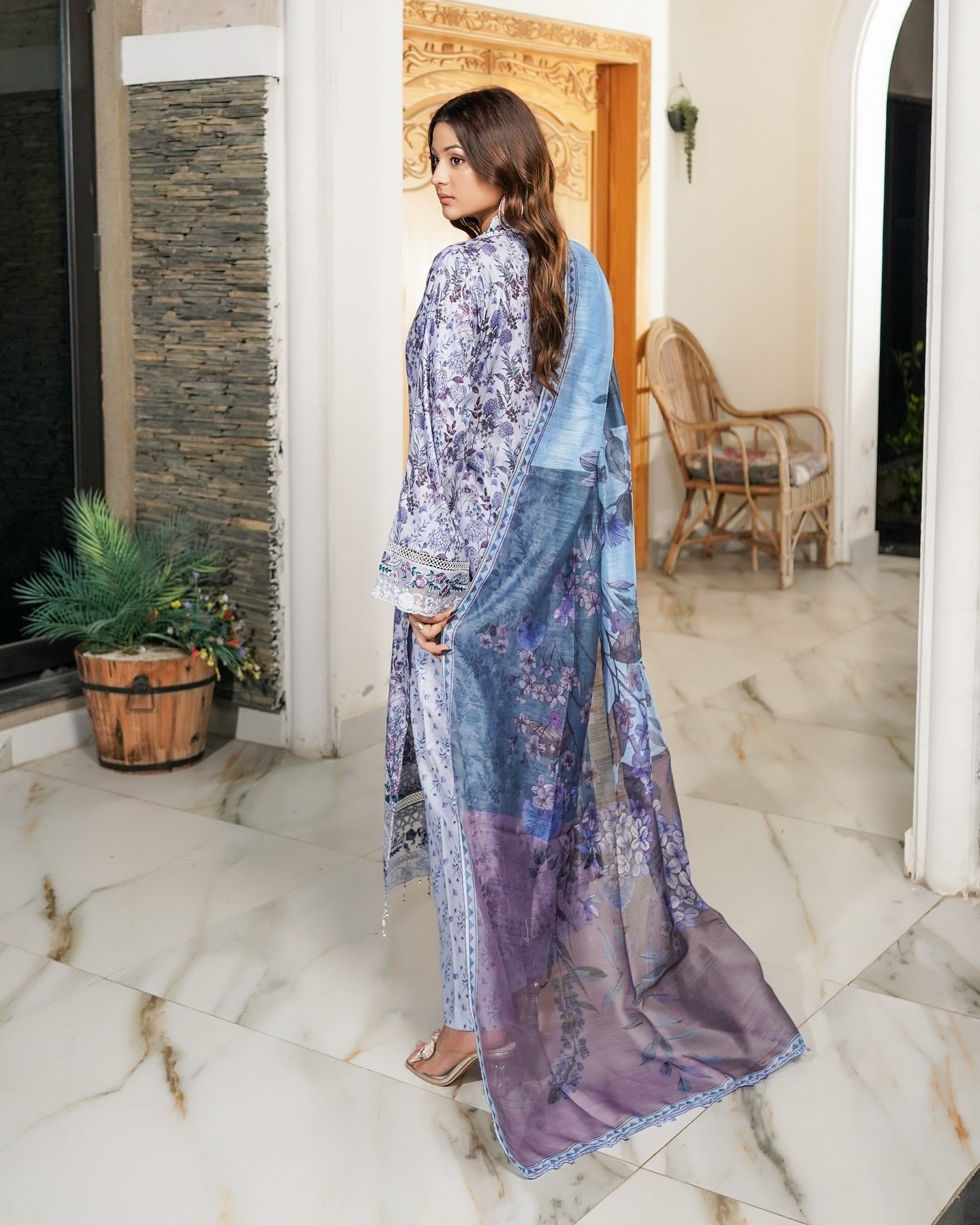 From the Munira Saya Collection, this beautiful 3PC ready-to-wear ensemble features a printed lawn long shirt highlighted with chikankari work, patch details, and rich embroidery for an elegant yet trendy vibe. The look is paired with a diamond dupatta that adds graceful flow, and cotton flapper trousers with an elasticized waistband to complete the style with comfort and flair.