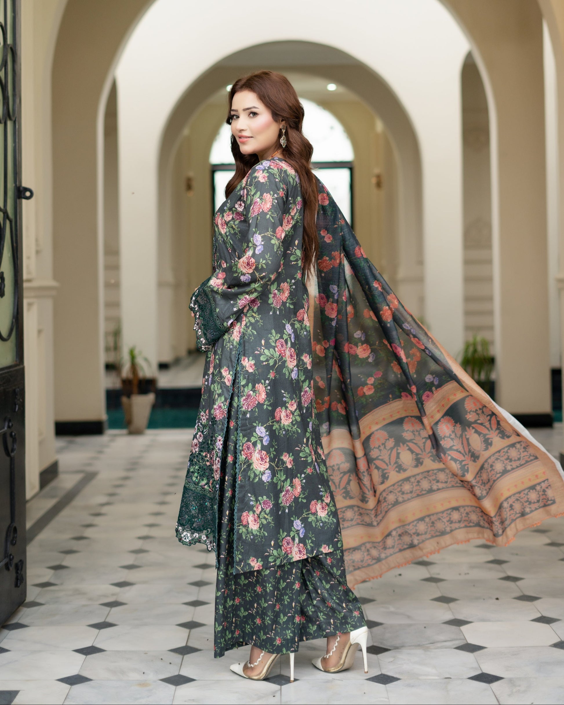 Discover the perfect look. Its intriguing details make it a must-have for any wardrobe. Designed for comfort and style, you'll feel confident and fashionable every time you wear it. Upgrade your look today with this outfit. This 3PC printed collection features a lawn shirt designed for breathable comfort, paired with a diamond fabric dupatta that adds a soft, elegant drape, and cotton flapper trousers for a modern, relaxed silhouette—perfect for everyday charm with a touch of class.