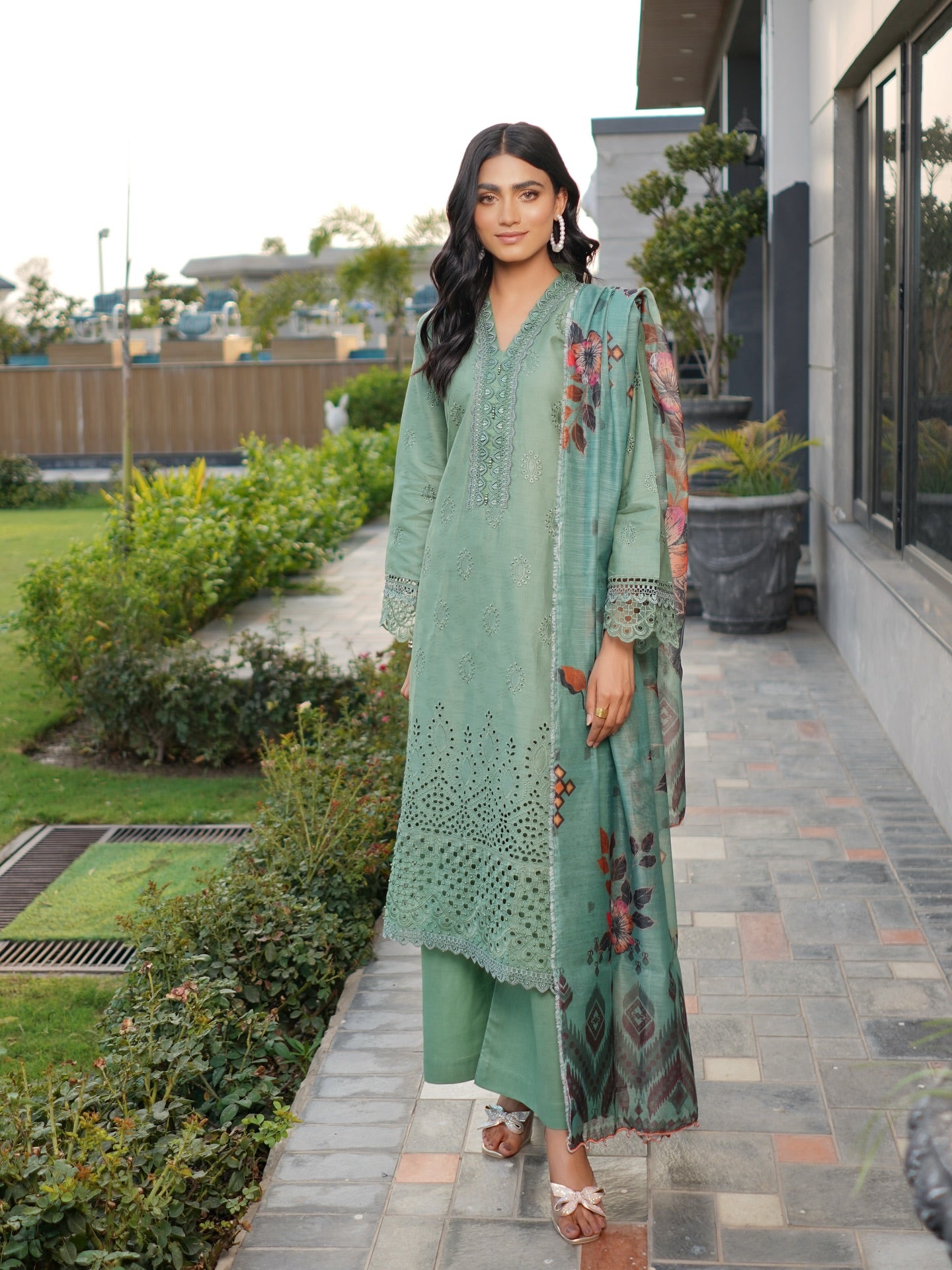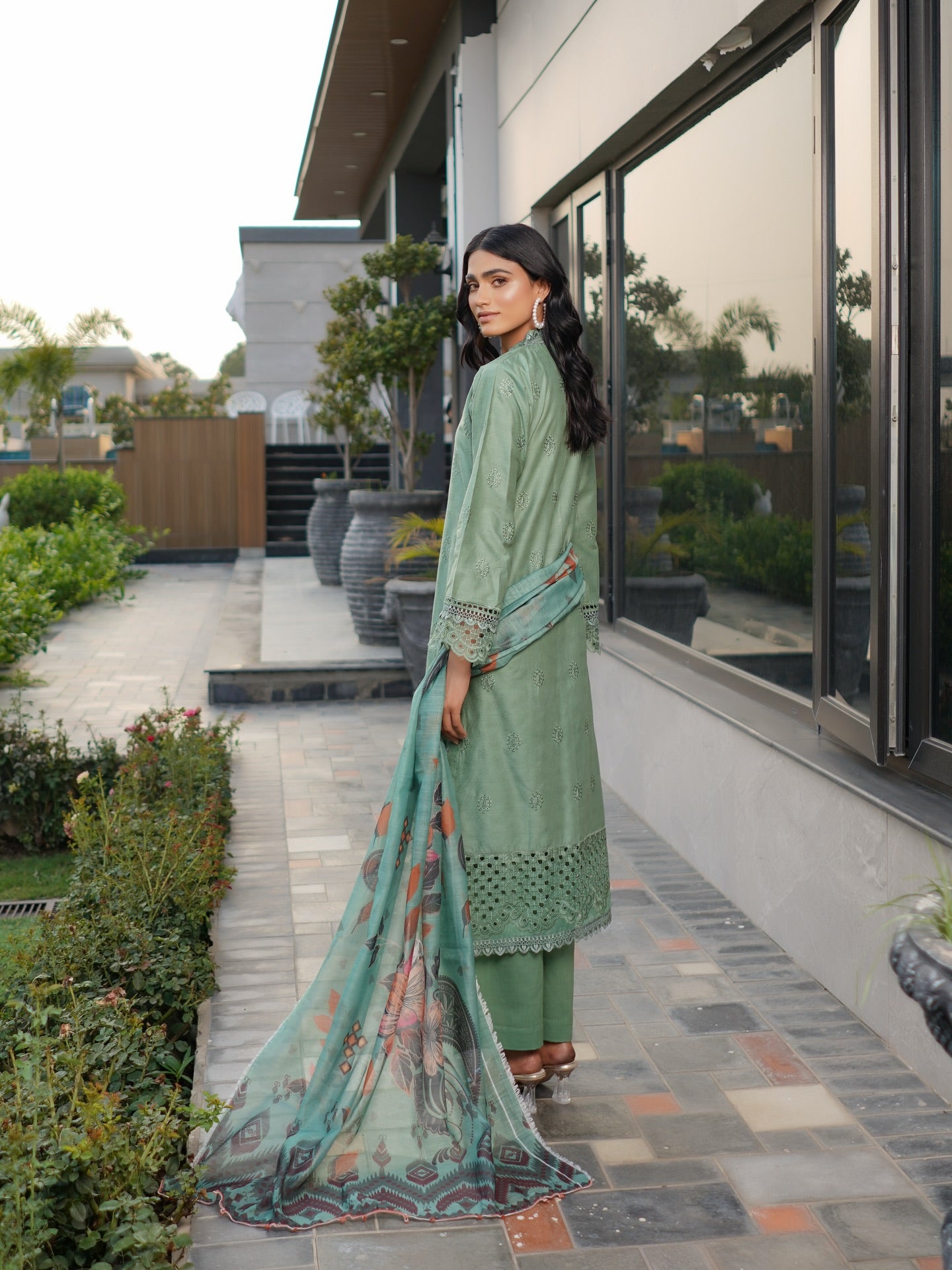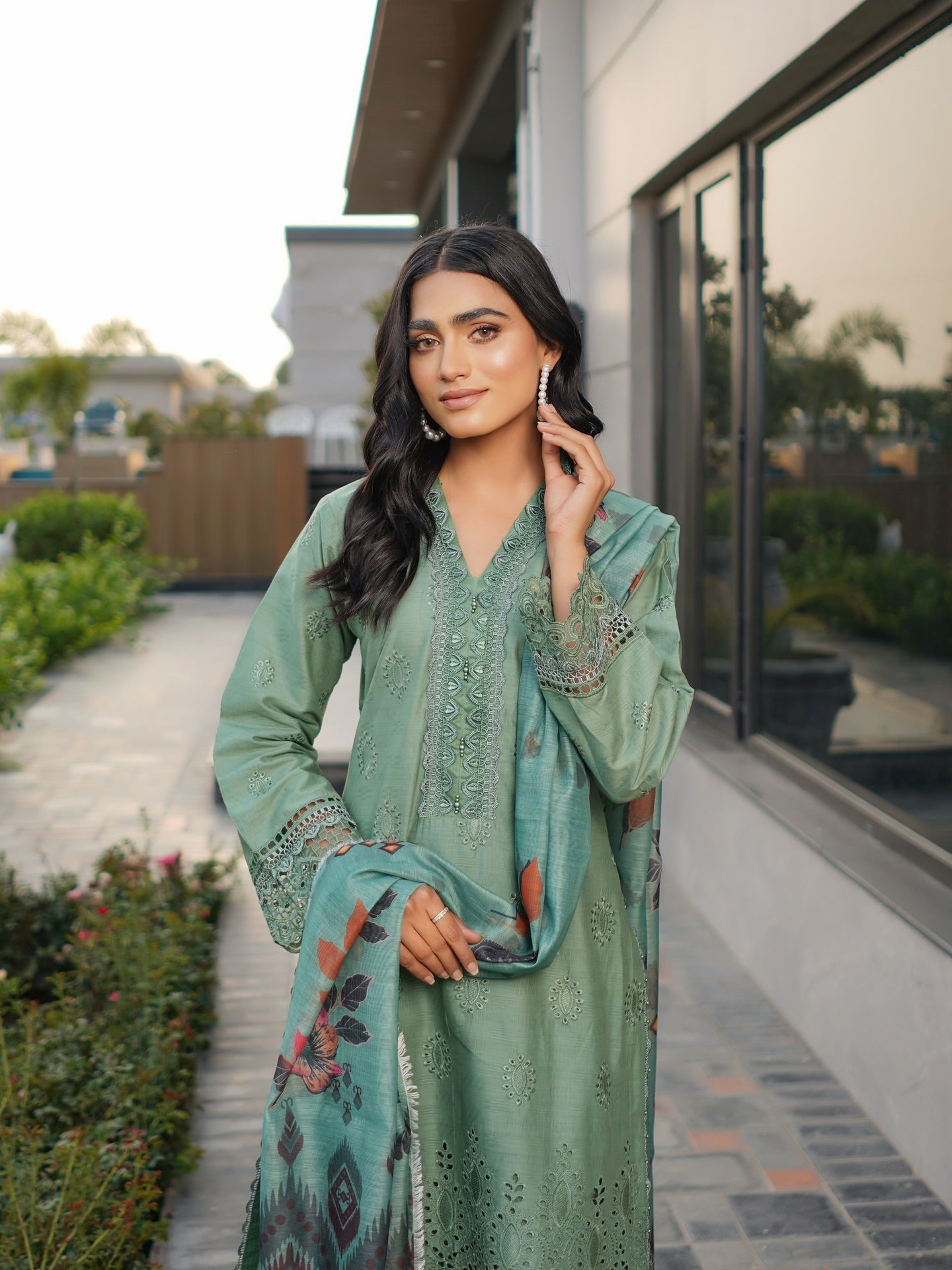 From Munira’s Saya Collection, this elegant 3PC ready-to-wear outfit features a long cotton shirt adorned with chikankari work, patch detailing, and rich embroidery — giving a sophisticated yet effortless charm. The soft diamond cotton dupatta pairs beautifully with the look, while the cotton trousers with an elasticized waistband complete the set in refined simplicity.